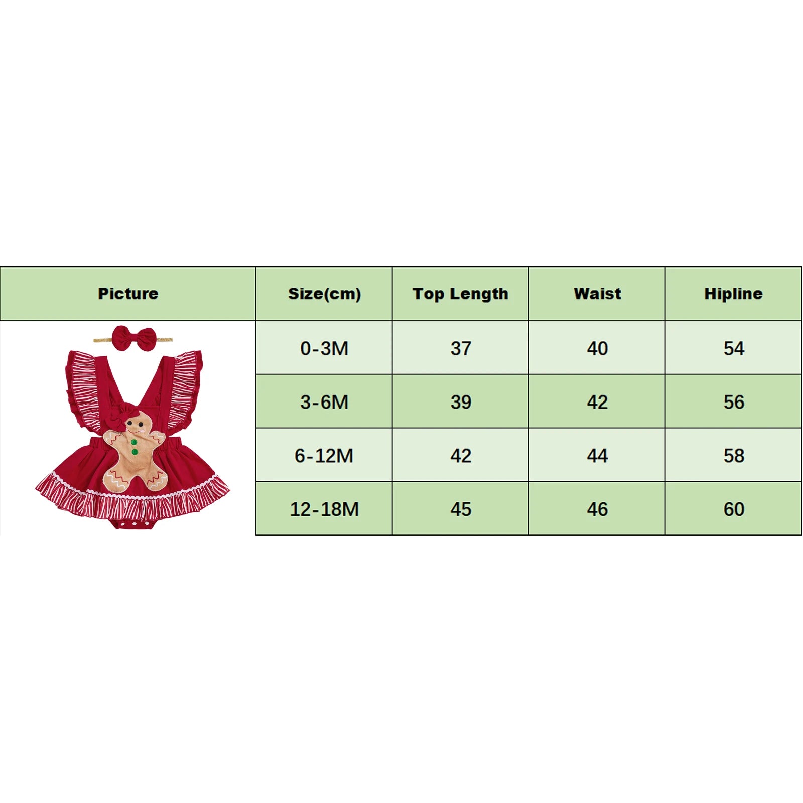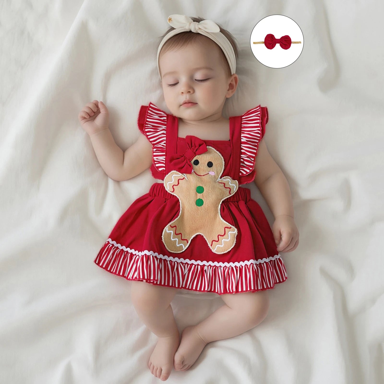 Celebrate the festive season with this adorable Christmas romper dress for baby girls aged 0-18 months. Featuring a cute gingerbread man design, charming flying sleeves, and a matching bow headband, this delightful outfit is perfect for holiday celebrations and creating precious Christmas memories.