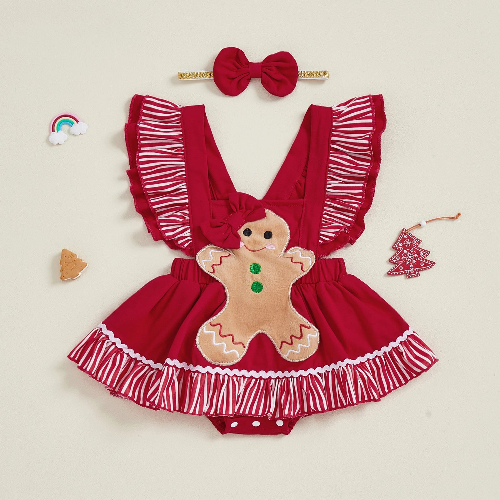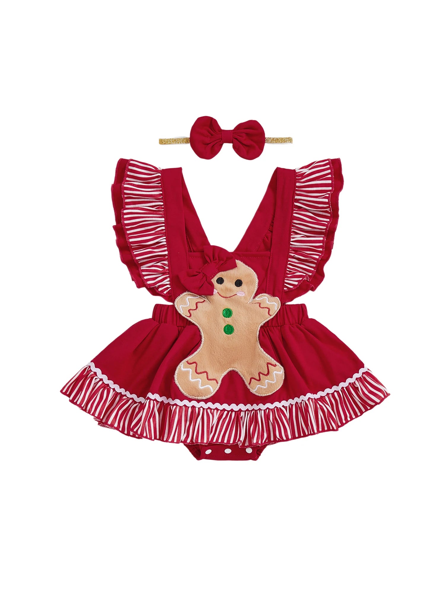 Baby Girls Christmas Romper Dress - Gingerbread Man Flying Sleeve Jumpsuit with Bow Headband (0-18M)