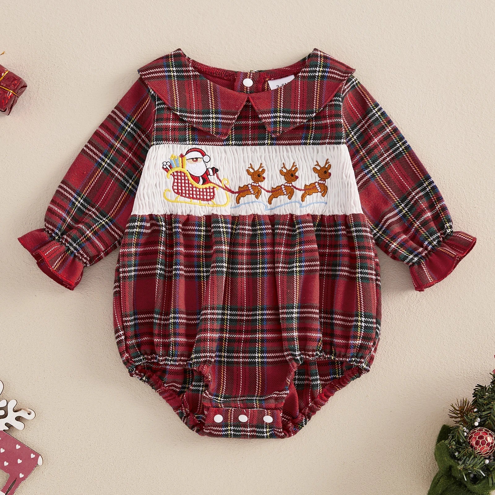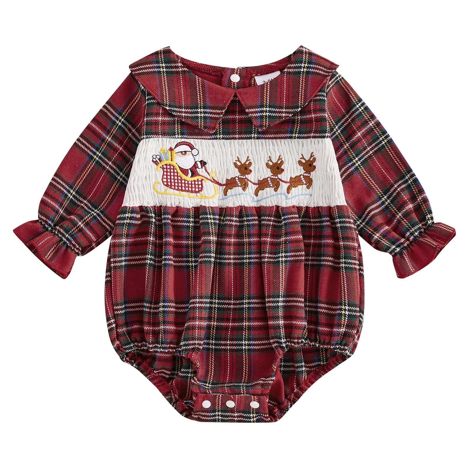 Dress your little girl in festive elegance with this charming Christmas romper featuring a classic Peter Pan collar and beautiful Santa Claus embroidery on plaid fabric. Perfect for autumn and winter celebrations.