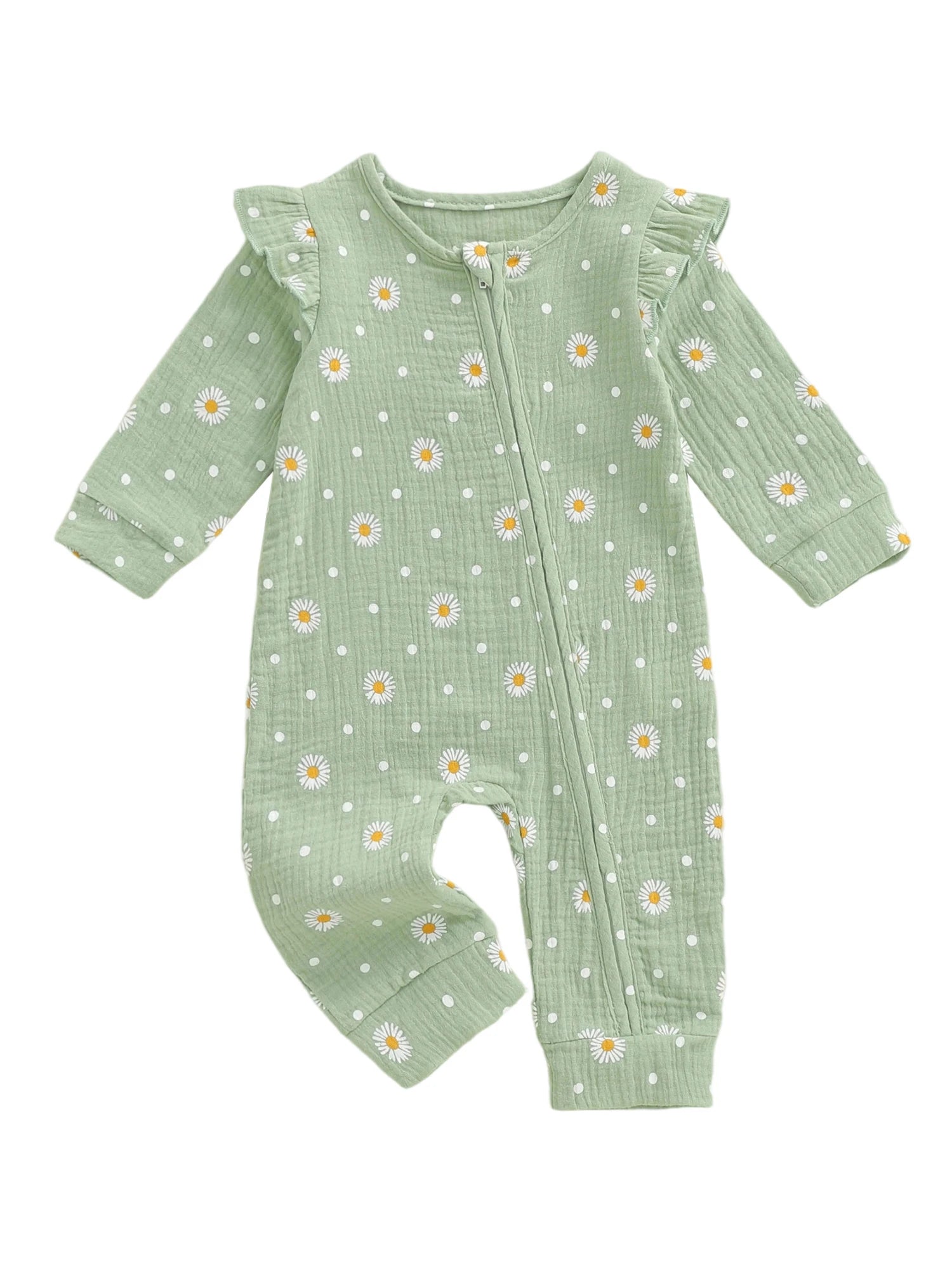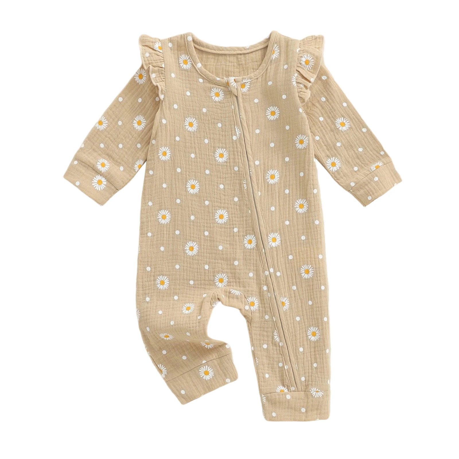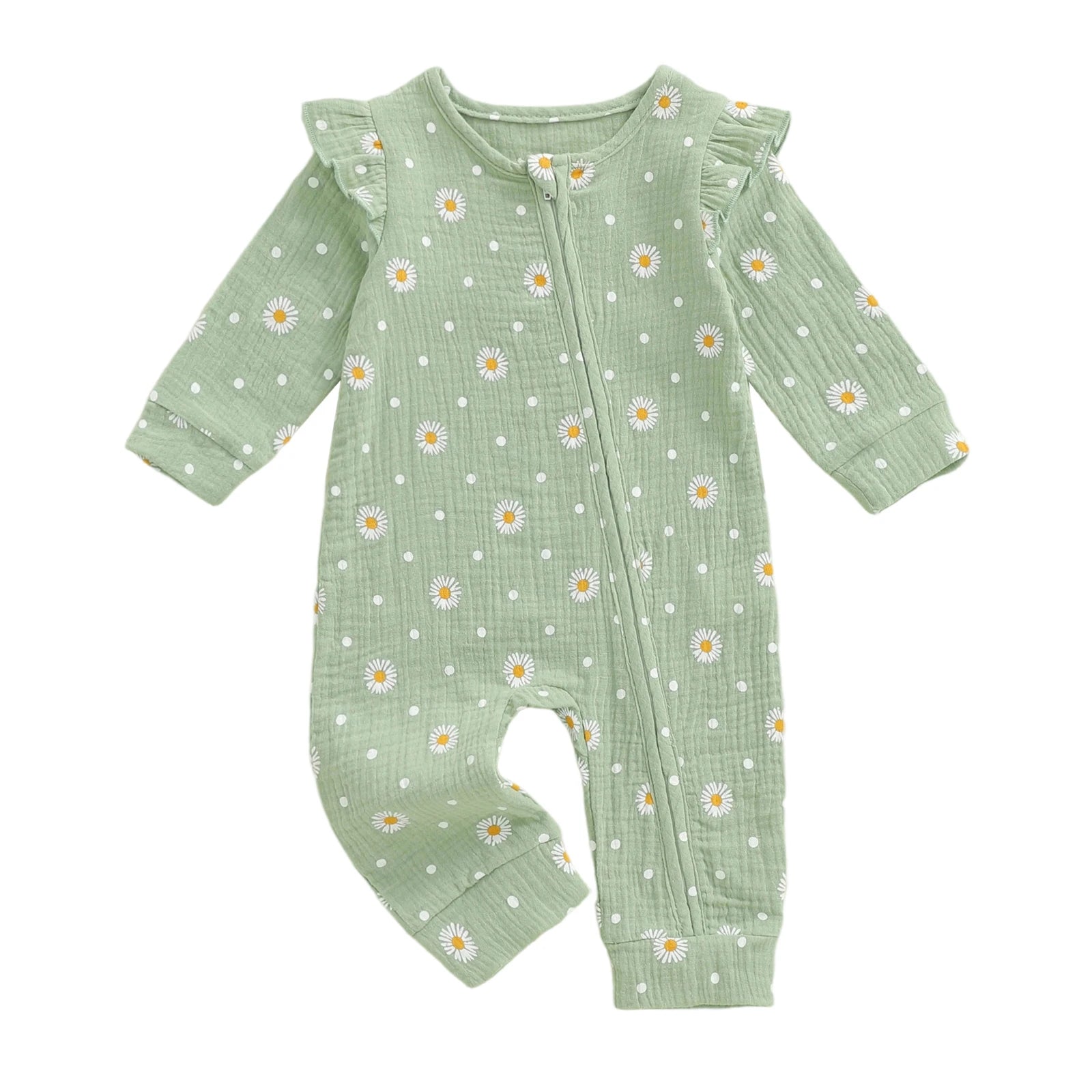 Baby Girls Fall Jumpsuit - Long Sleeve Flower Print Zipper Romper (0-18M)