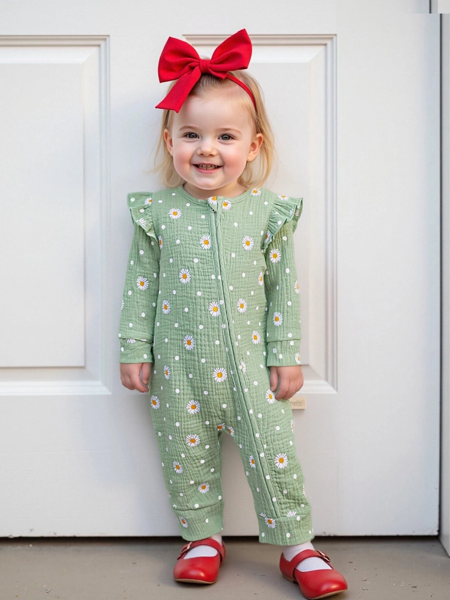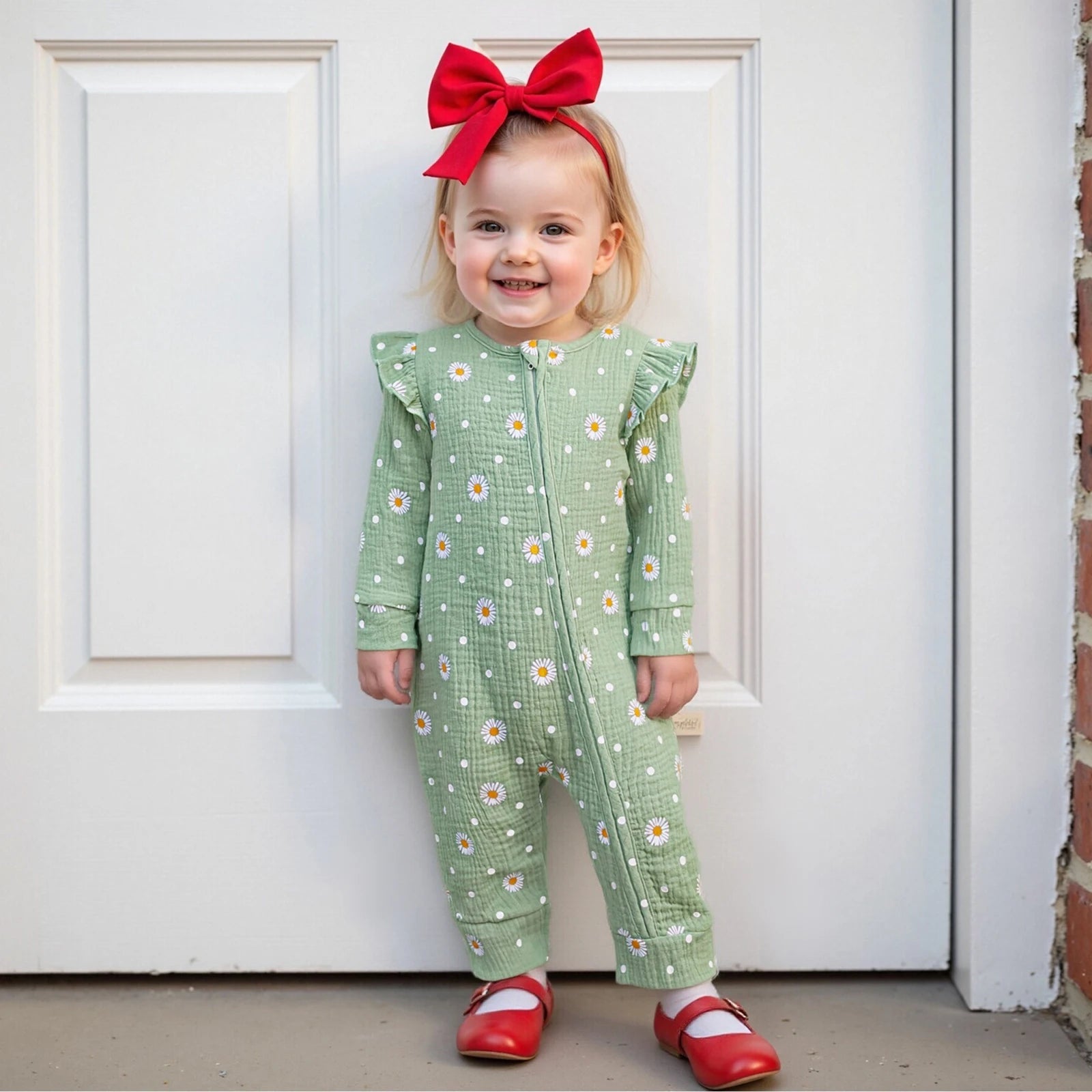 Dress your little princess in style with this charming long-sleeve jumpsuit featuring beautiful flower prints and convenient zipper closure. Perfect for autumn adventures and everyday comfort.