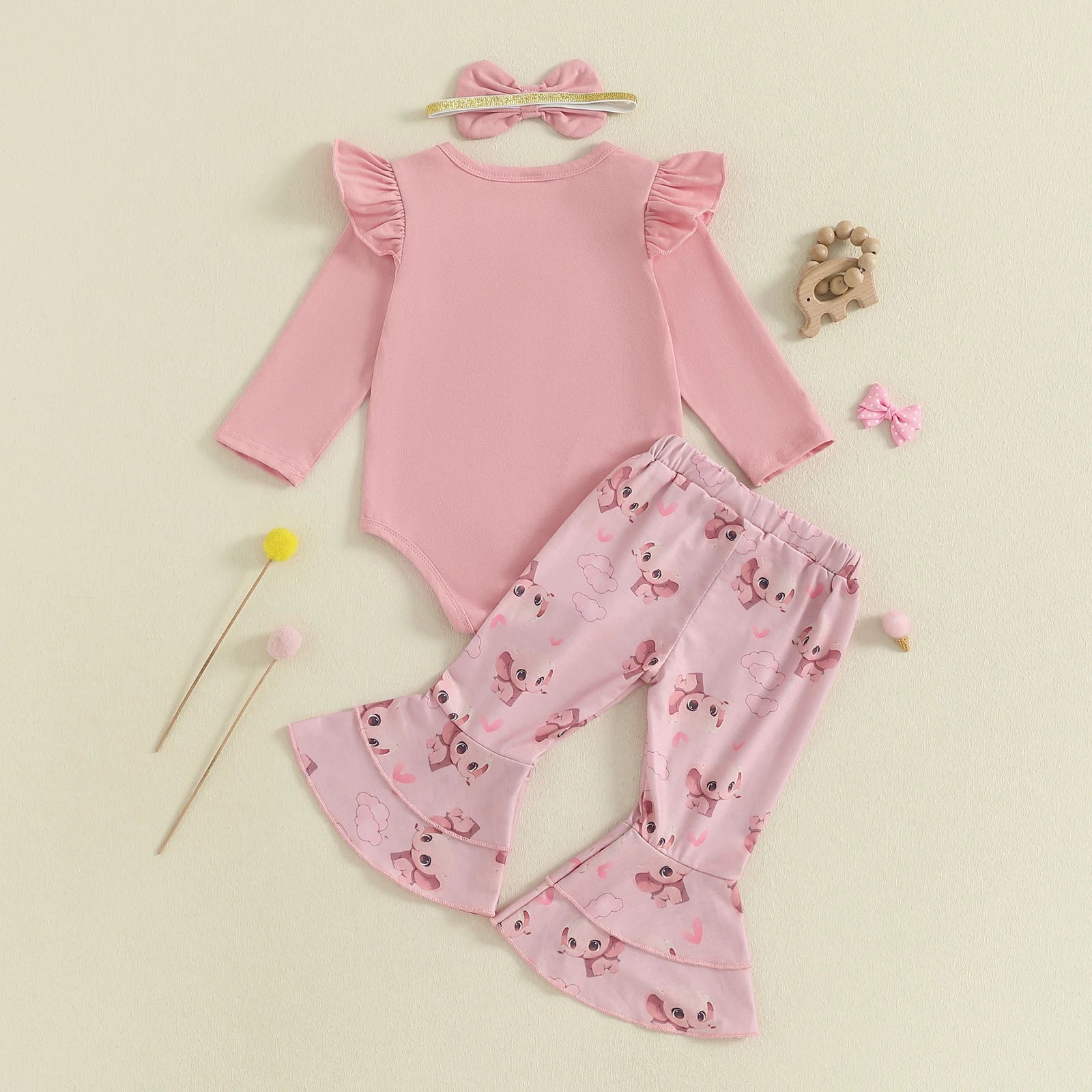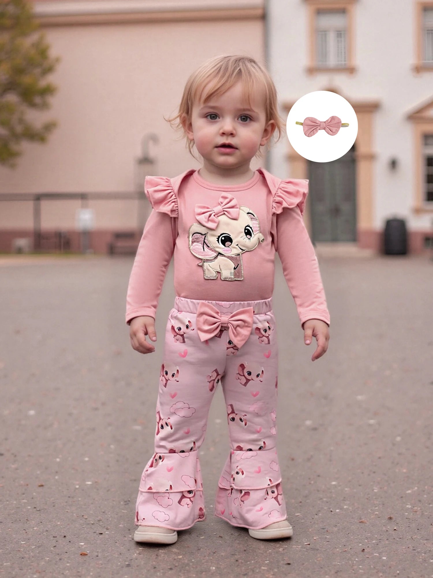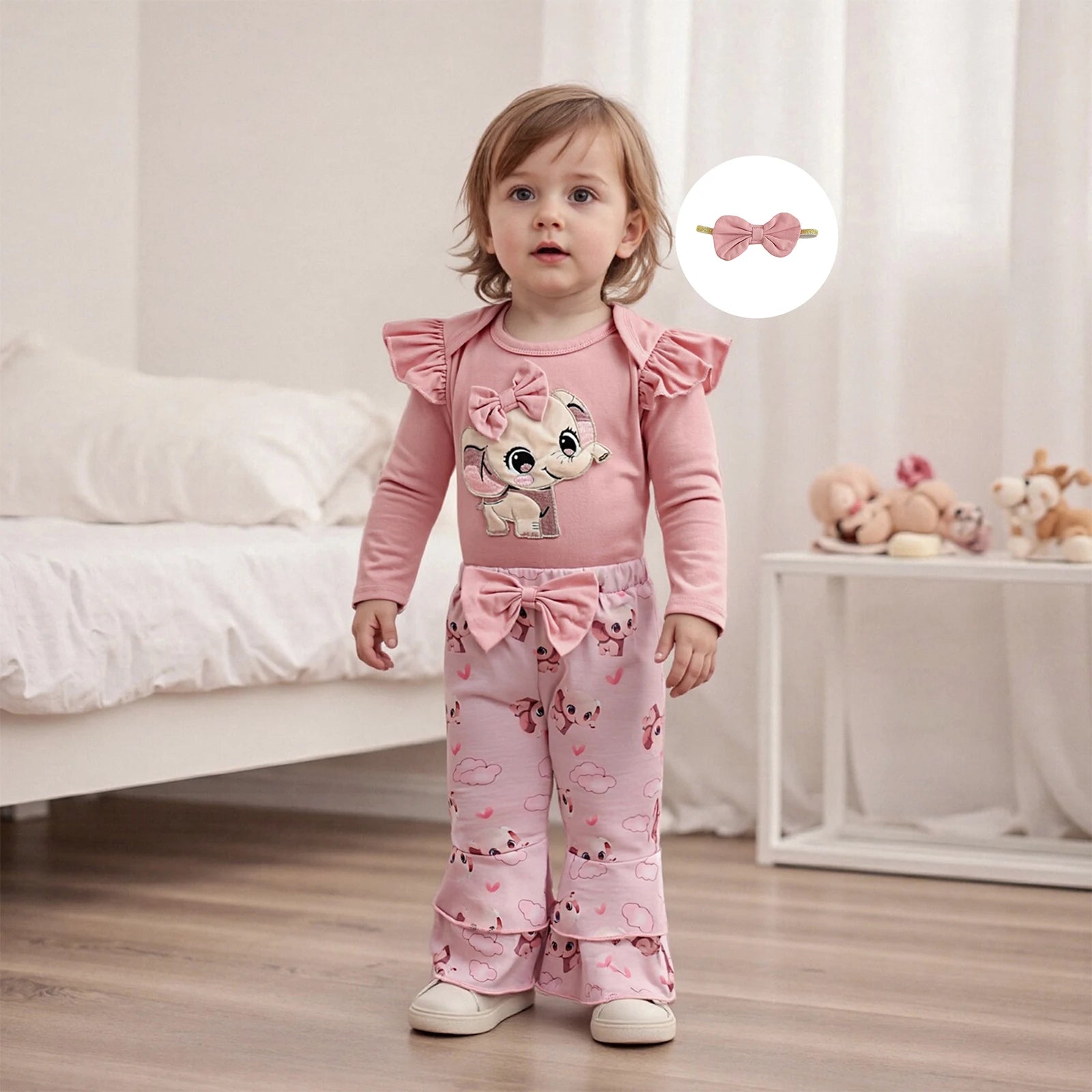 Baby Girls Fall Winter Clothes Set - Long Sleeve Bow Animal Embroidery Jumpsuit, Headband & Flared Pants