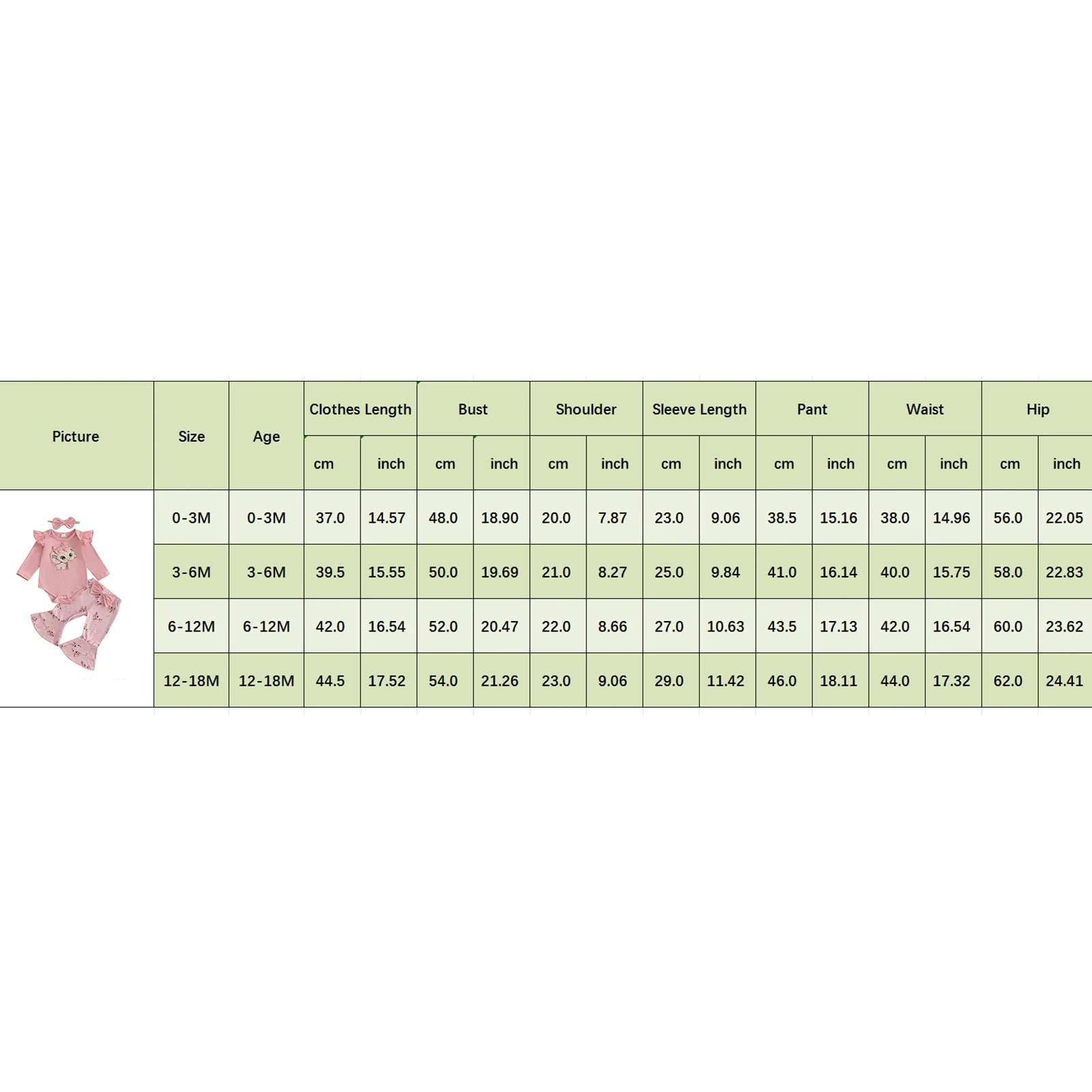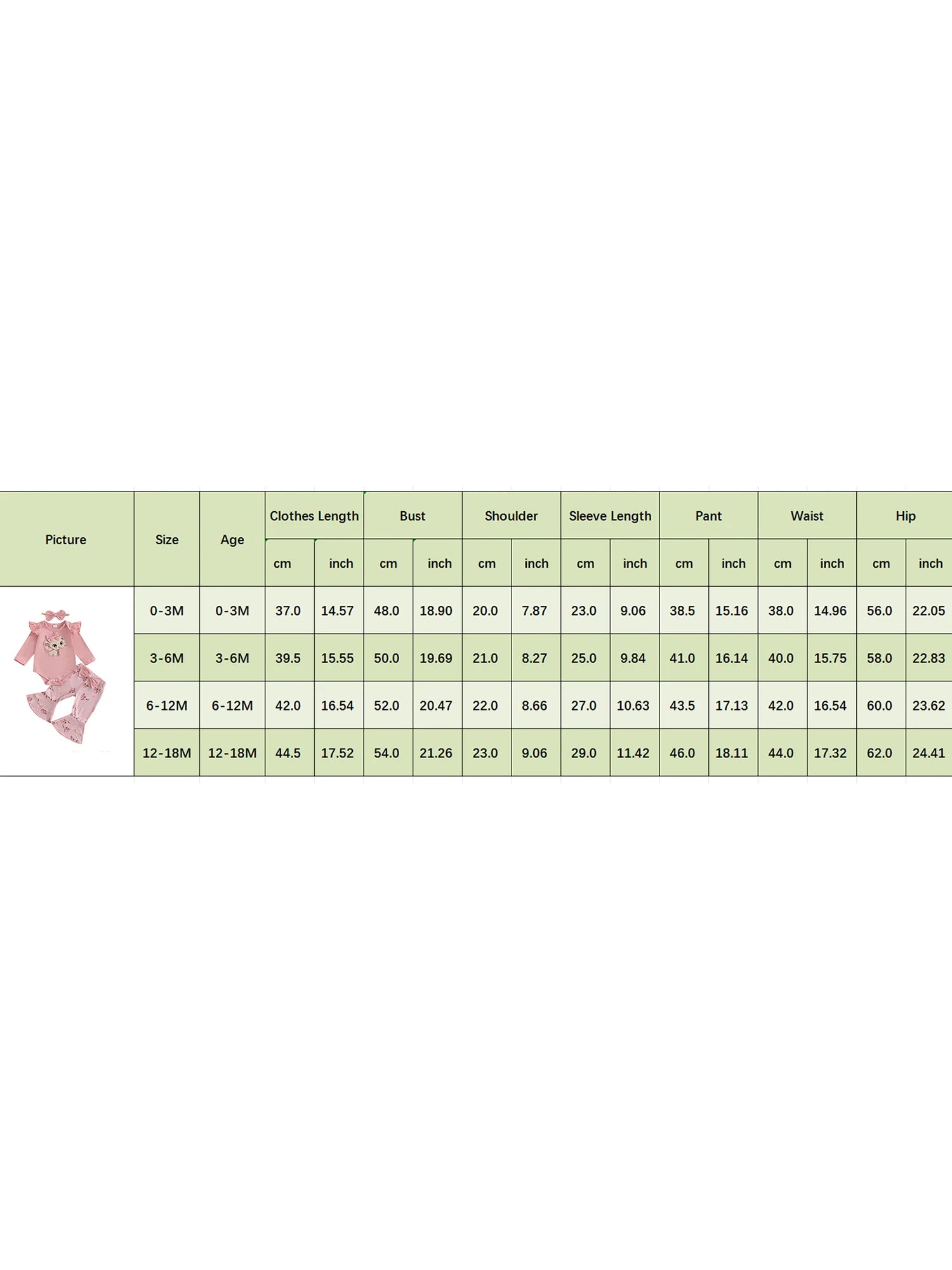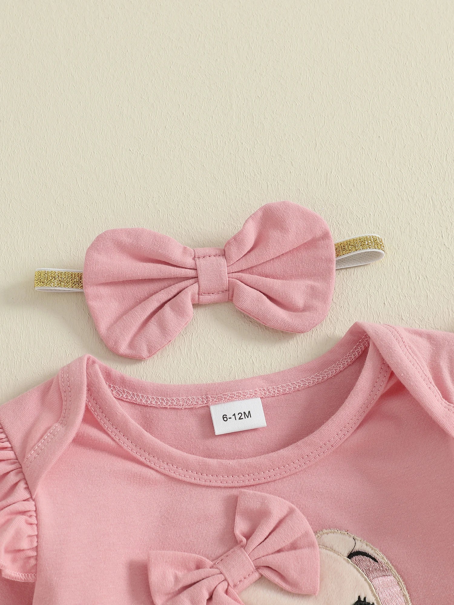 Baby Girls Fall Winter Clothes Set - Long Sleeve Bow Animal Embroidery Jumpsuit, Headband & Flared Pants