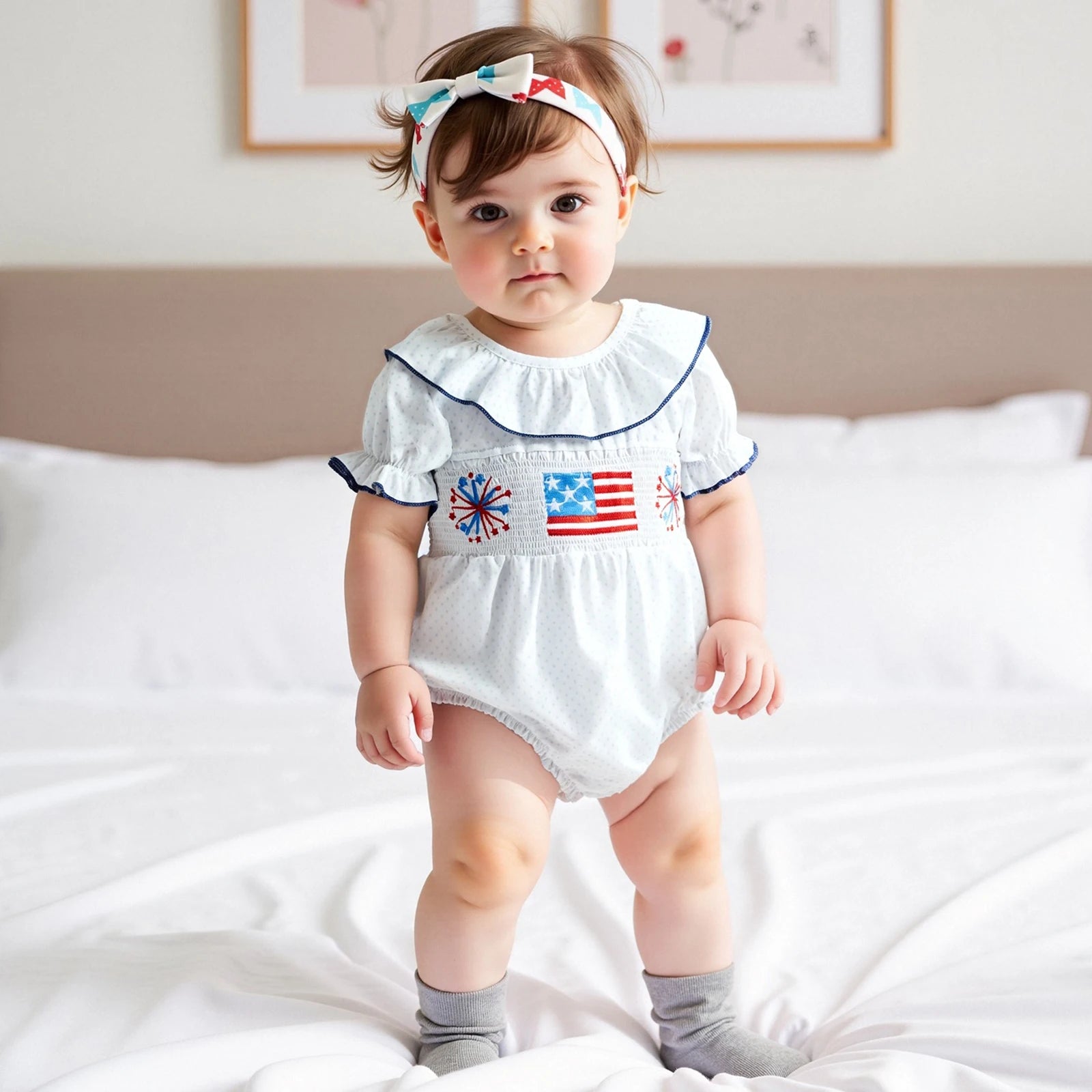 This charming romper is ideal for Independence Day celebrations, Fourth of July parties, summer gatherings, family photos, or patriotic events. The combination of dots, bows, flag embroidery, and ruffles creates a look that's both festive and adorable for your little one.