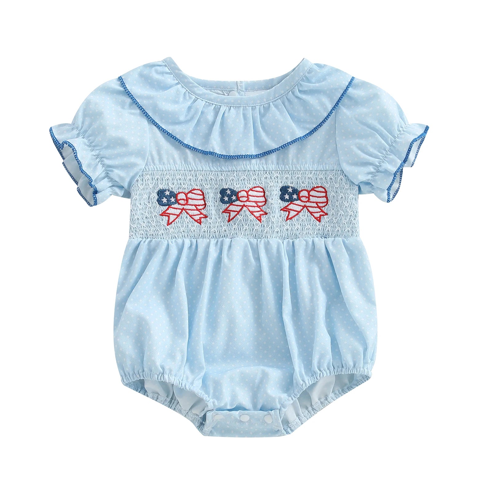 Dress your little one in festive charm with this adorable Independence Day romper for baby girls. Featuring playful dot print, sweet bow details, flag embroidery, and delicate ruffles, this short sleeve jumpsuit is perfect for babies aged 0-18 months during summer celebrations.