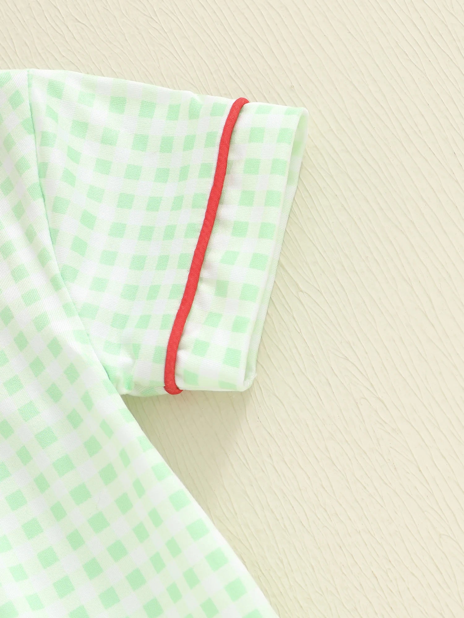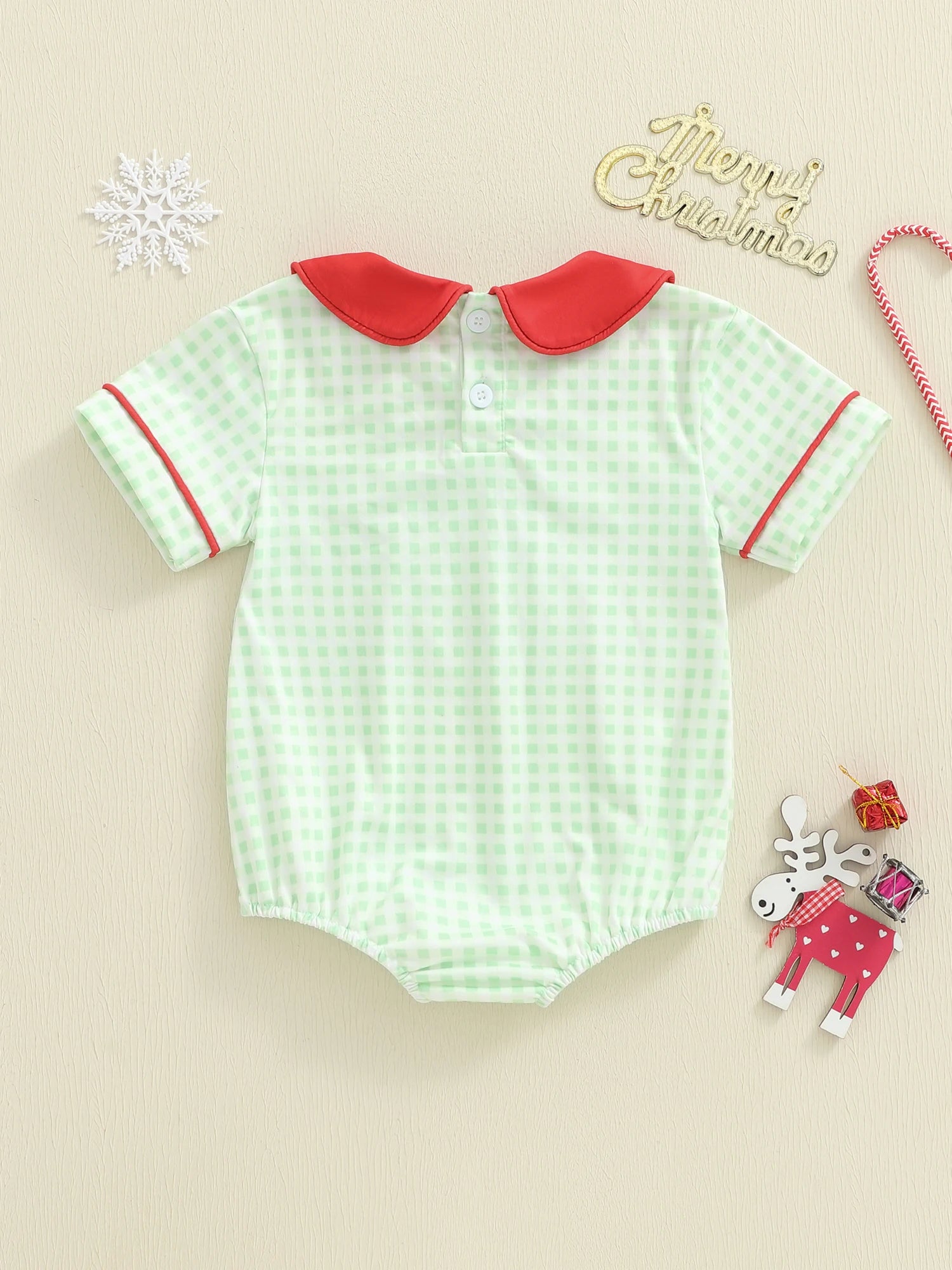 Dress your little one in charming style with this adorable plaid romper. Featuring delicate wreath embroidery, a sweet doll collar, and a classic bubble jumpsuit silhouette with short sleeves, this outfit is perfect for warm weather celebrations and everyday adventures.