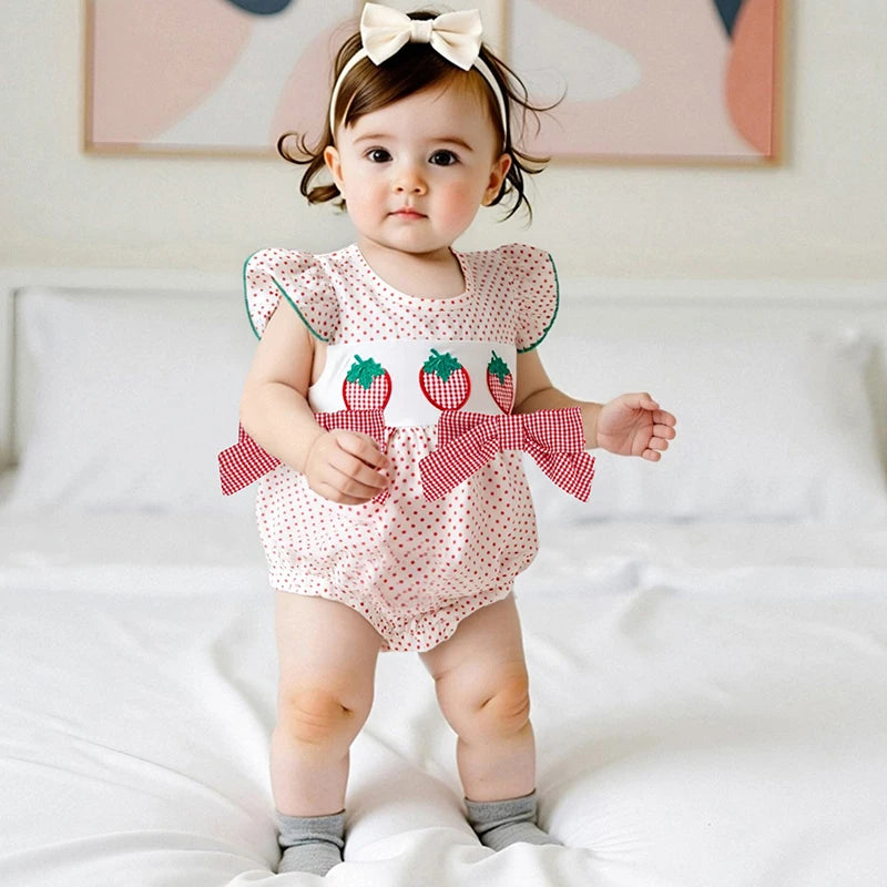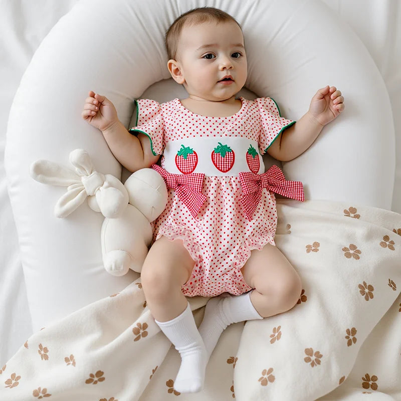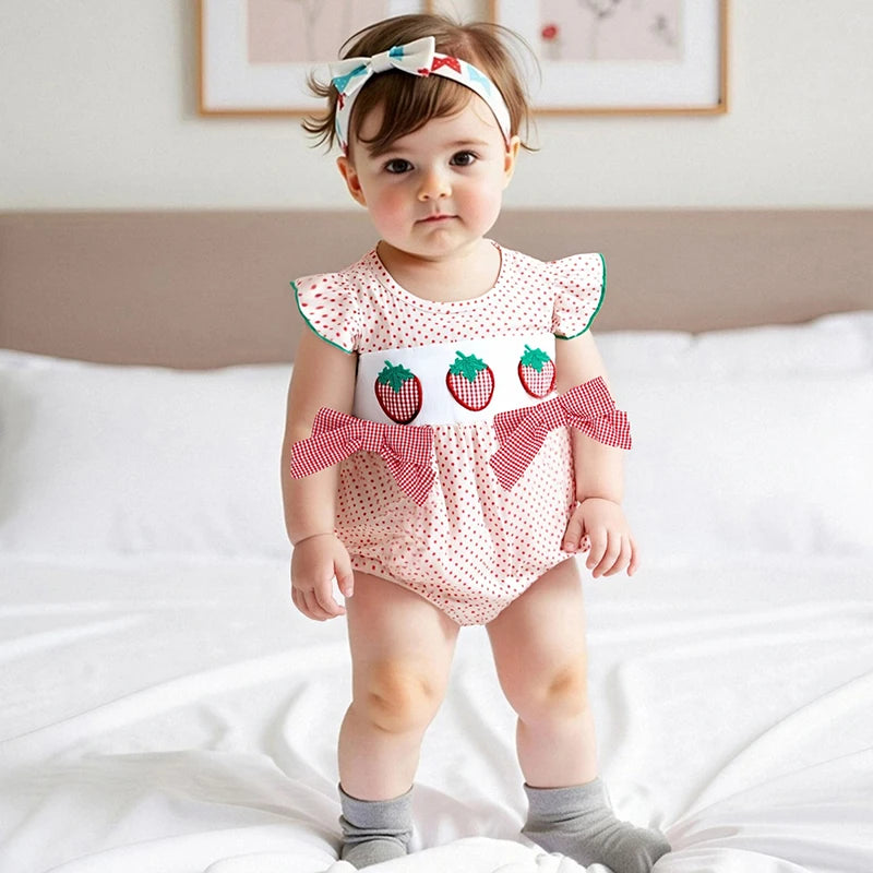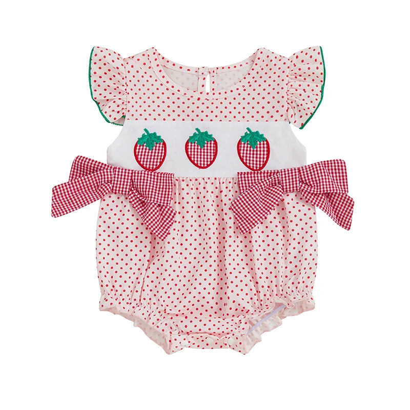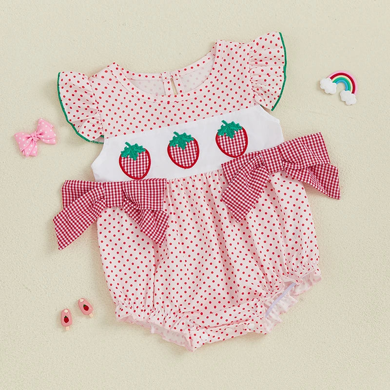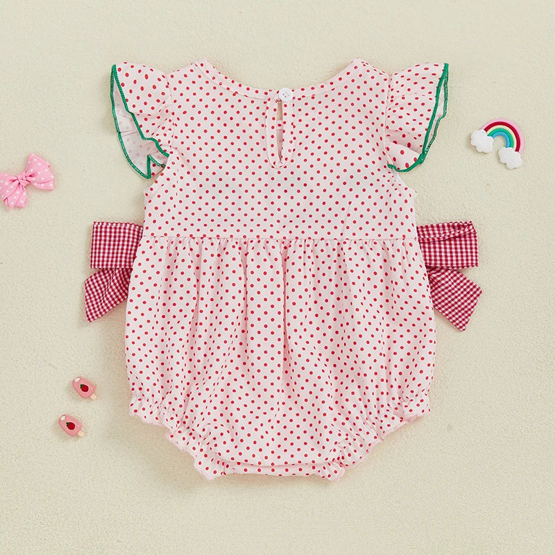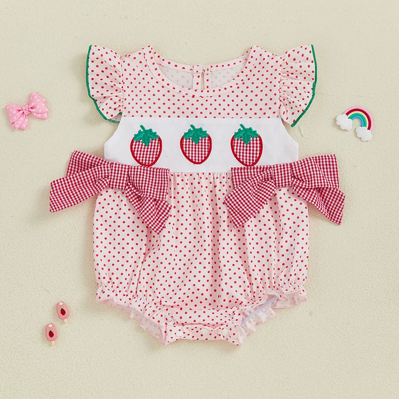 0-18M Baby Girls Romper for Summer Strawberry Embroidery Dot Print Crew Neck Ruffled Flying Sleeve Babygrow Jumpsuit