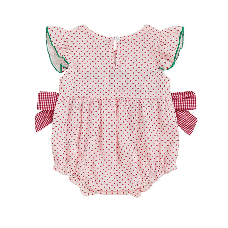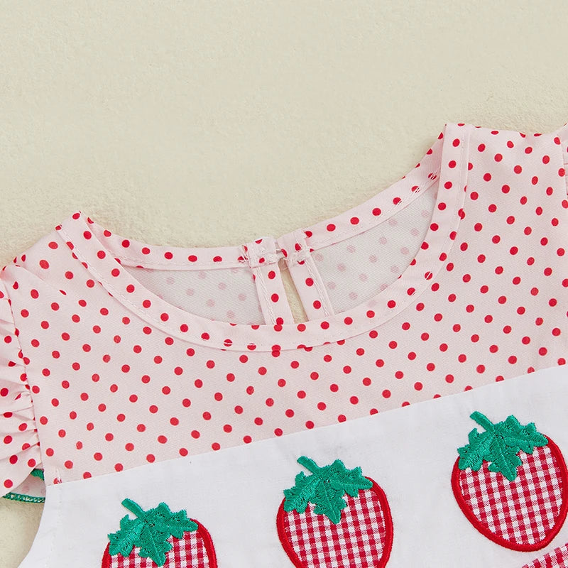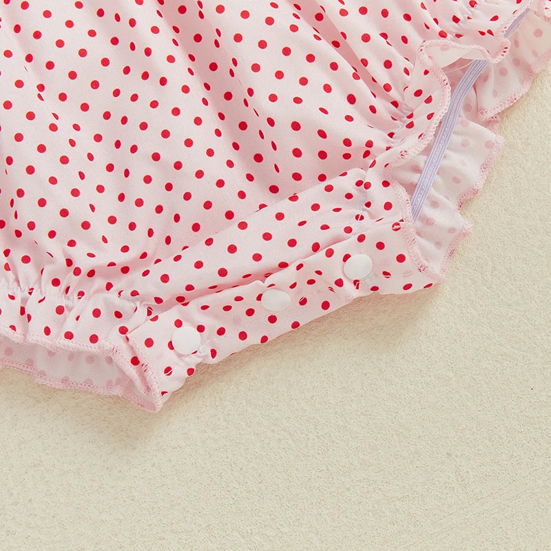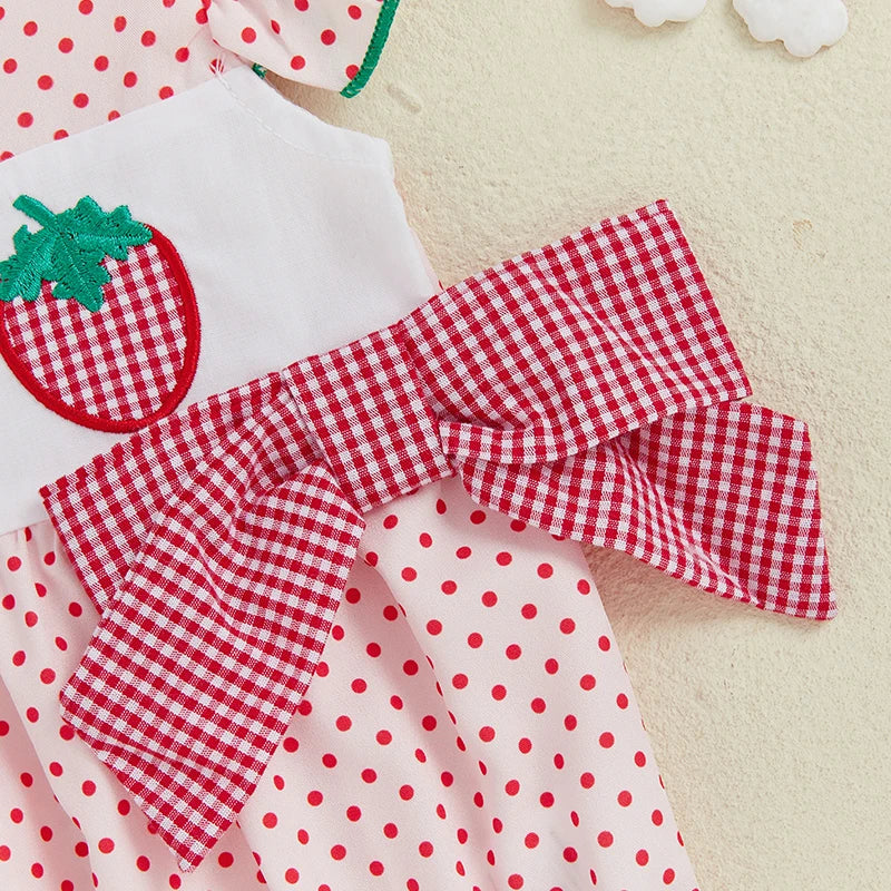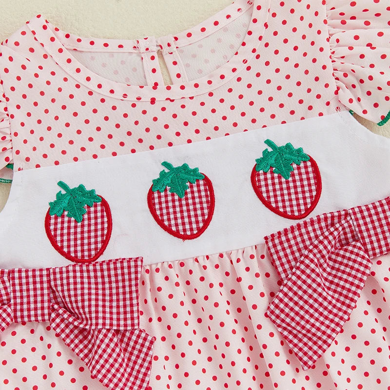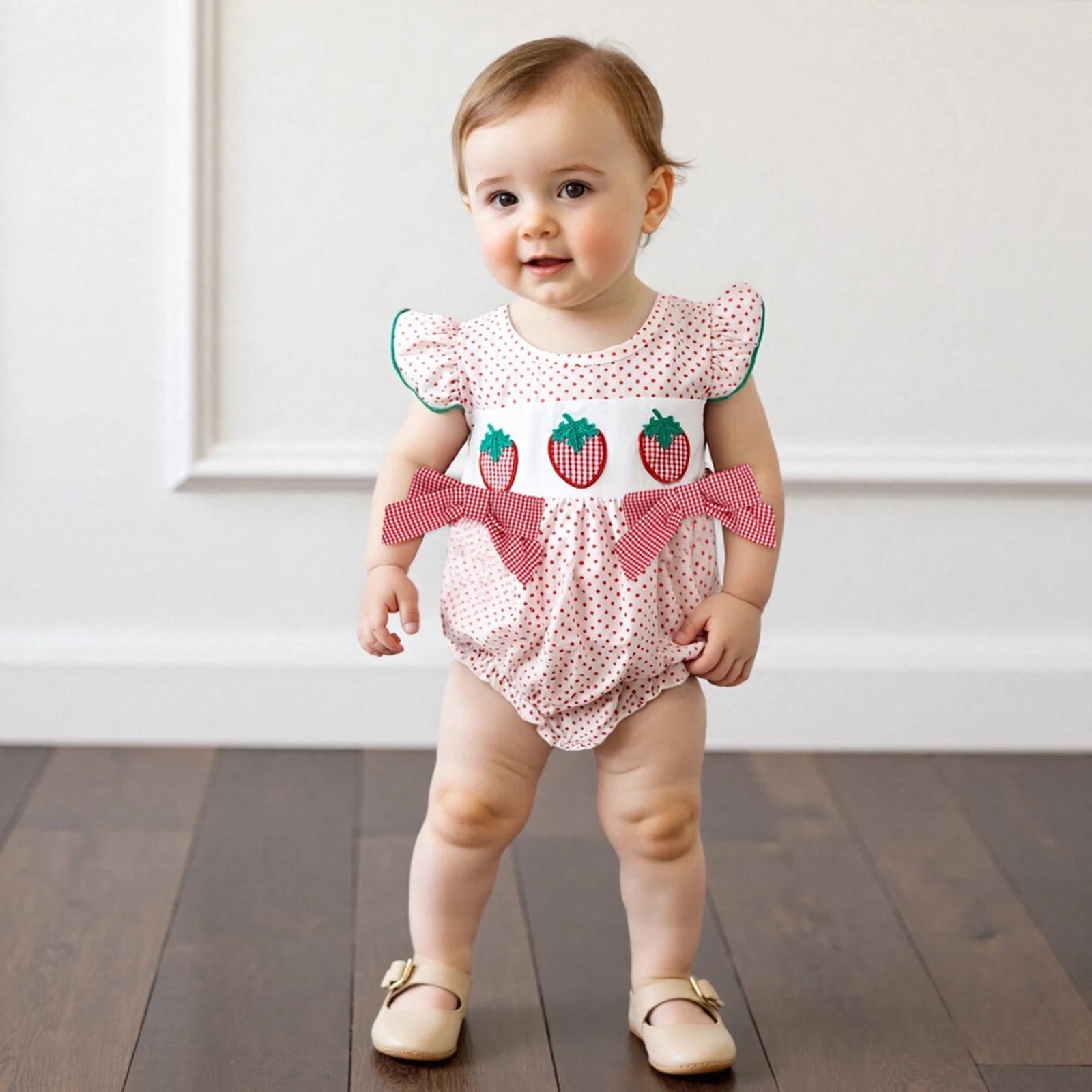0-18M Baby Girls Romper for Summer Strawberry Embroidery Dot Print Crew Neck Ruffled Flying Sleeve Babygrow Jumpsuit