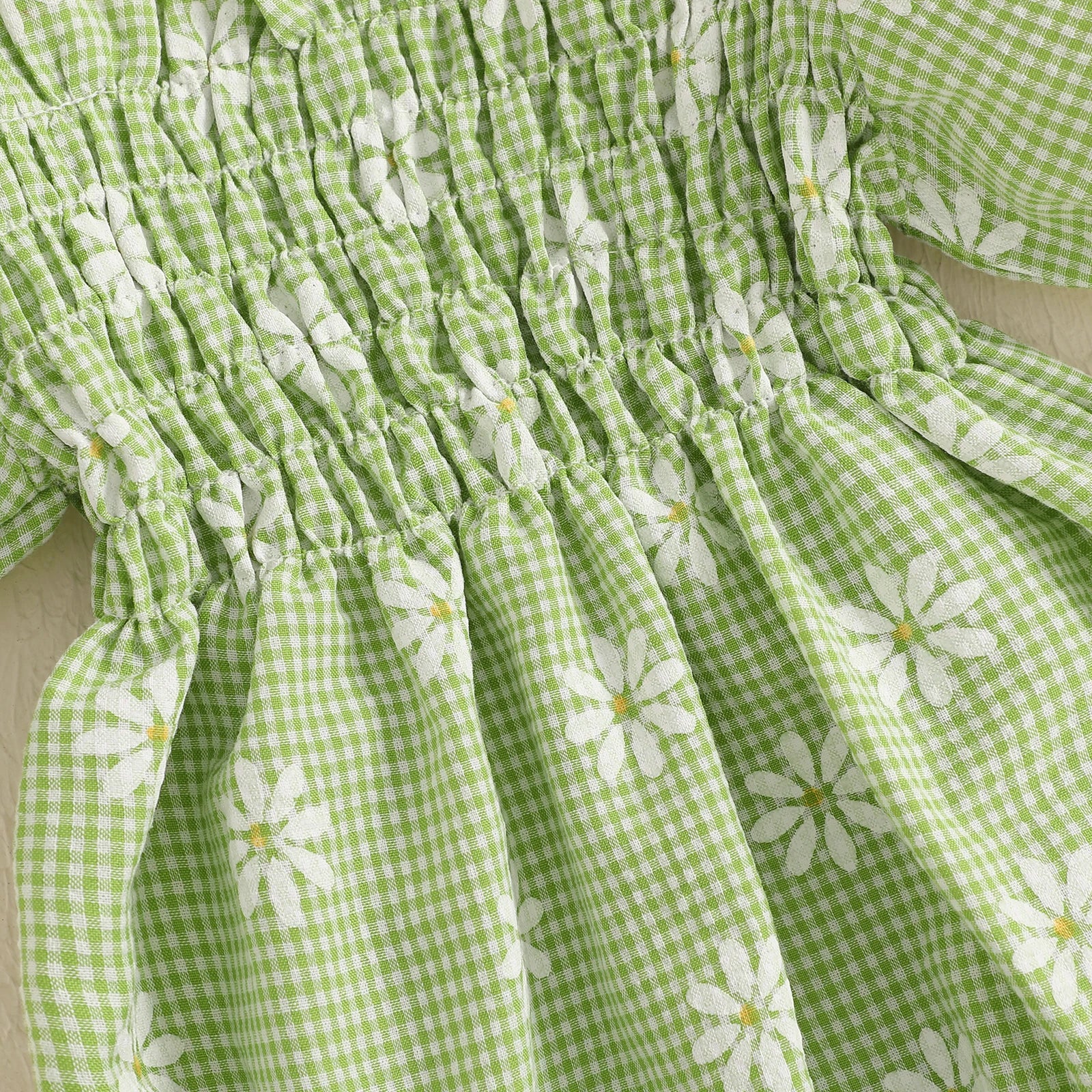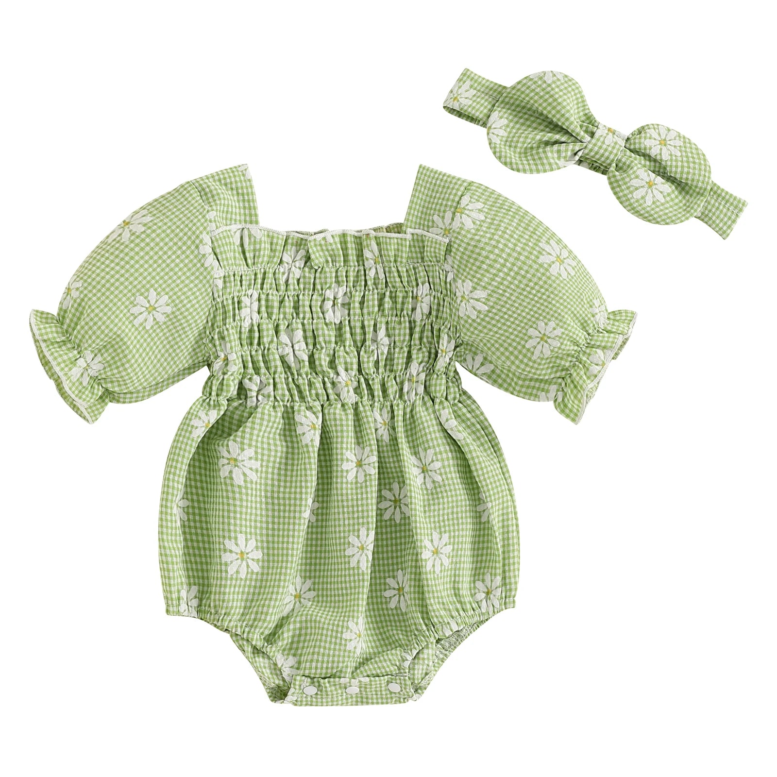 Baby Girls Romper Set with Headband - Plaid Flower Print Short Sleeve Bodysuit 2-Piece