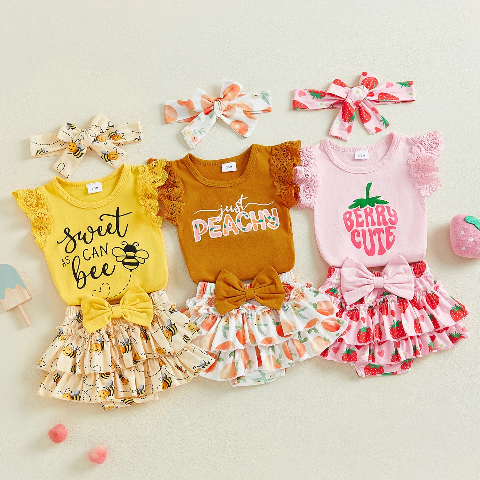 0-18M Baby Girls Summer Clothes Sets Flying Sleeves Letter Fruit Print Romper Tiered Ruffled Shorts with Headband
