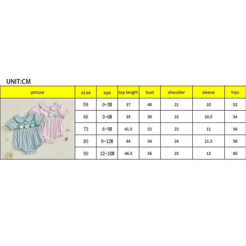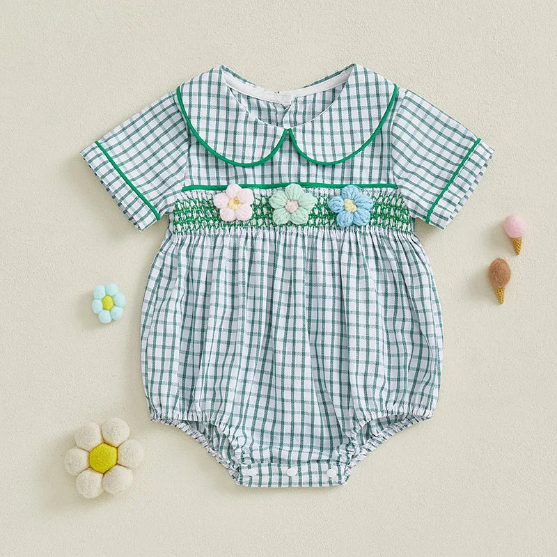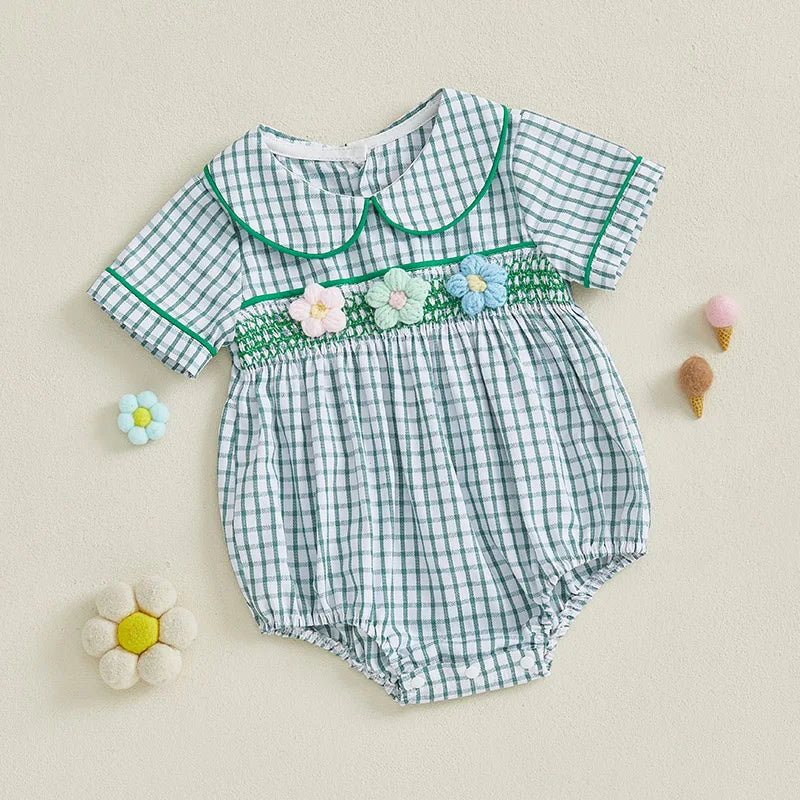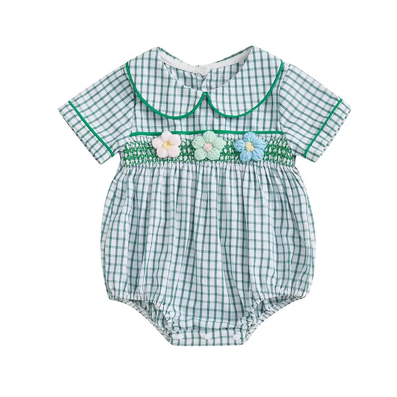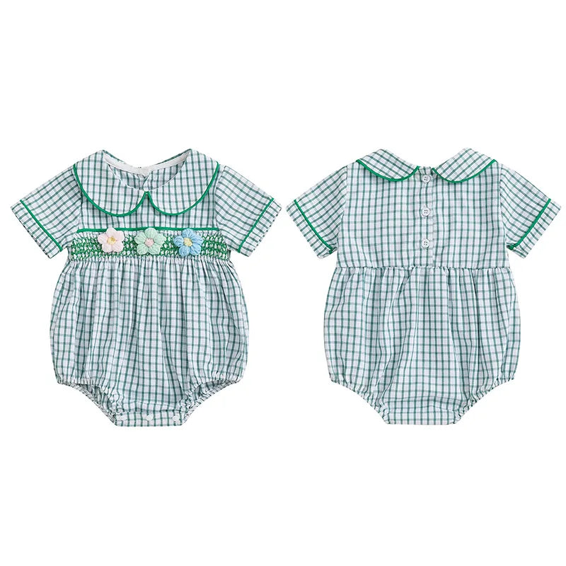 Baby Girls Summer Plaid Romper - Doll Collar Short Sleeve with Flower Embroidery (0-18M)