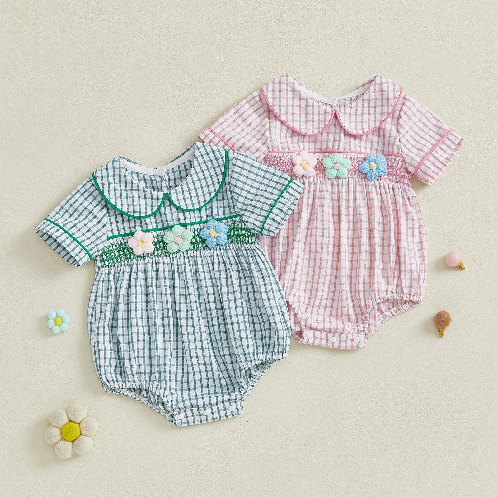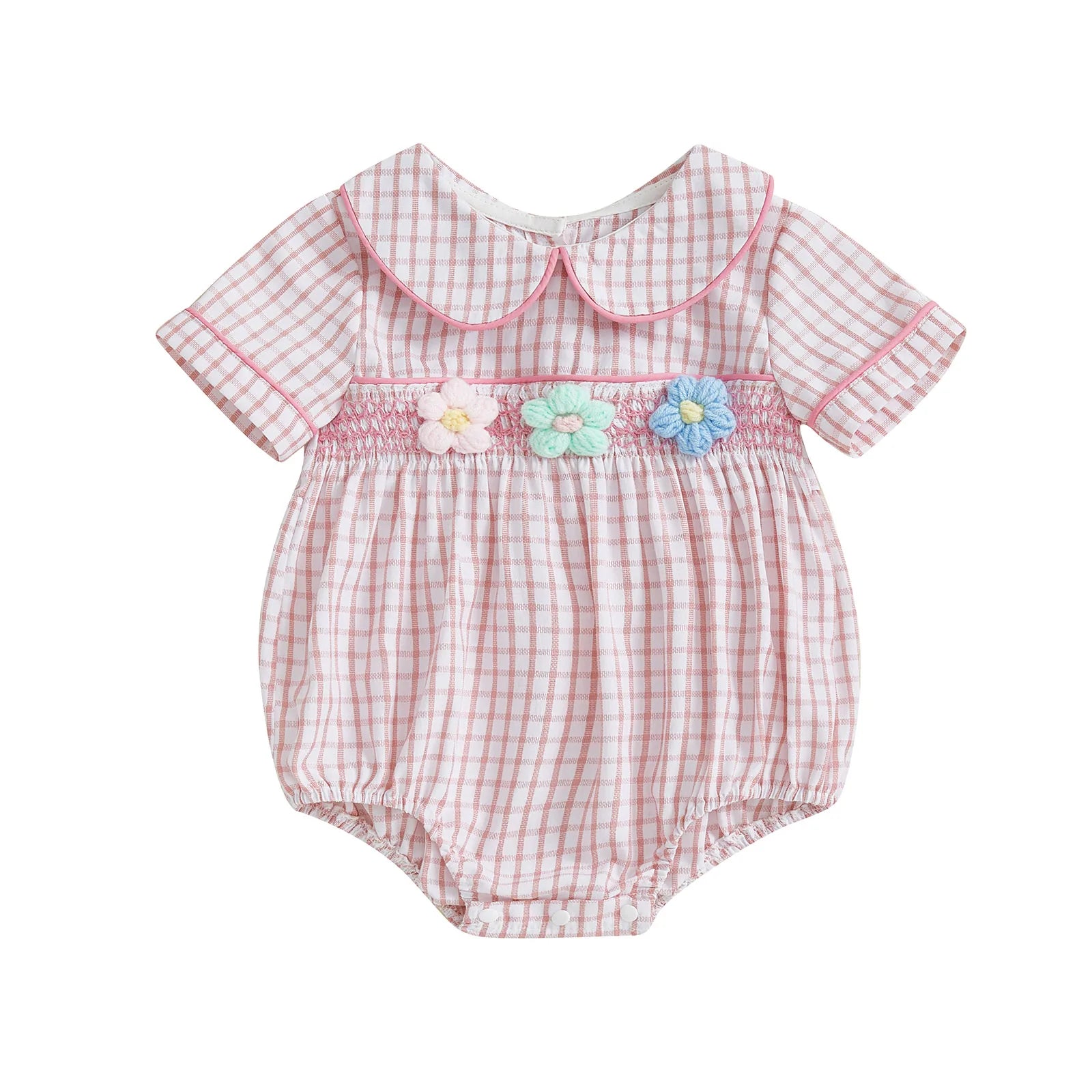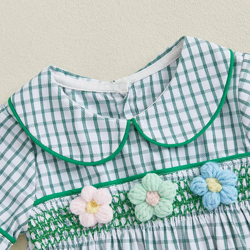 Baby Girls Summer Plaid Romper - Doll Collar Short Sleeve with Flower Embroidery (0-18M)