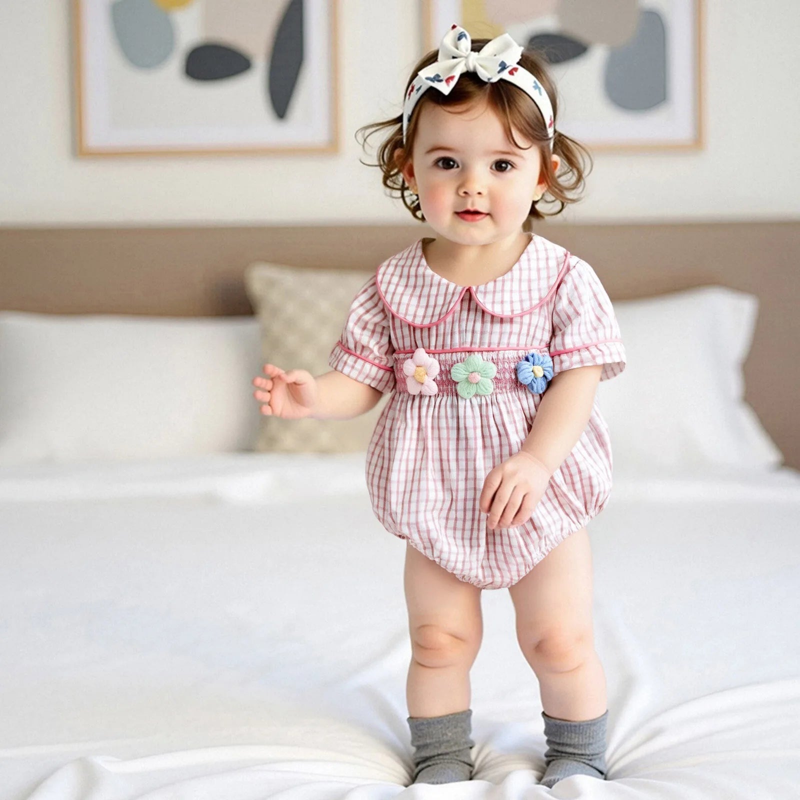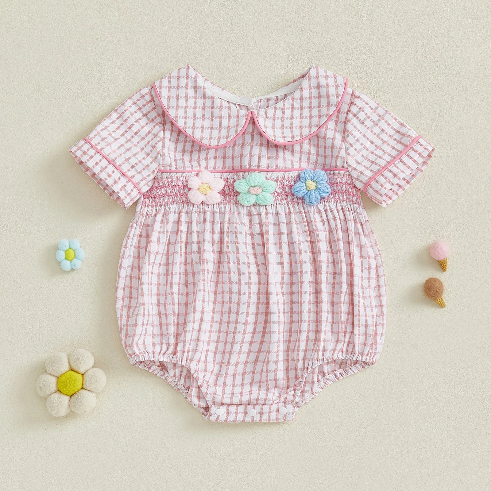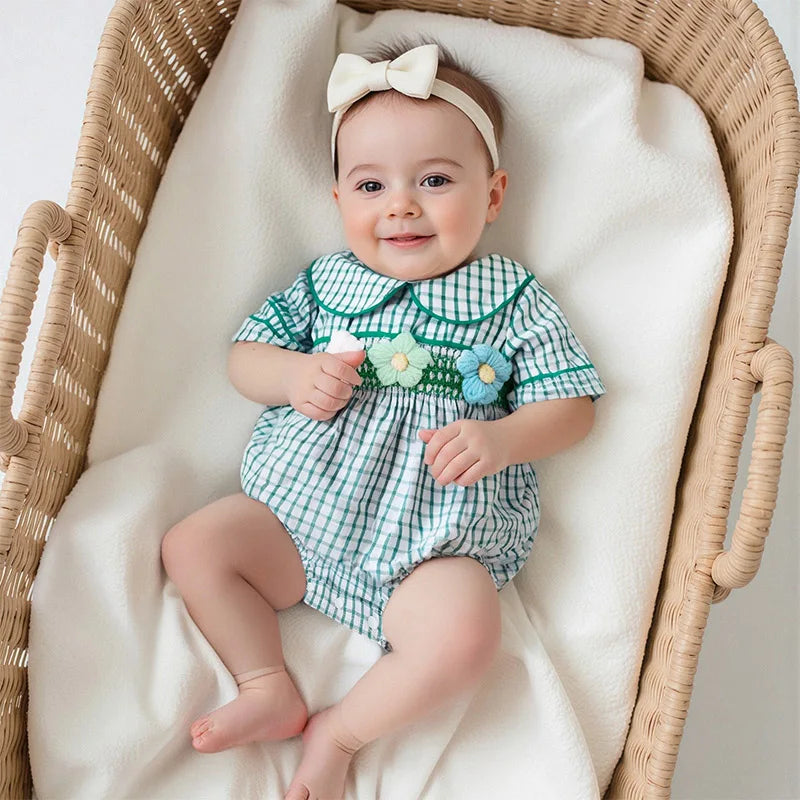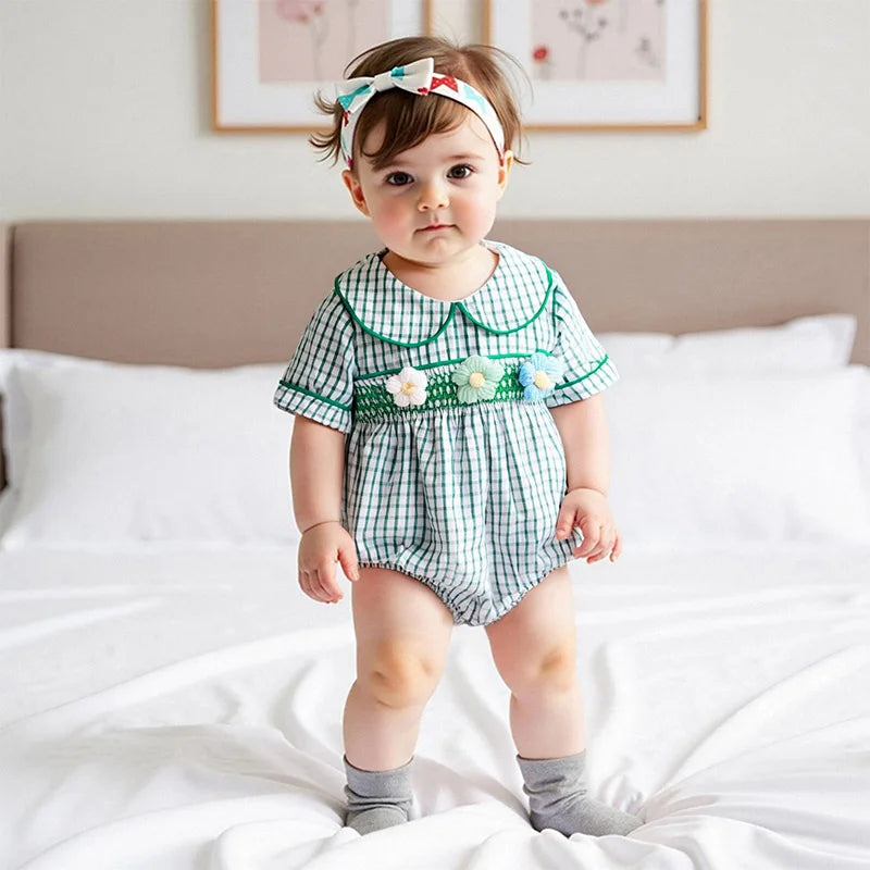 This charming plaid romper captures the essence of sweet summer days with its adorable doll collar and delicate flower embroidery. The classic plaid pattern combined with feminine details creates the perfect outfit for your precious little one.