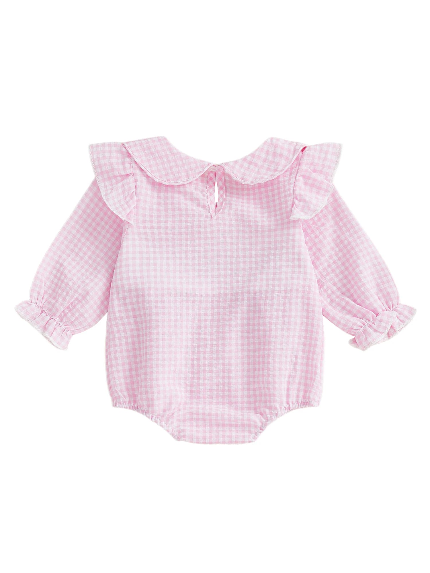 Baby Girls Valentine's Romper - Plaid Embroidered Ruffled Doll Neck Jumpsuit 0-18M