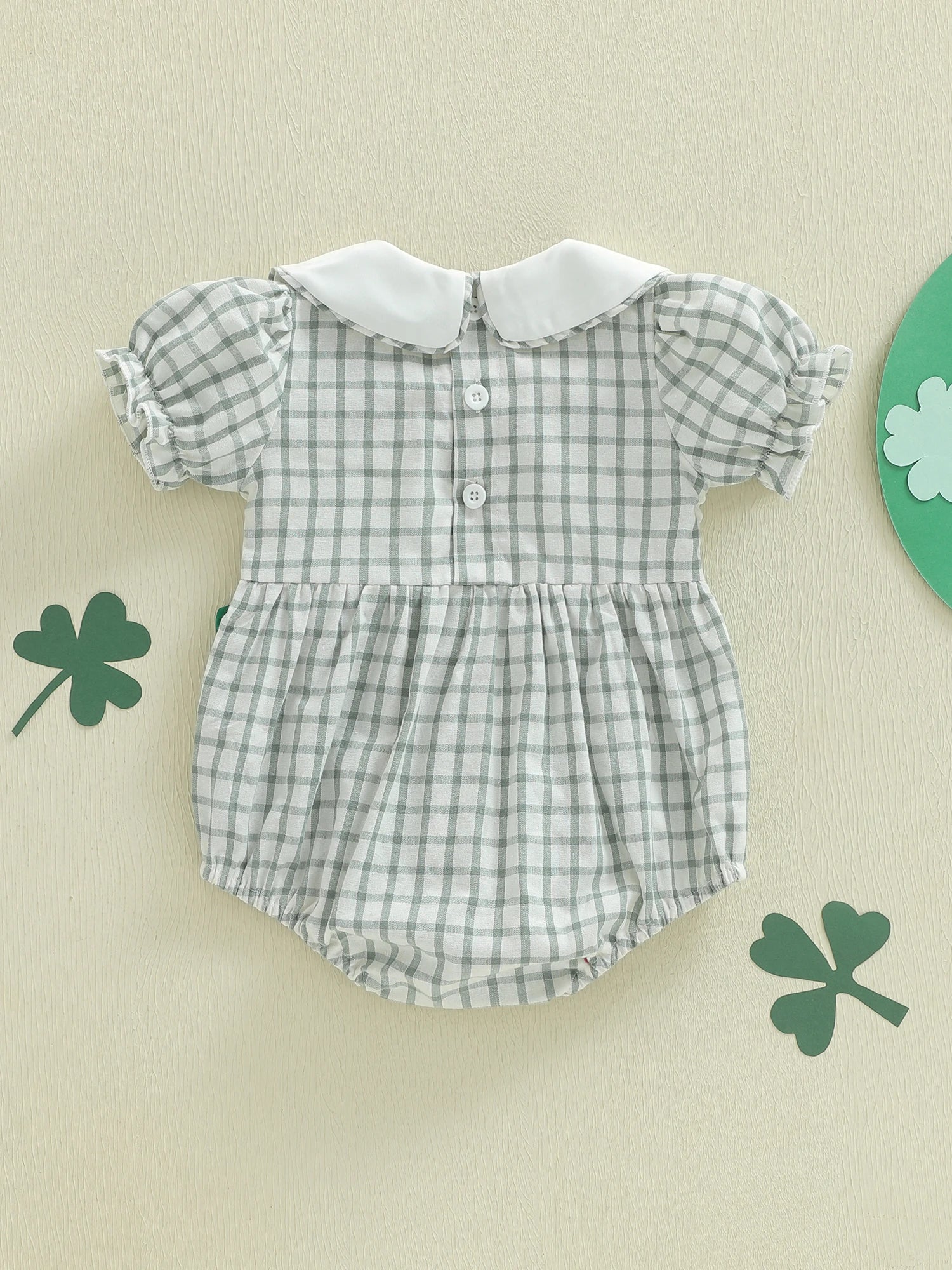 Newborn Baby Girls Boys Irish Plaid Clover Embroidered Short Sleeve Doll Collar Romper