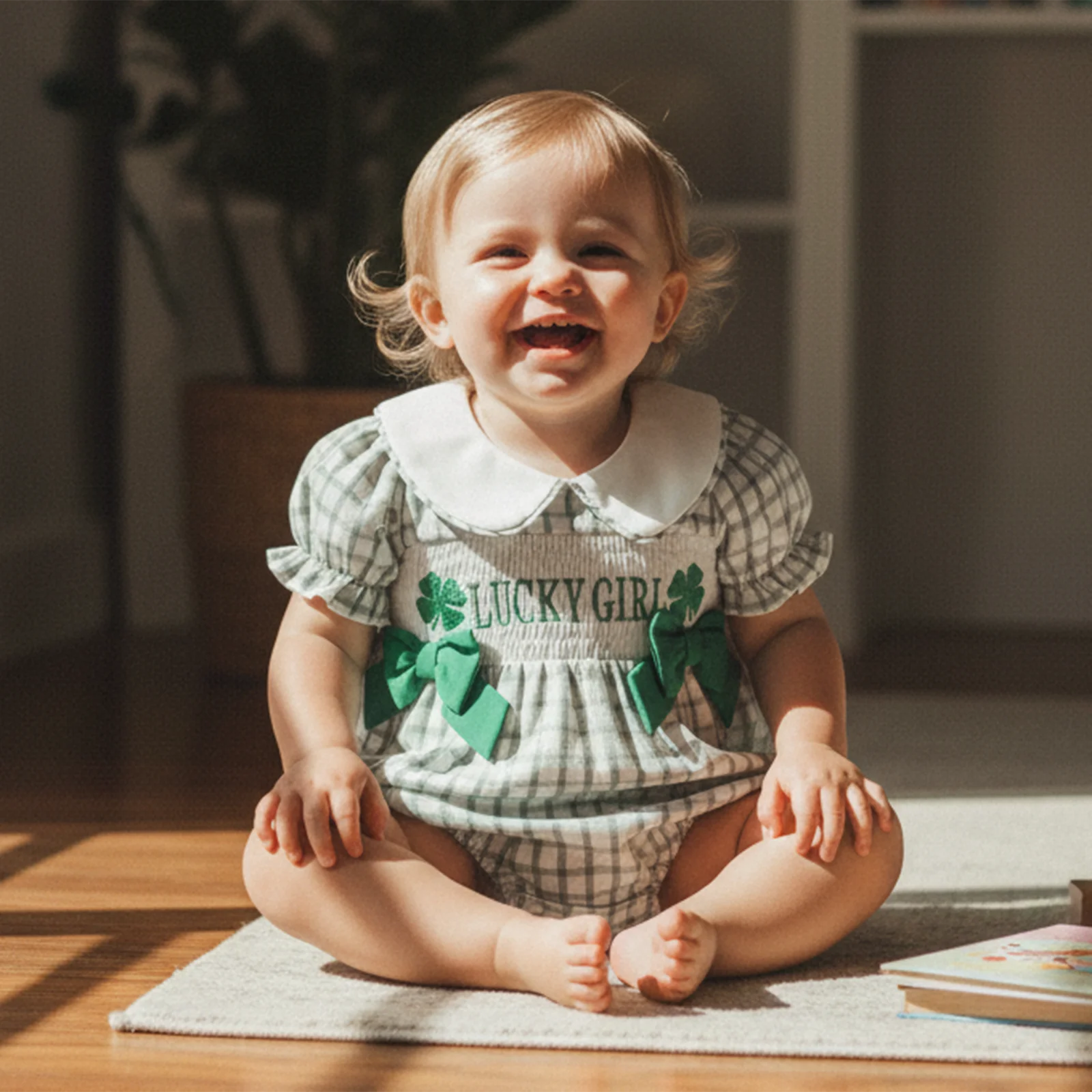 Style Notes: This adorable Irish-themed romper is perfect for celebrating St. Patrick's Day or showcasing Irish pride year-round. The plaid pattern with clover embroidery and doll collar create an irresistibly cute look that's ideal for family photos, celebrations, or everyday wear. A wonderful gift for new parents or for baby's first St. Patrick's Day!