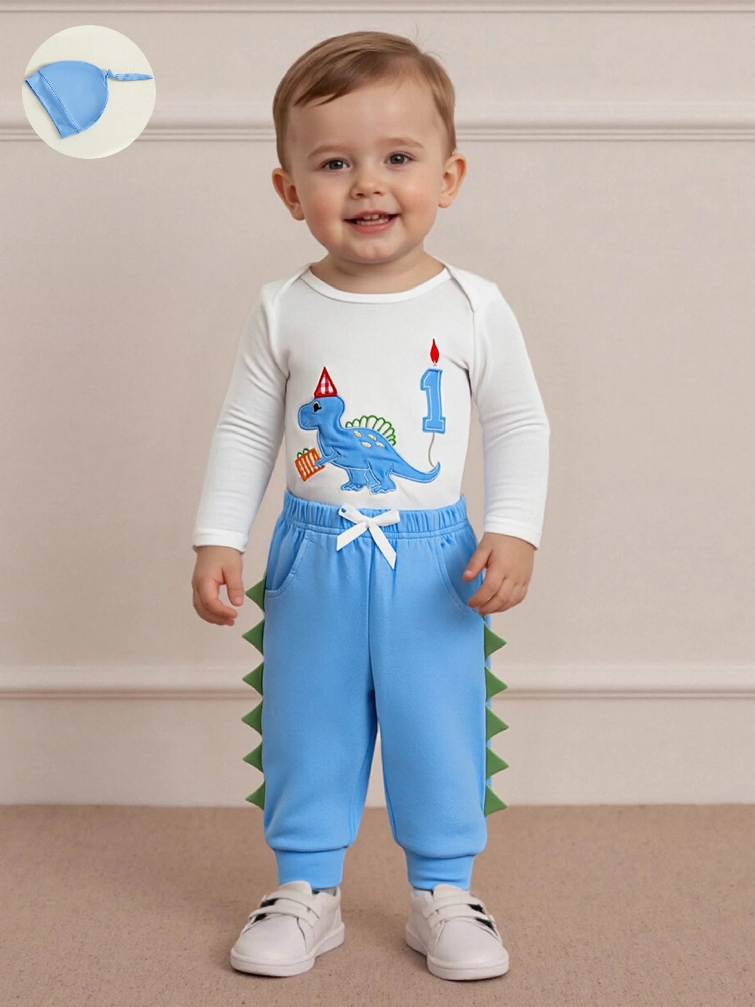 Celebrate your little one's special day with this charming 3-piece birthday clothing set. Featuring cute dinosaur embroidery on a long sleeve romper, matching pants, and an adorable hat, this complete outfit is perfect for first birthday celebrations, photo sessions, and creating precious memories.