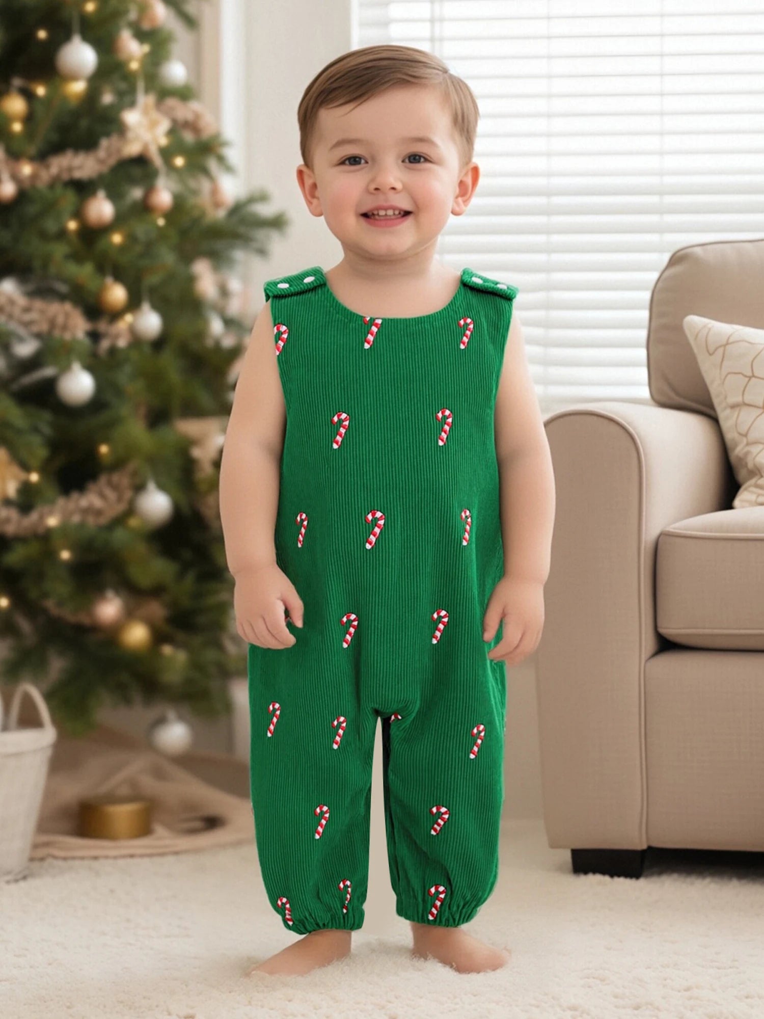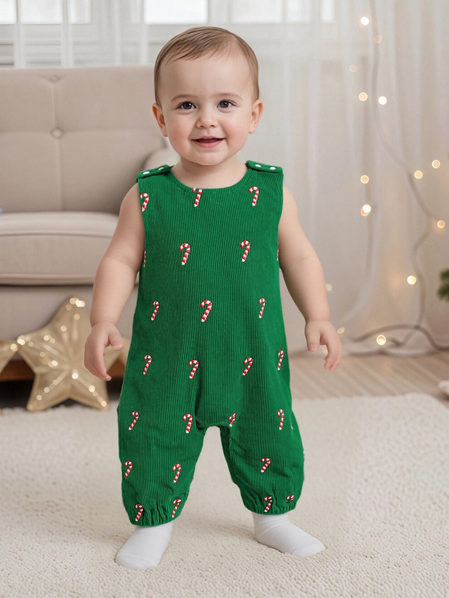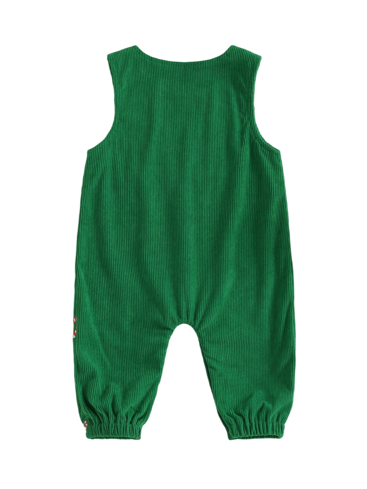 Celebrate baby's first Christmas with this charming sleeveless romper. Featuring festive candy cane embroidery and a classic round neckline, this lightweight jumpsuit is perfect for holiday celebrations and memorable photos.
