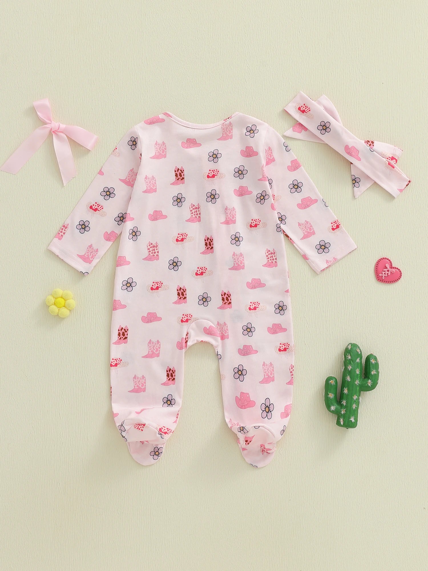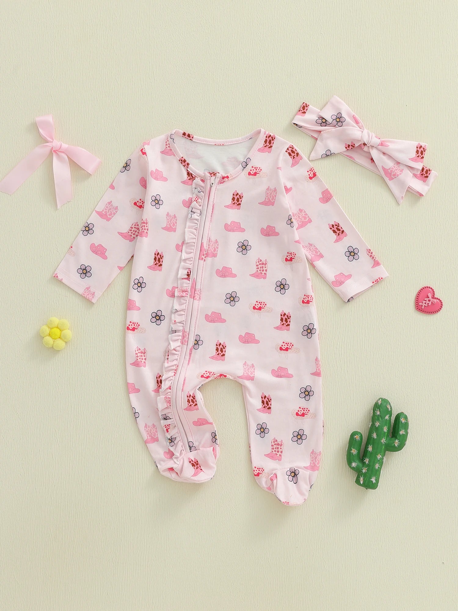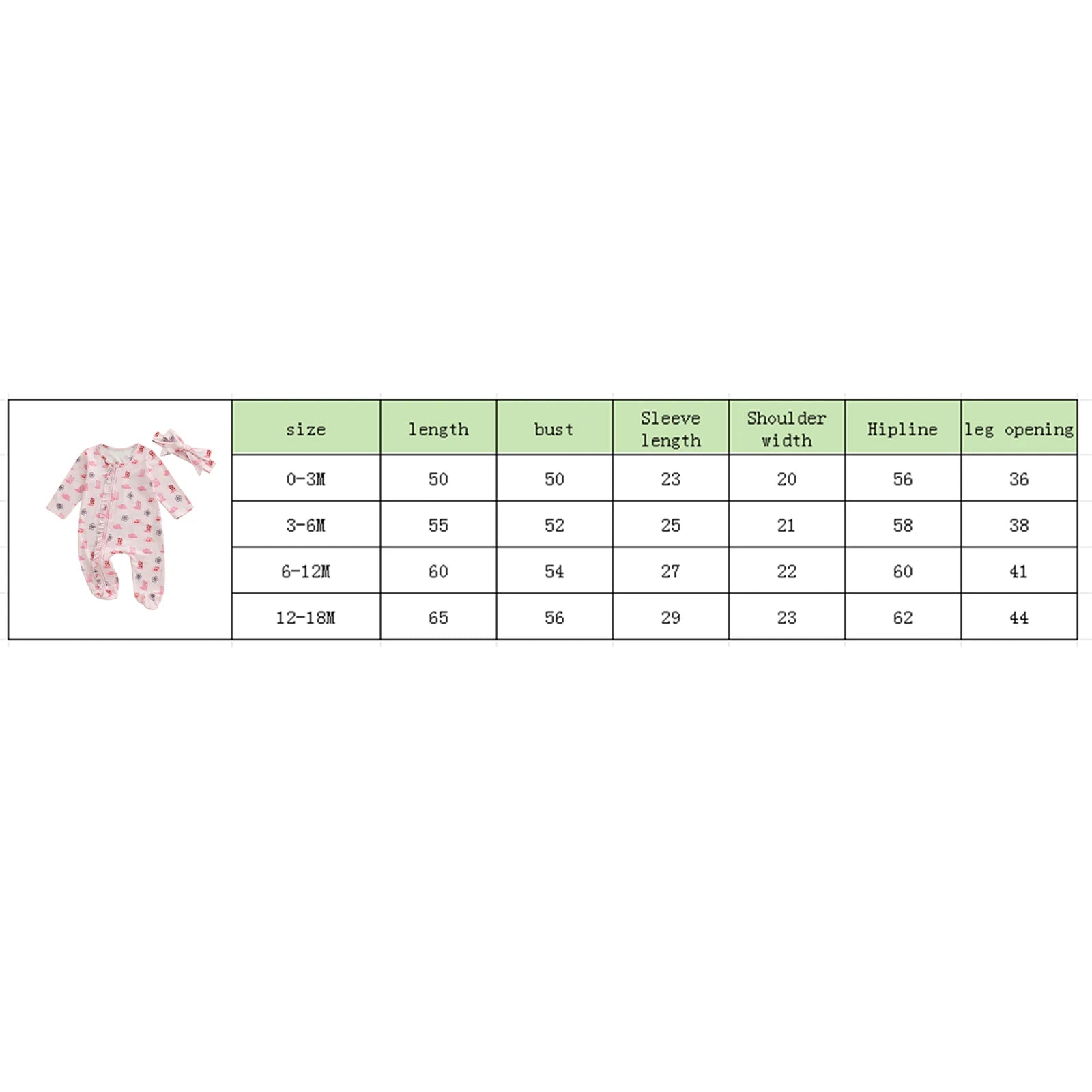 Baby Fall Winter Romper with Floral Hat Print - Zip Up Footed Jumpsuit & Headband (0-18M)