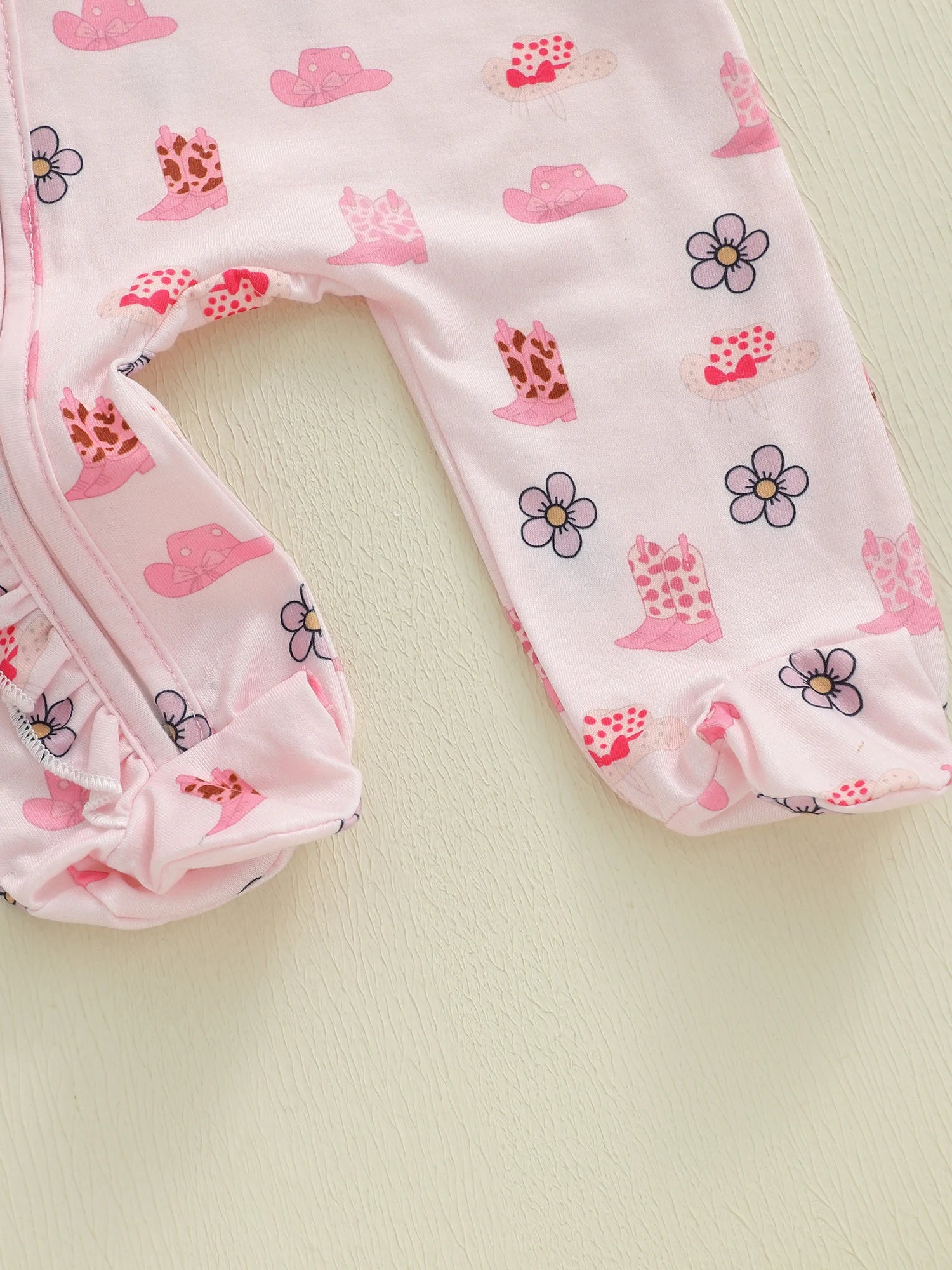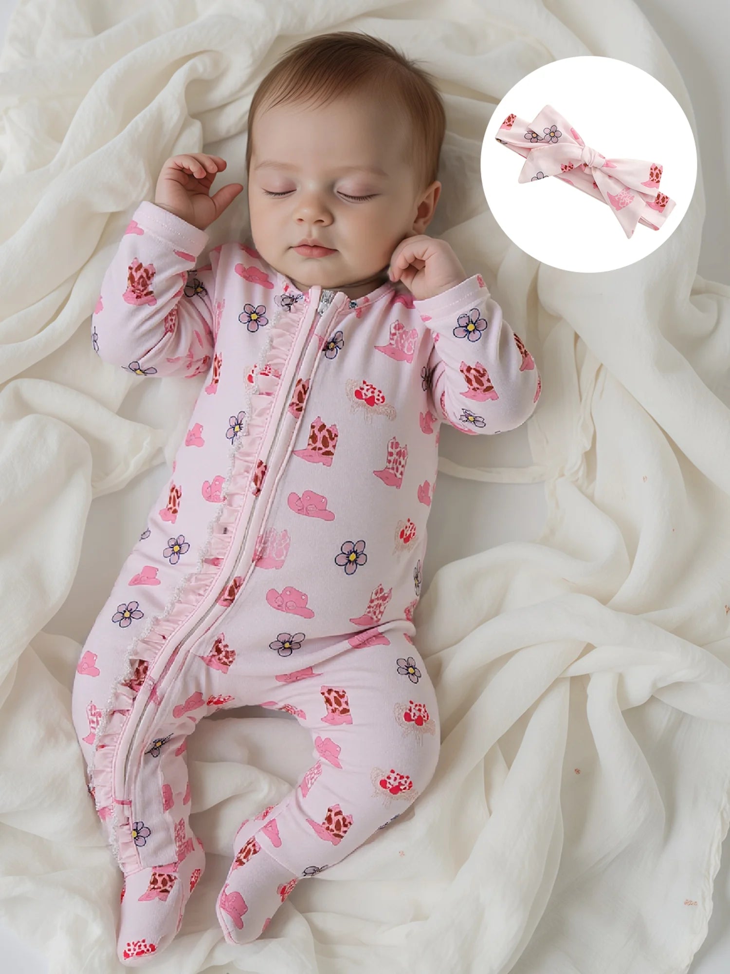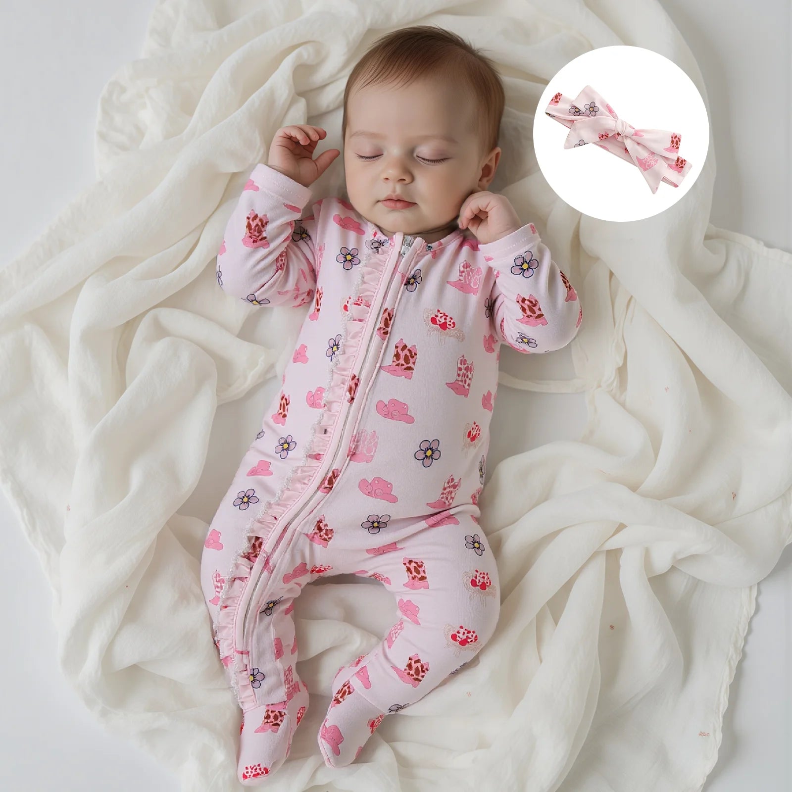 Baby Fall Winter Romper with Floral Hat Print - Zip Up Footed Jumpsuit & Headband (0-18M)