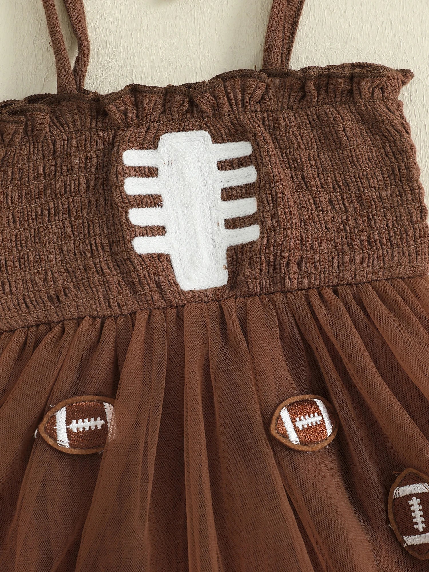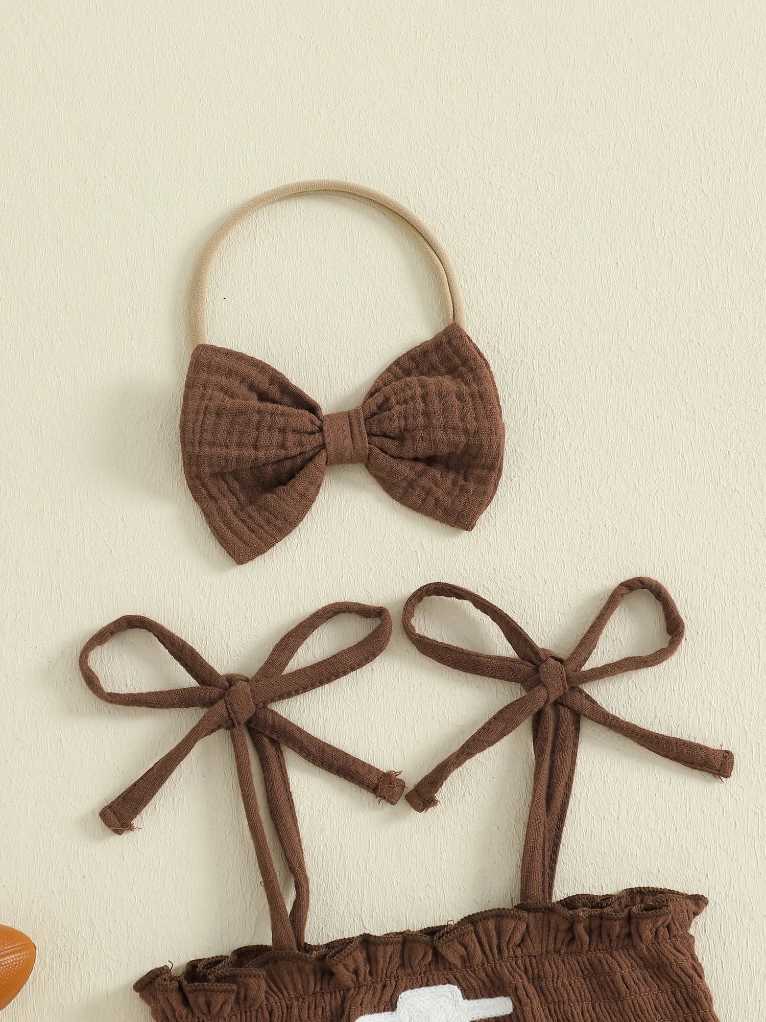 This charming outfit features a tie-up sleeveless jumpsuit dress with sweet football embroidery detail, paired with a matching bow headband. Perfect for autumn and winter layering, this versatile romper dress can be styled with cardigans or worn on its own during warmer days.