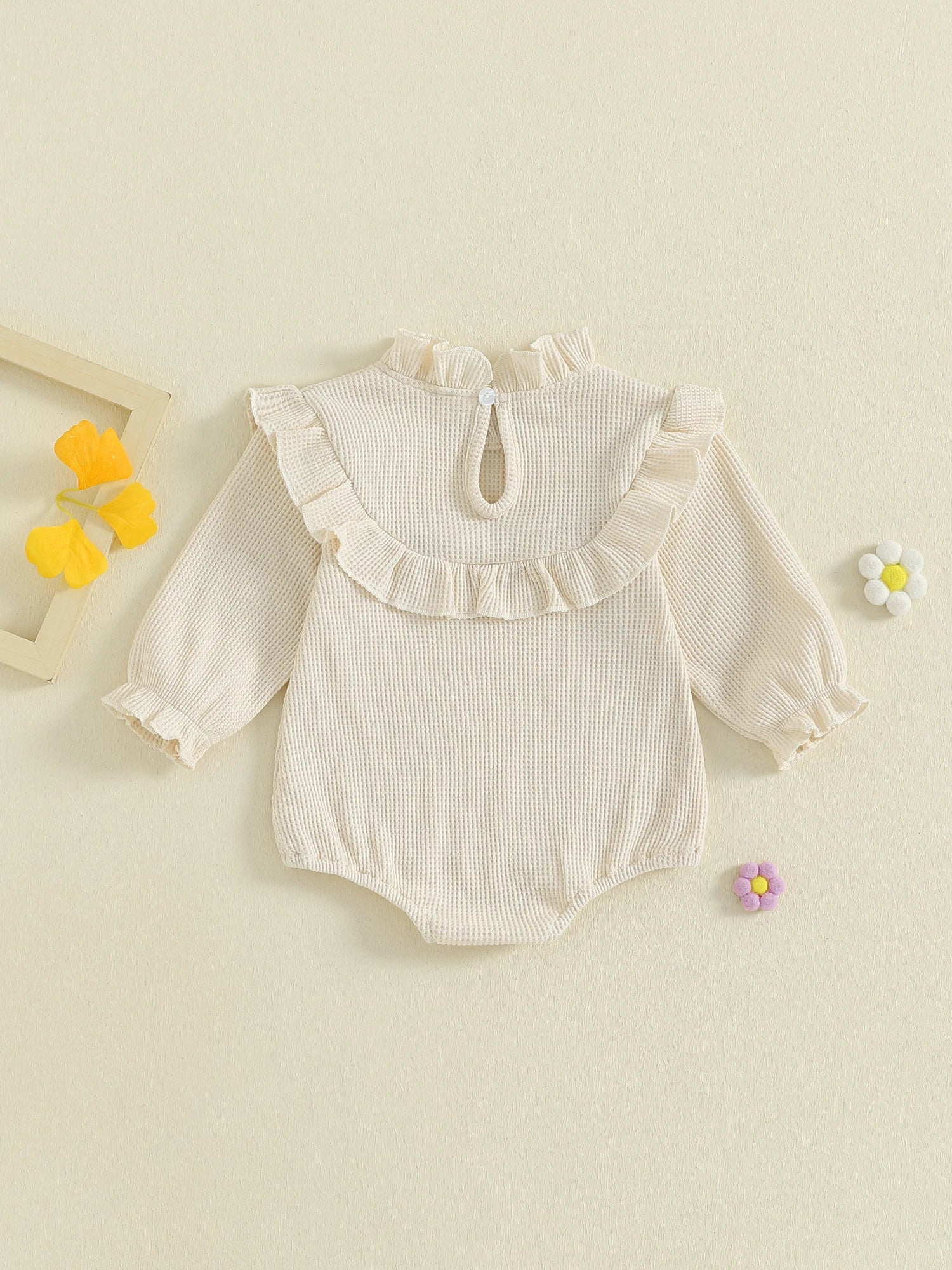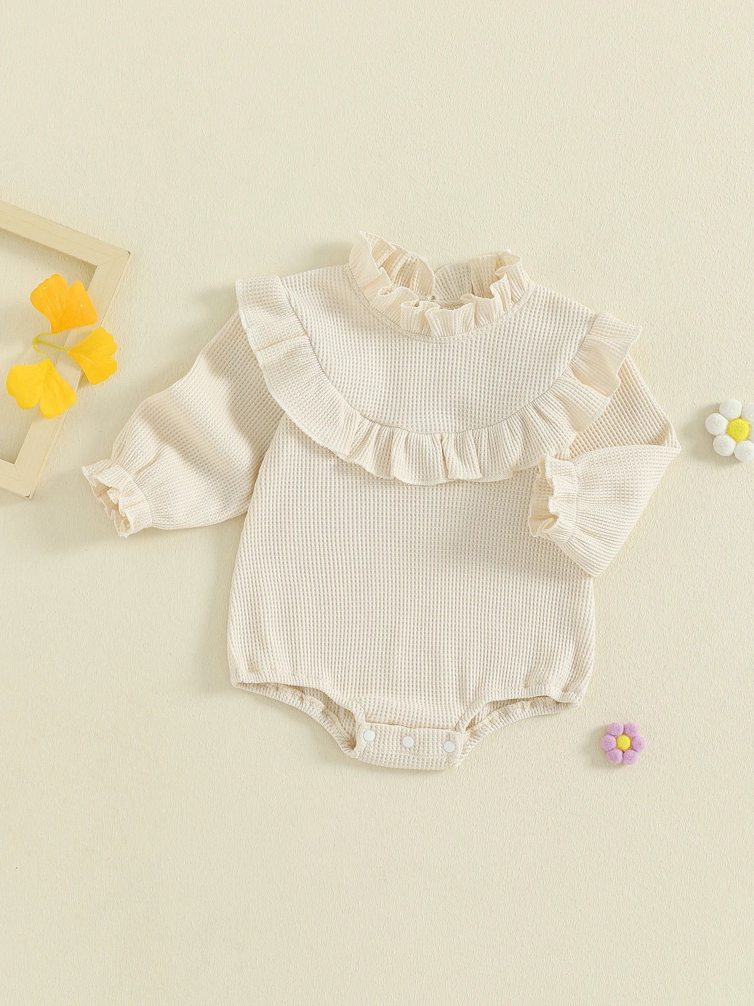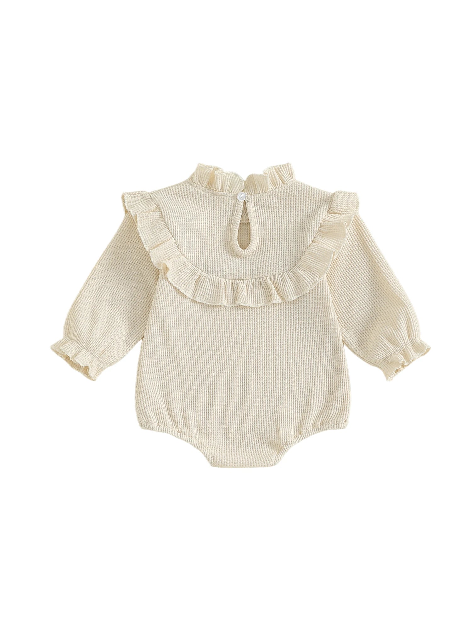 This charming waffle-textured romper is perfect for keeping your little one cosy and stylish during the cooler months. Featuring a cute mock neck design with delicate ruffled details, this solid colour jumpsuit combines comfort with timeless elegance for newborns and babies up to 18 months.