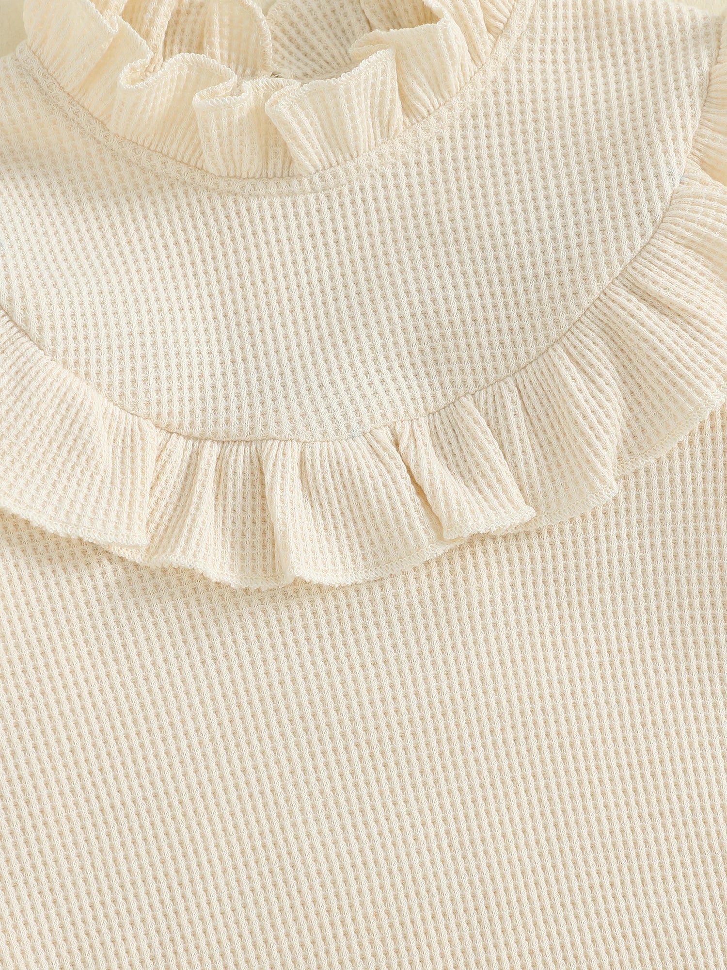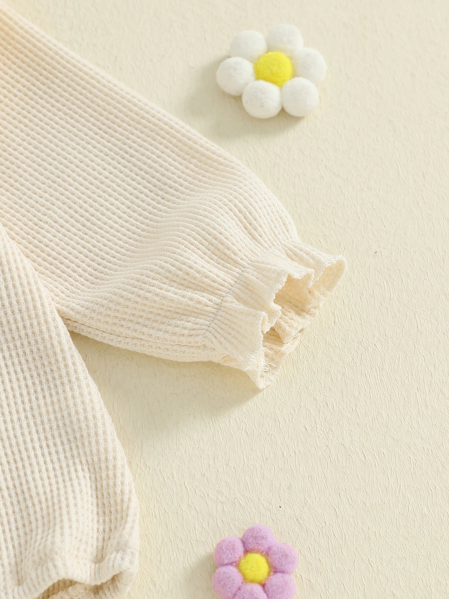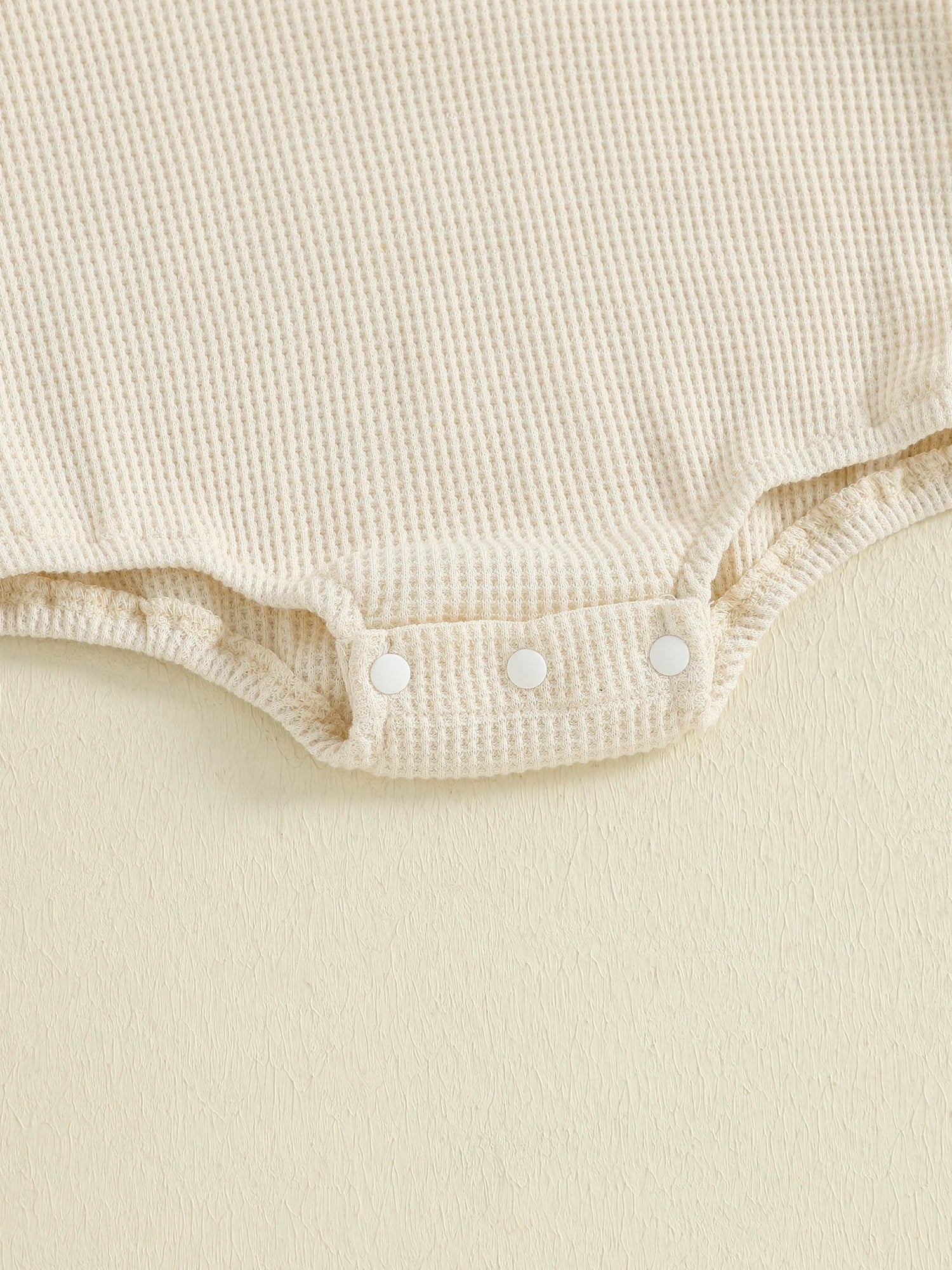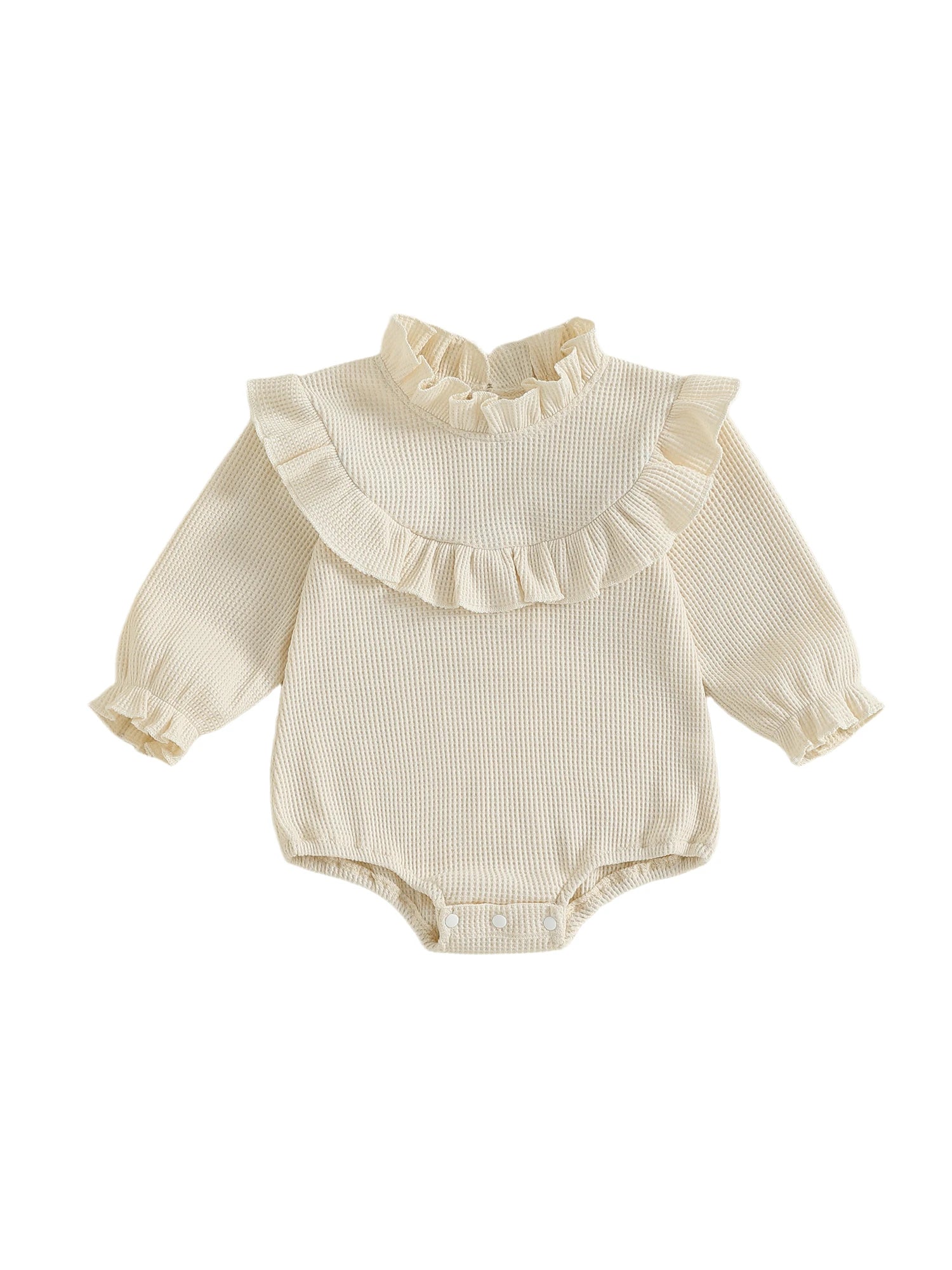 This charming waffle-textured romper is perfect for keeping your little one cosy and stylish during the cooler months. Featuring a cute mock neck design with delicate ruffled details, this solid colour jumpsuit combines comfort with timeless elegance for newborns and babies up to 18 months.