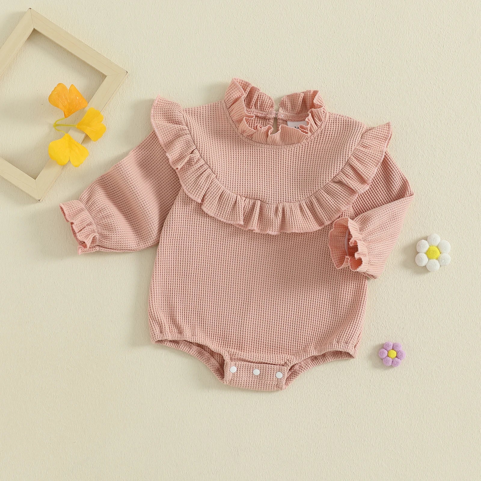 Newborn Baby Girls Waffle Romper - Long Sleeve Mock Neck Ruffled Jumpsuit