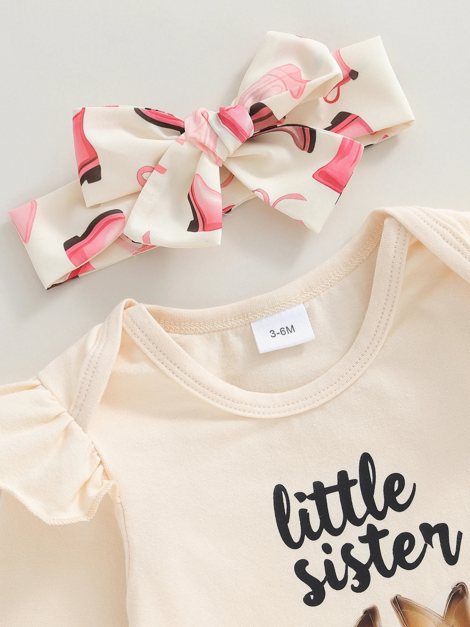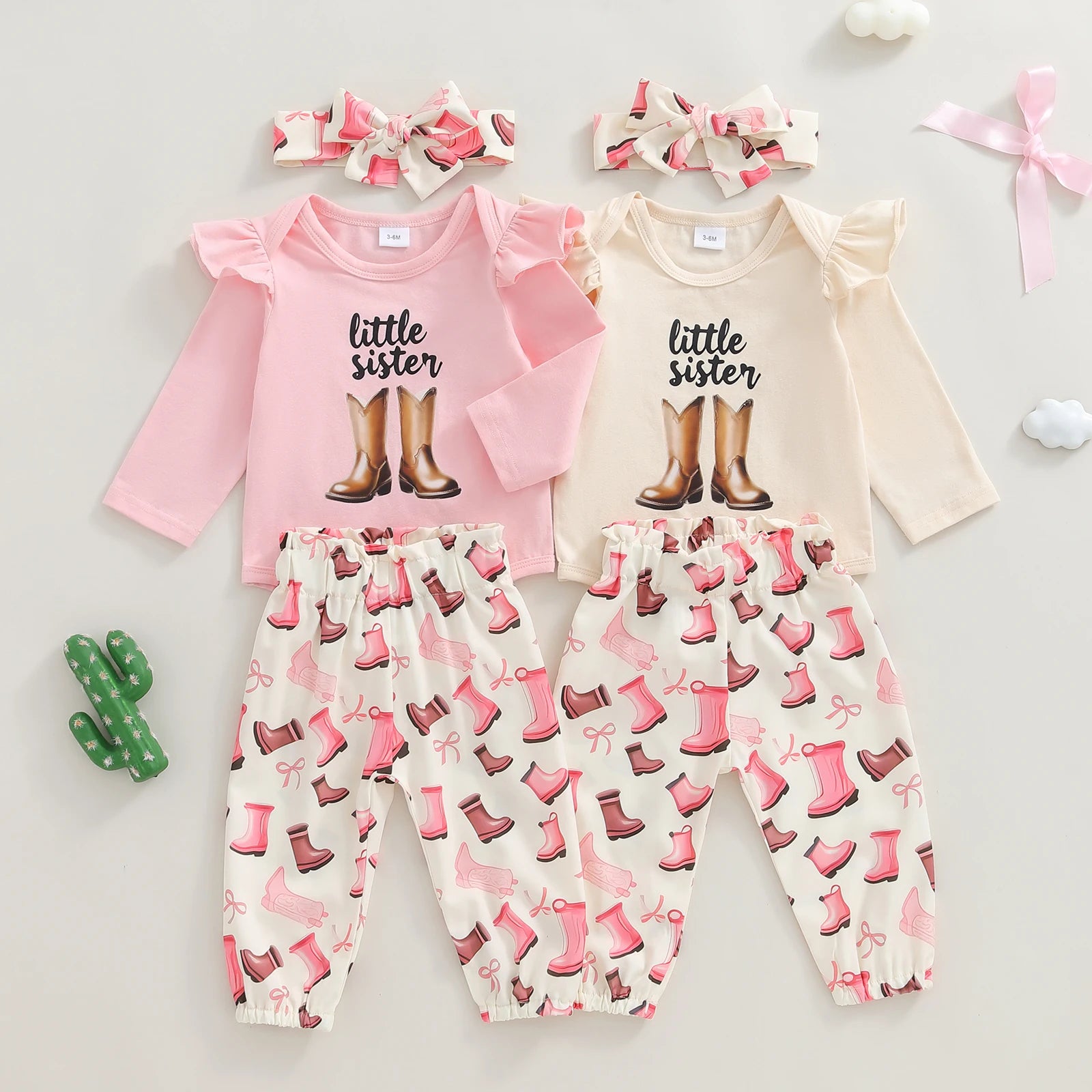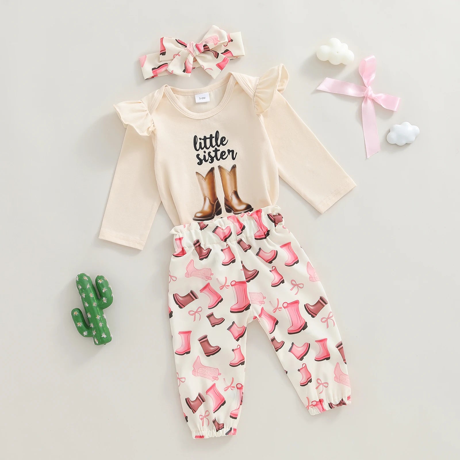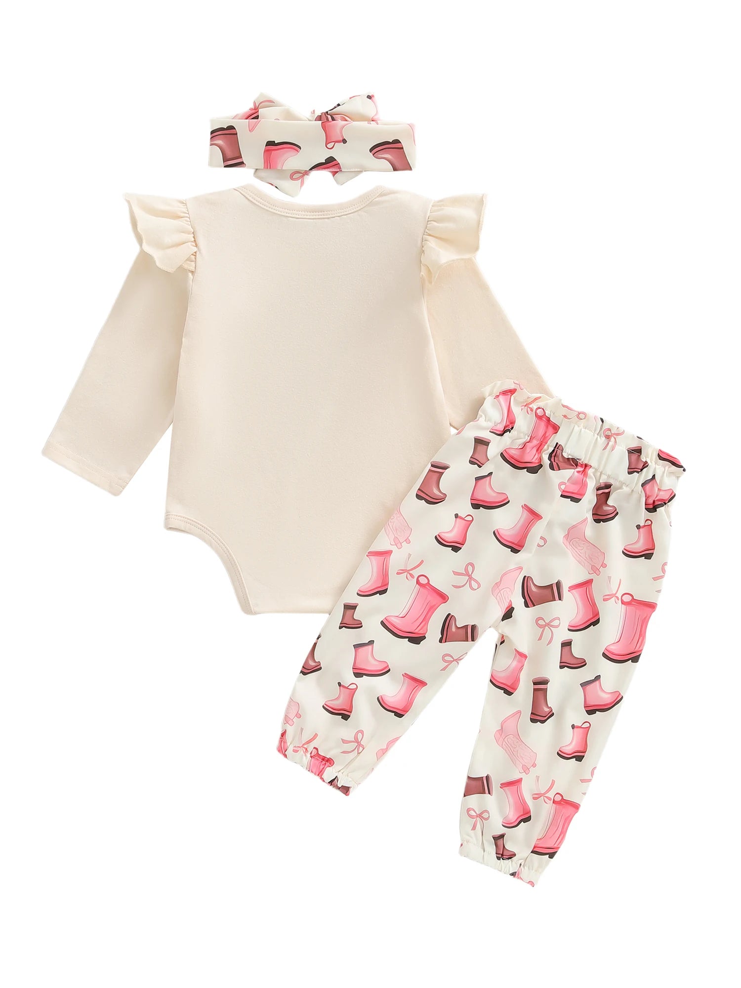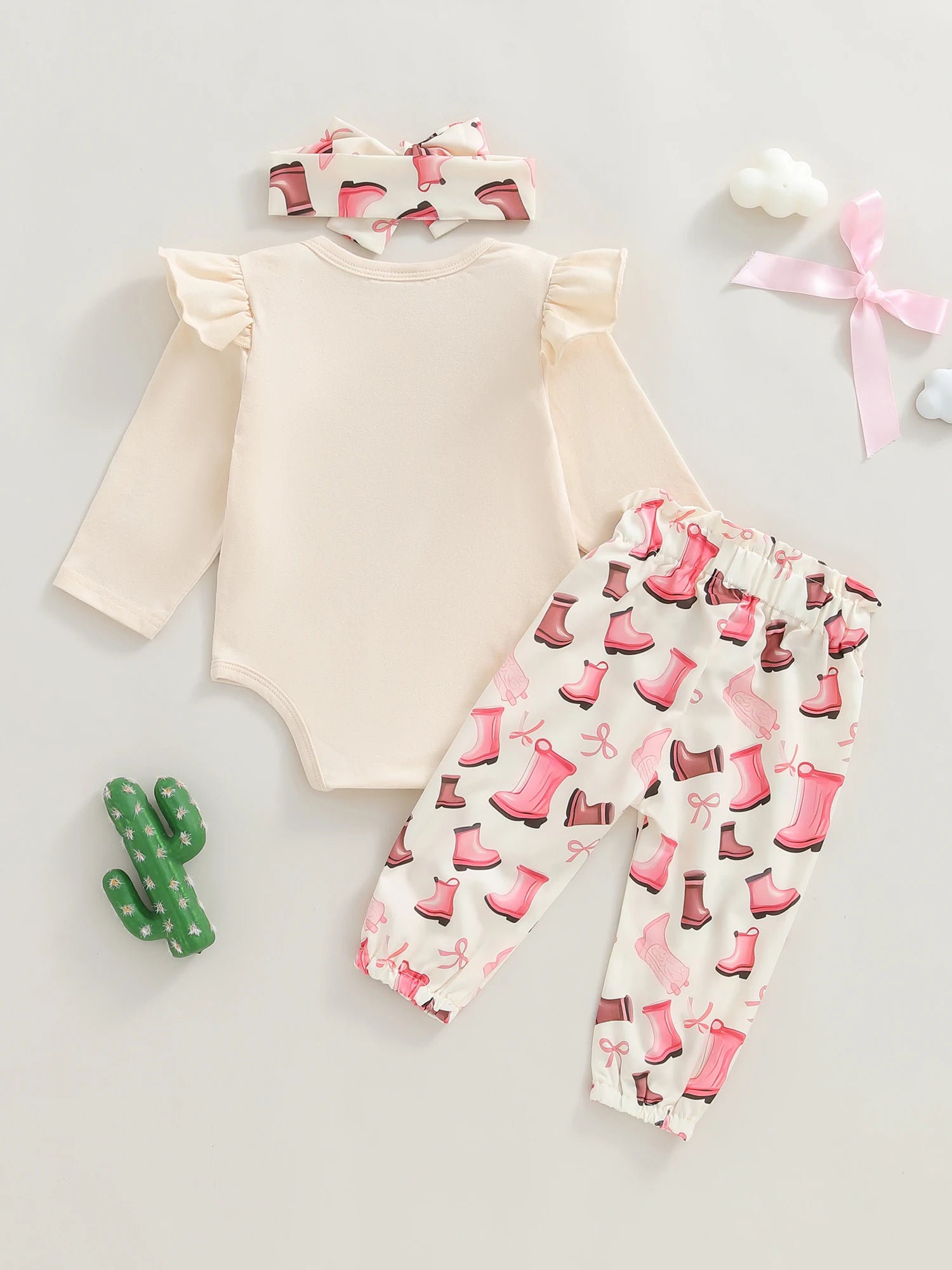 Baby Girls Western Fall Winter Outfit Set - Long Sleeve Romper, Boot Print Pants & Bow Headband (0-18M)