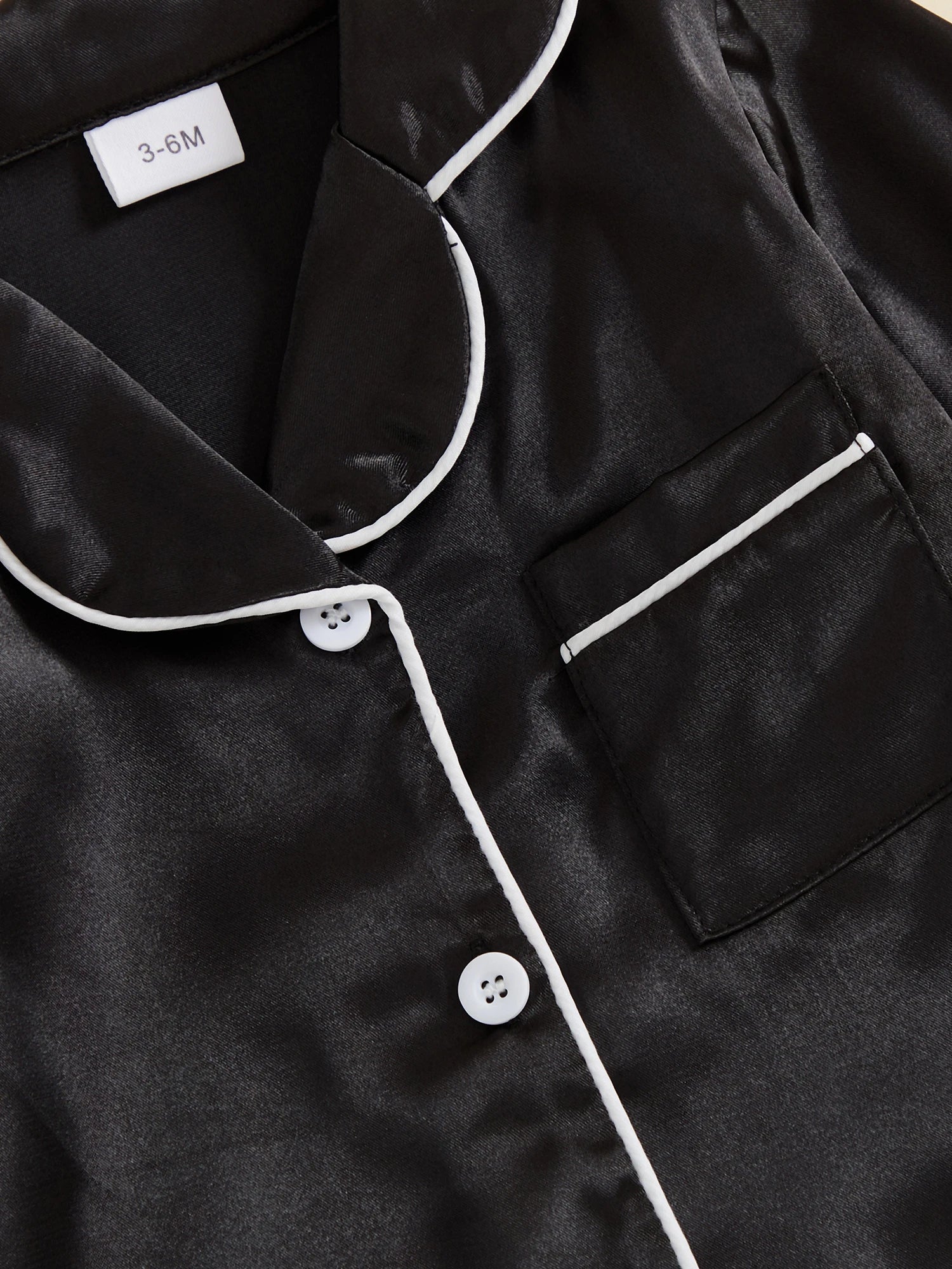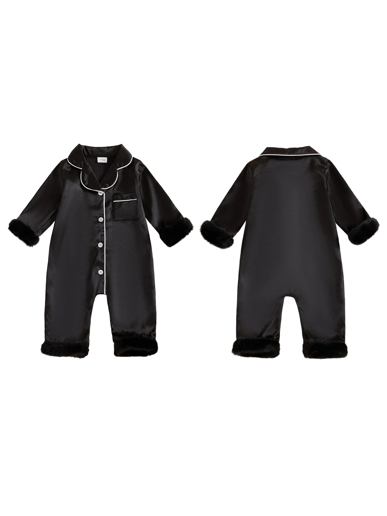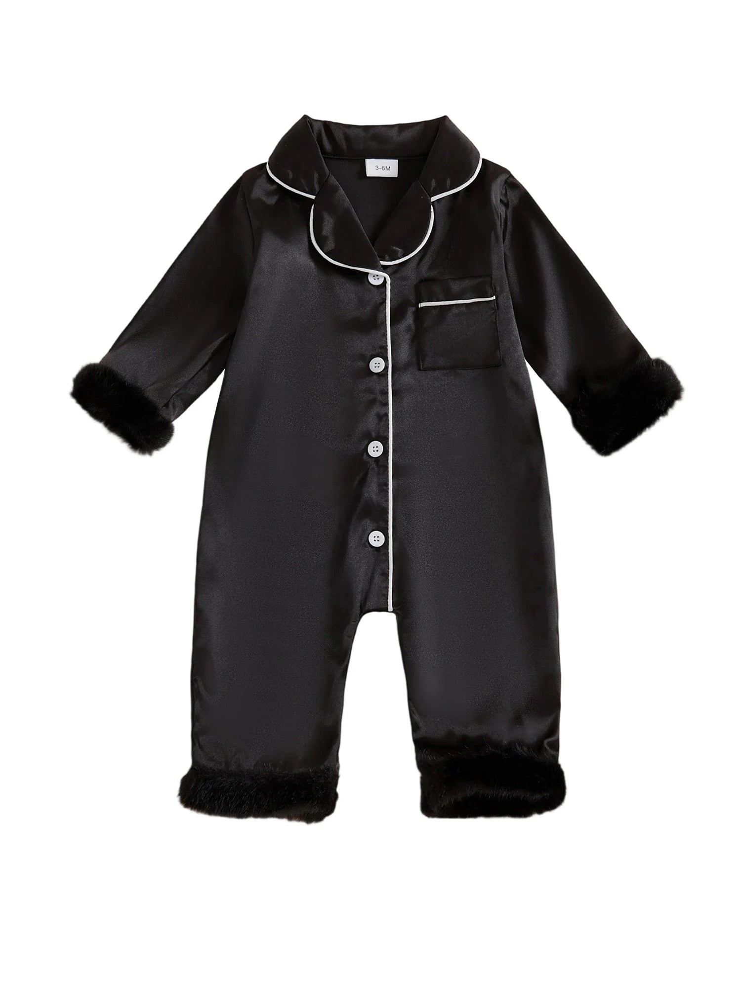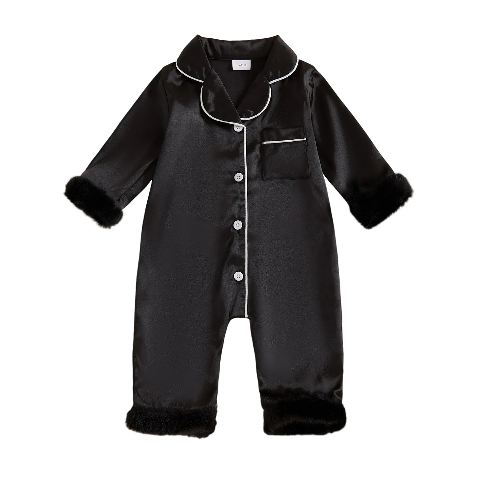 Treat your little one to ultimate comfort with this elegant satin pajama romper. Features soft fur trim and sophisticated contrast detailing for a premium sleepwear experience.