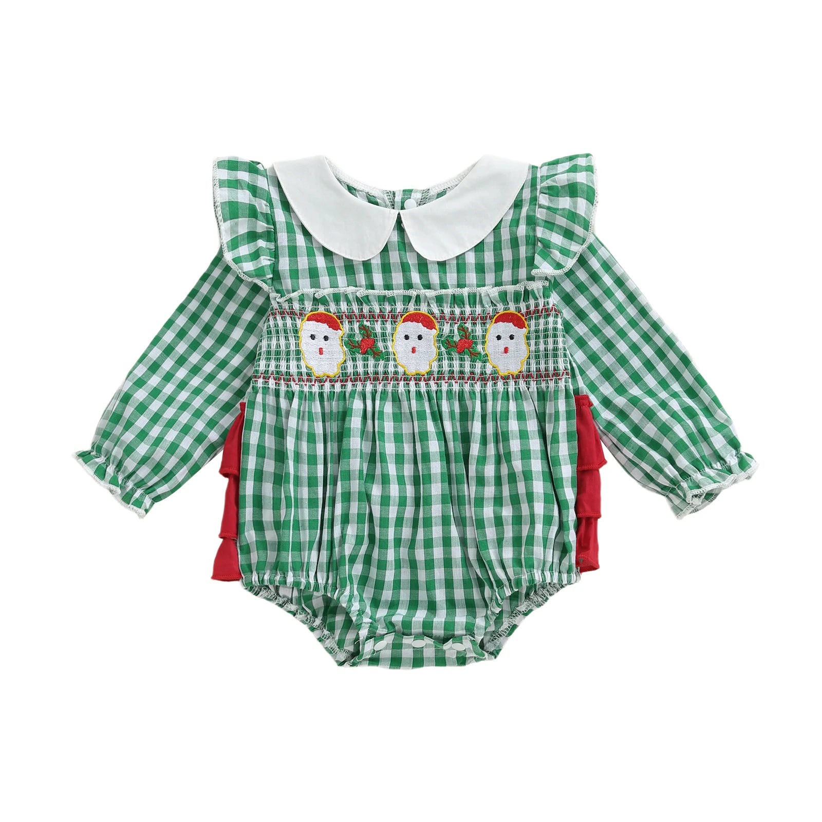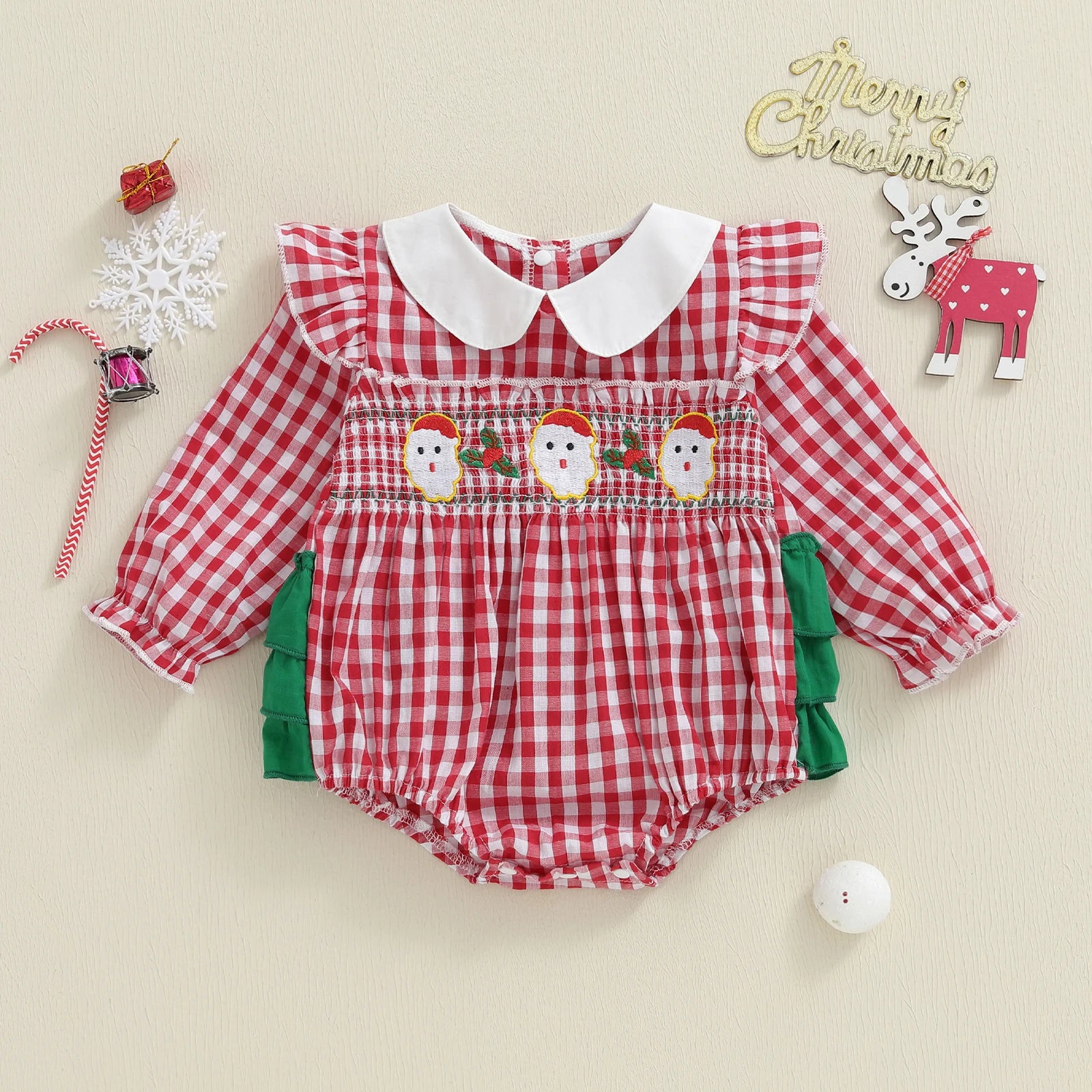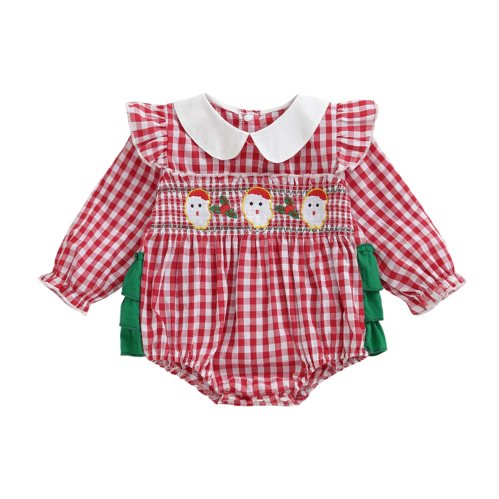 Dress your little one in festive style with this charming plaid Christmas romper featuring delightful Santa embroidery. Perfect for holiday gatherings, family photos, and creating precious Christmas memories.