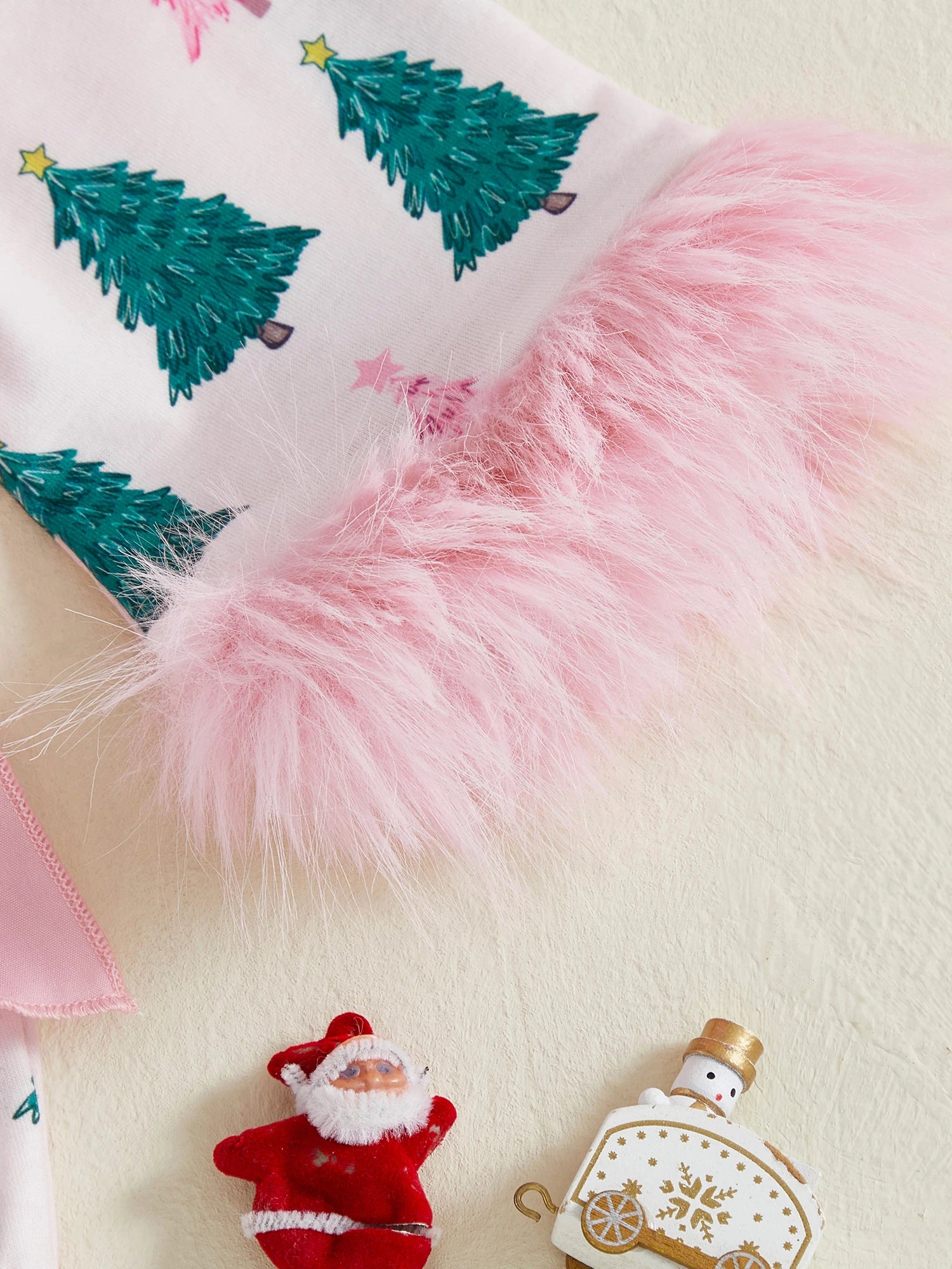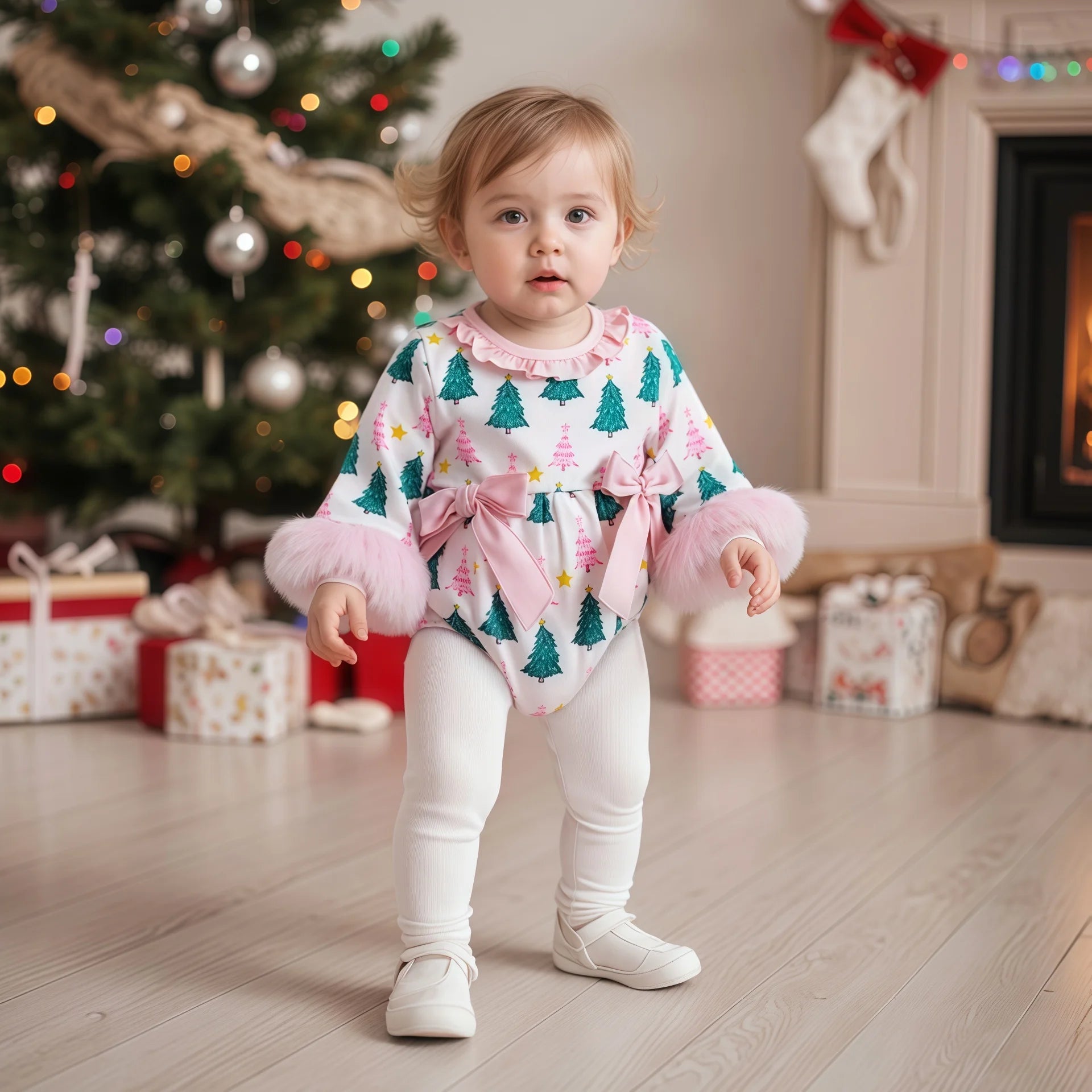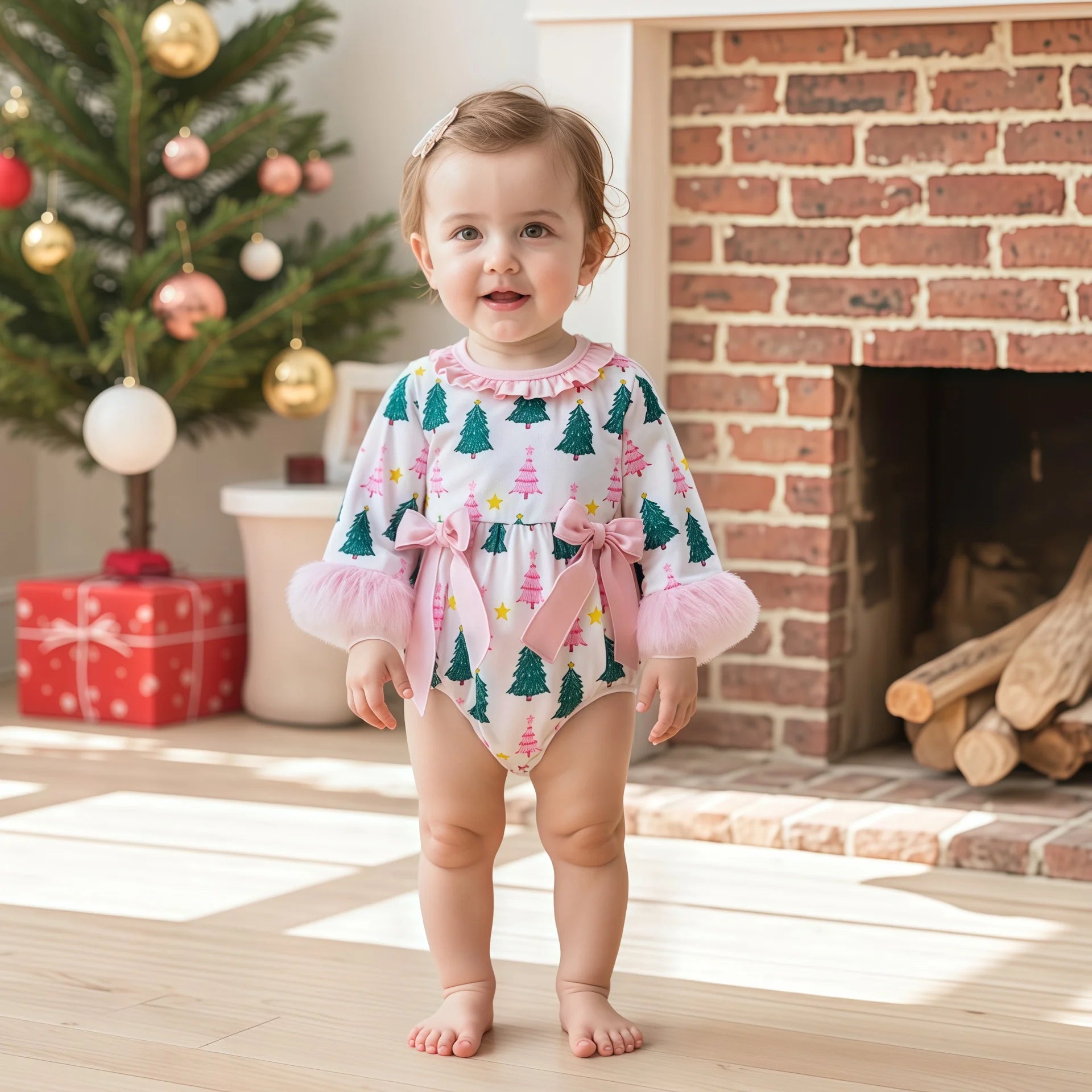 Make your little one the star of Christmas celebrations with this charming festive romper. Featuring delightful Christmas tree prints and elegant ruffled details, this long-sleeve jumpsuit is perfect for holiday photos and family gatherings.