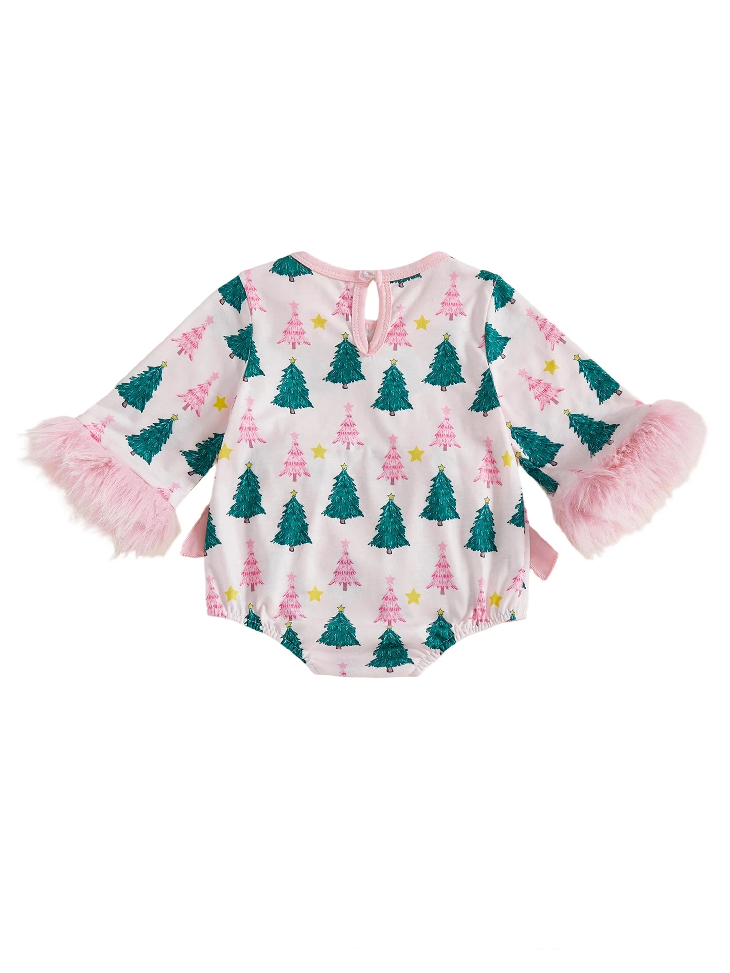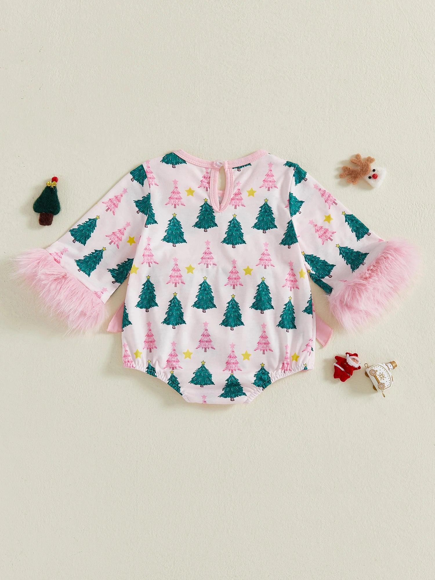 Baby Girls' Christmas Tree Print Romper - Festive Long Sleeve Jumpsuit