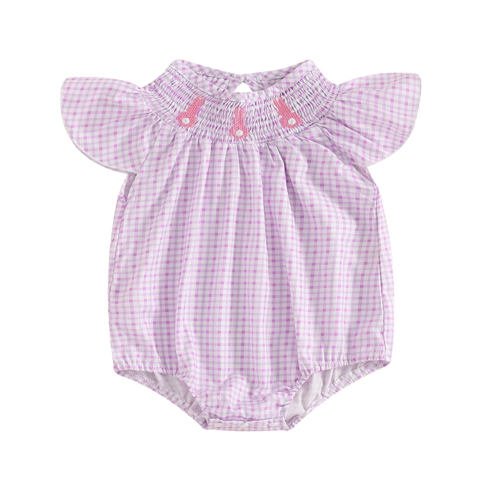 Celebrate Easter in style with this charming plaid romper featuring sweet rabbit embroidery and delicate ruffled fly sleeves. The smocked design and collar detail create a classic, timeless look perfect for spring celebrations.