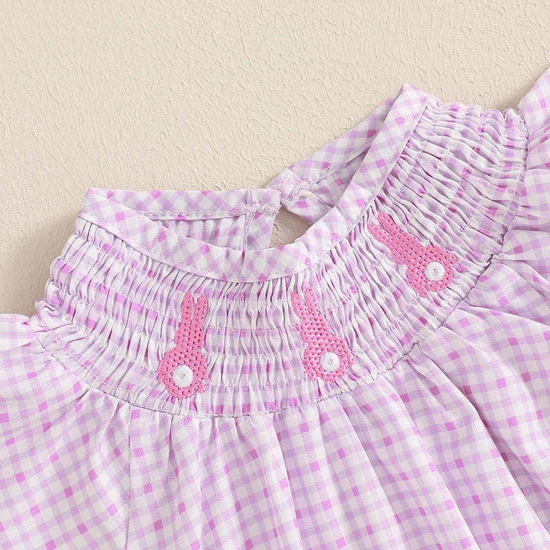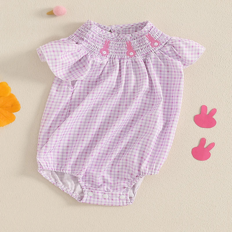 Baby Girls Easter Romper - Rabbit Embroidery Plaid Smocked Jumpsuit