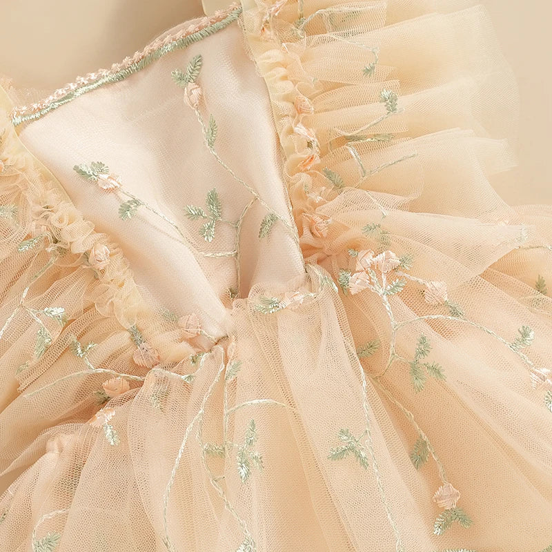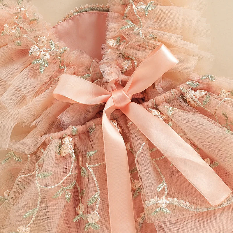 Baby Girls Summer Romper Dress with Headband - Floral Embroidery Tulle Jumpsuit