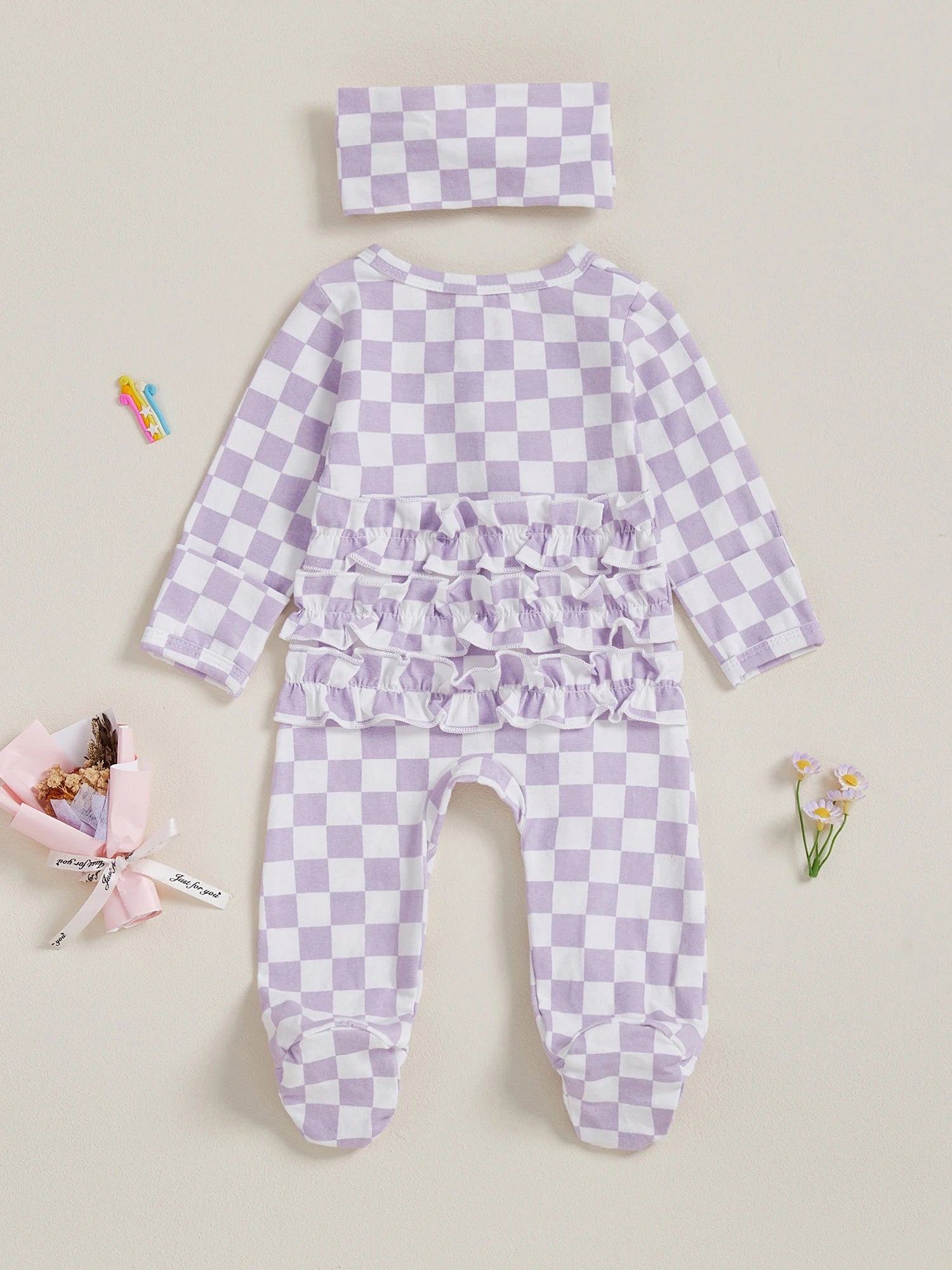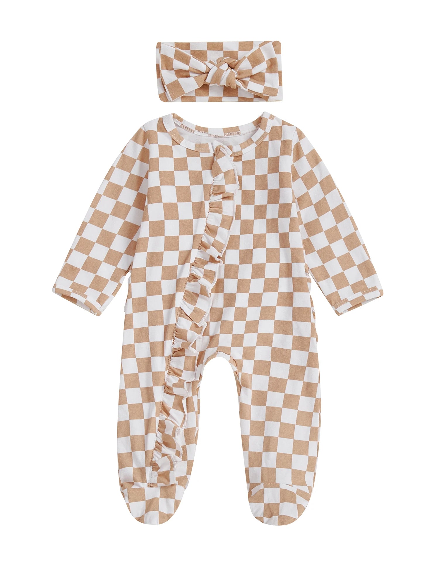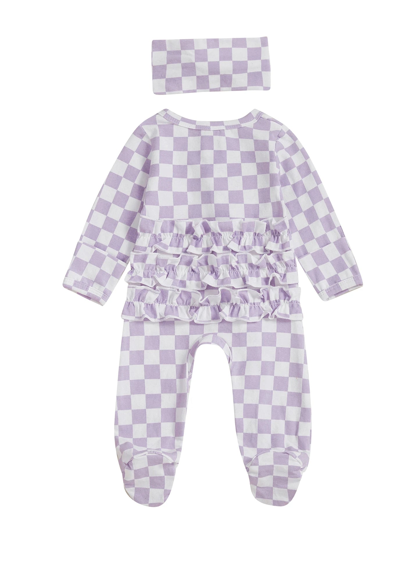 Welcome your little one in style with this charming 2-piece footie set. Featuring a trendy checkerboard pattern with delicate ruffled trim and a matching headband, this cosy outfit is perfect for autumn days and special occasions.