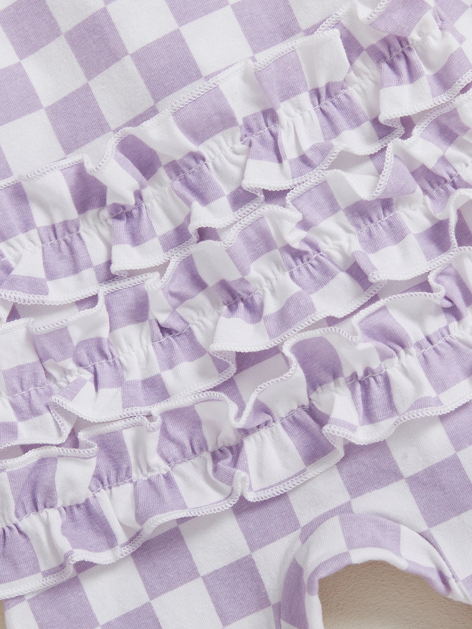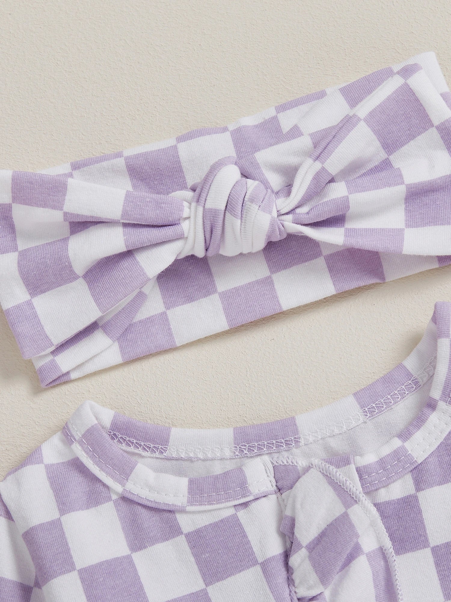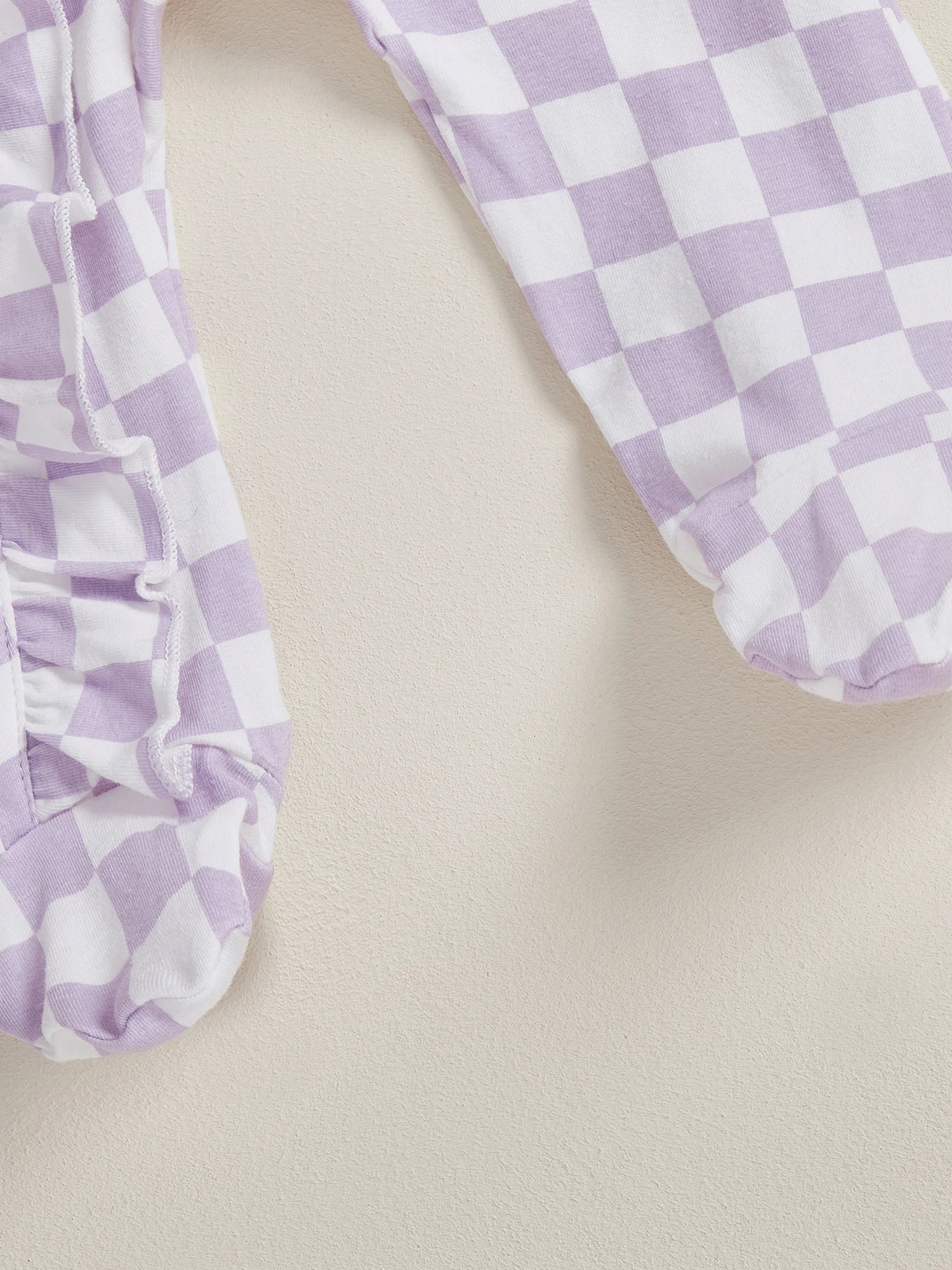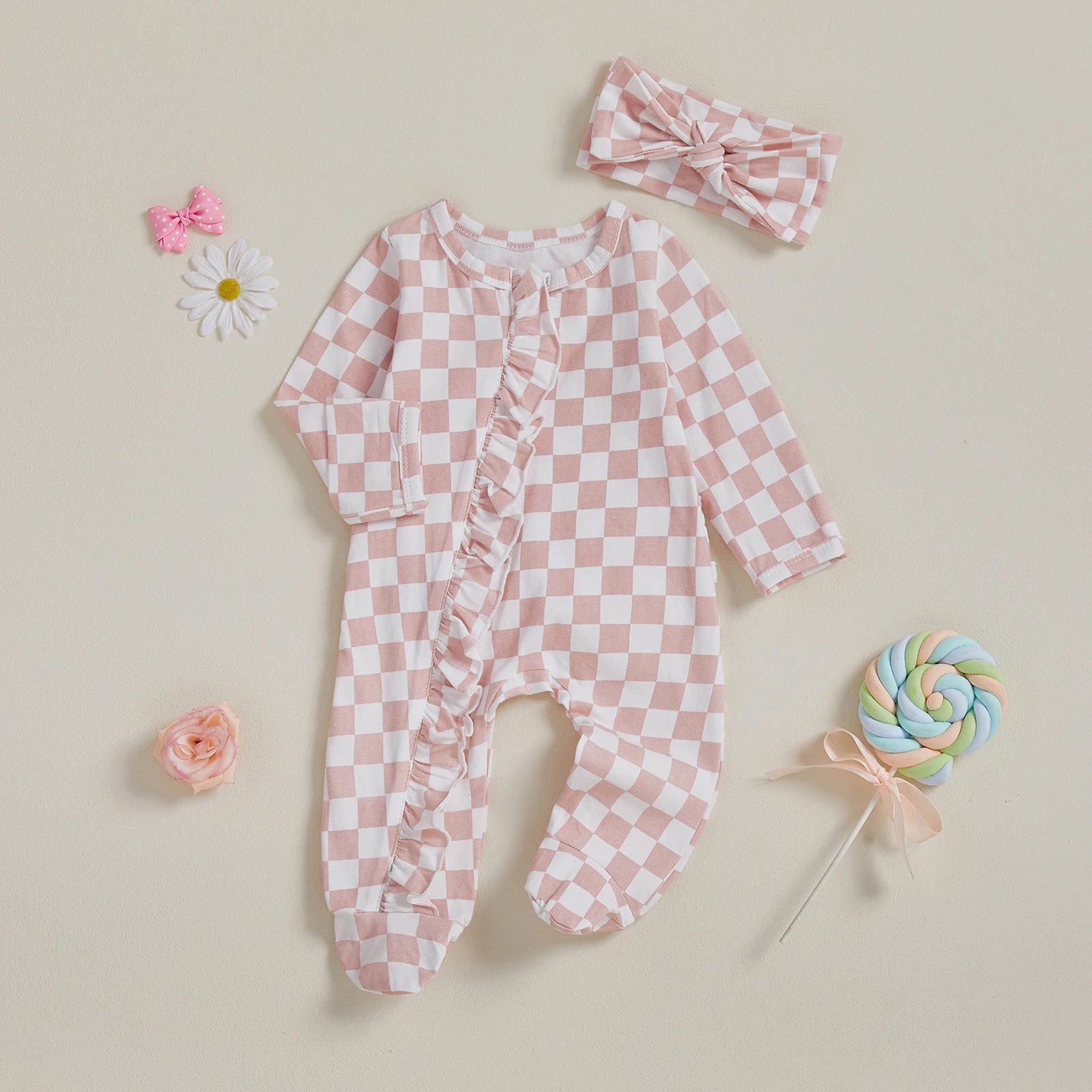 Welcome your little one in style with this charming 2-piece footie set. Featuring a trendy checkerboard pattern with delicate ruffled trim and a matching headband, this cosy outfit is perfect for autumn days and special occasions.
