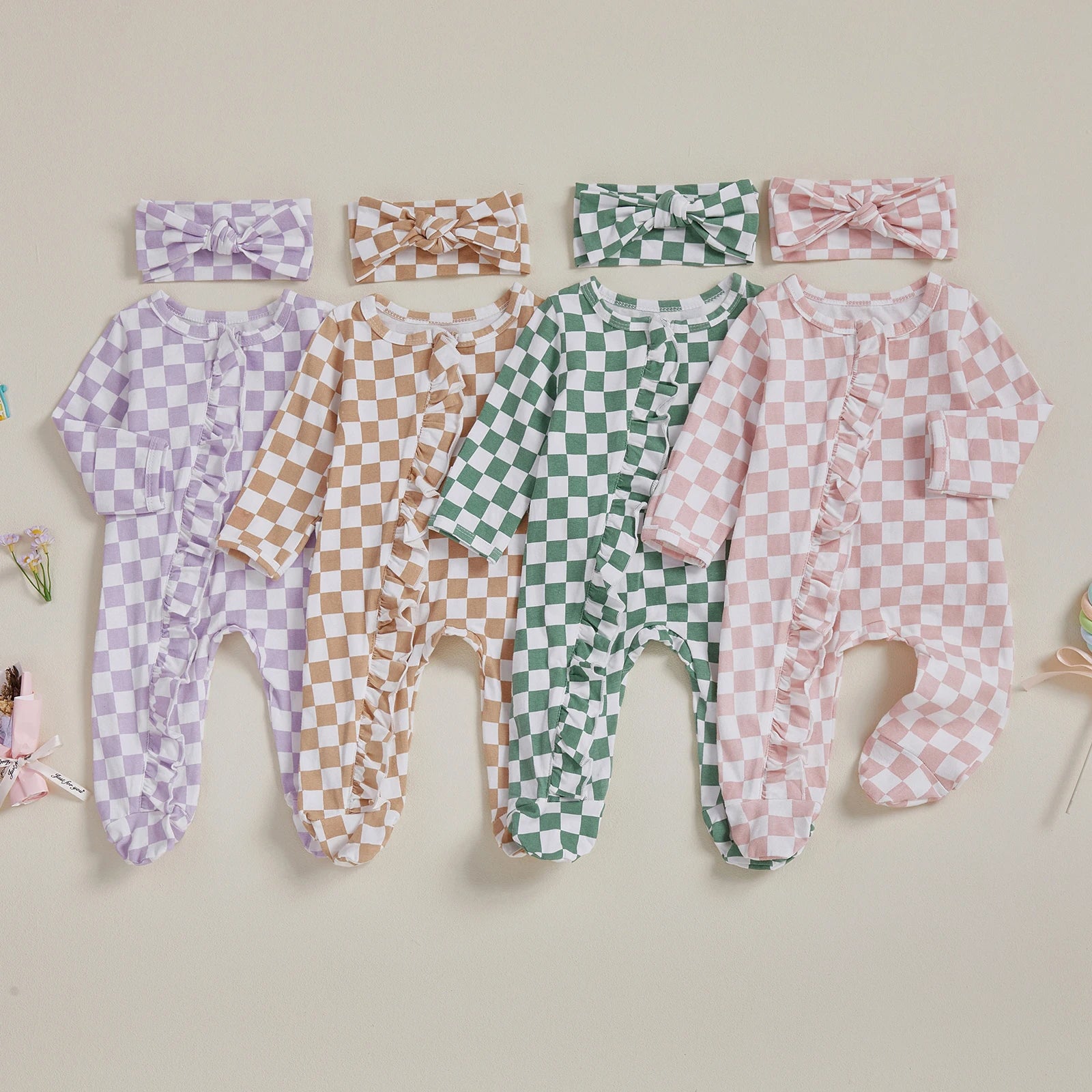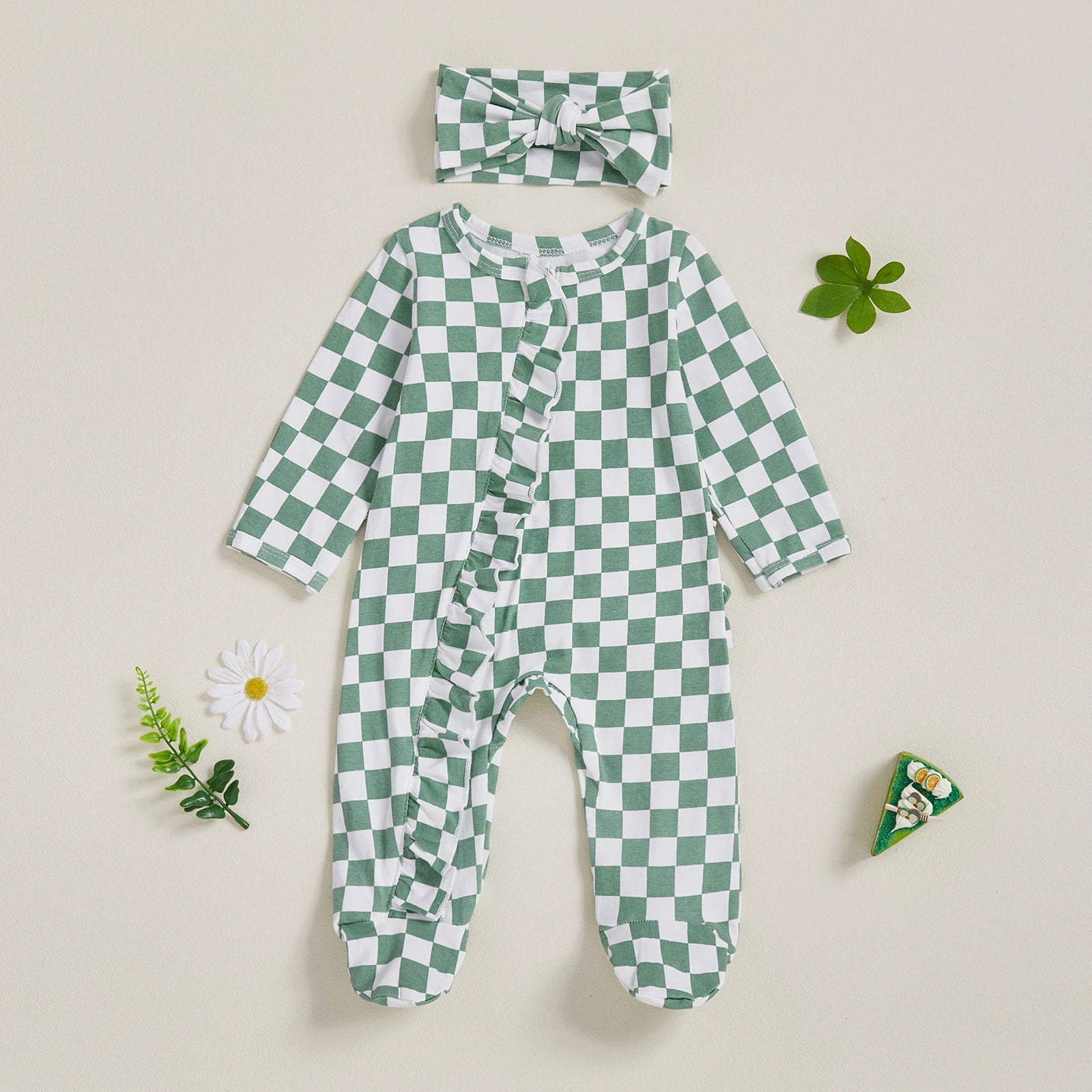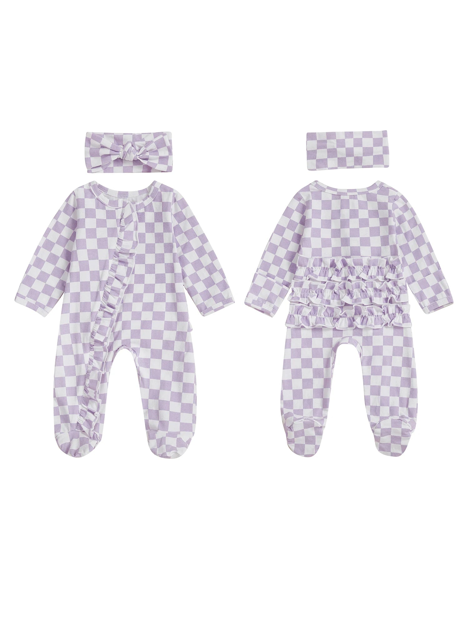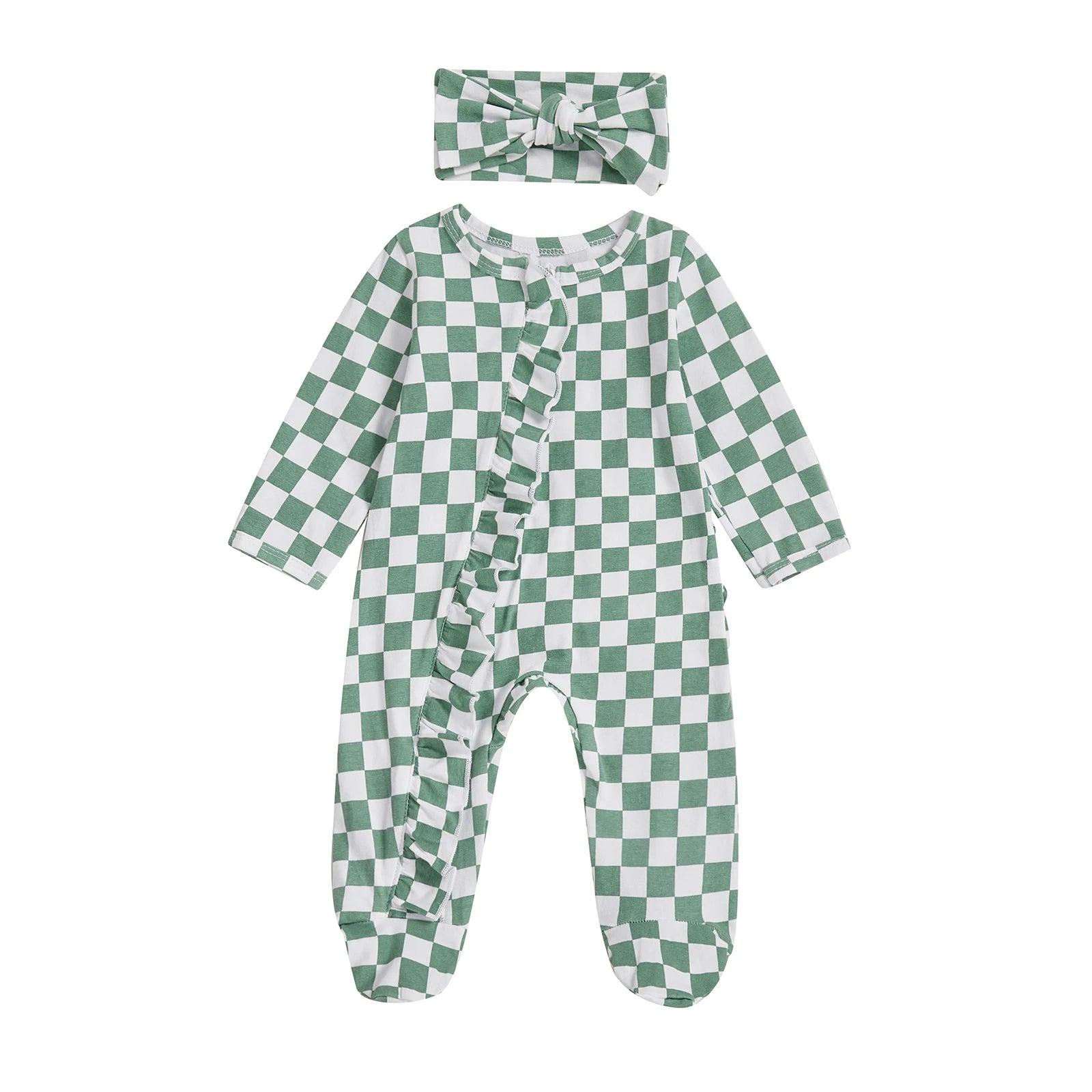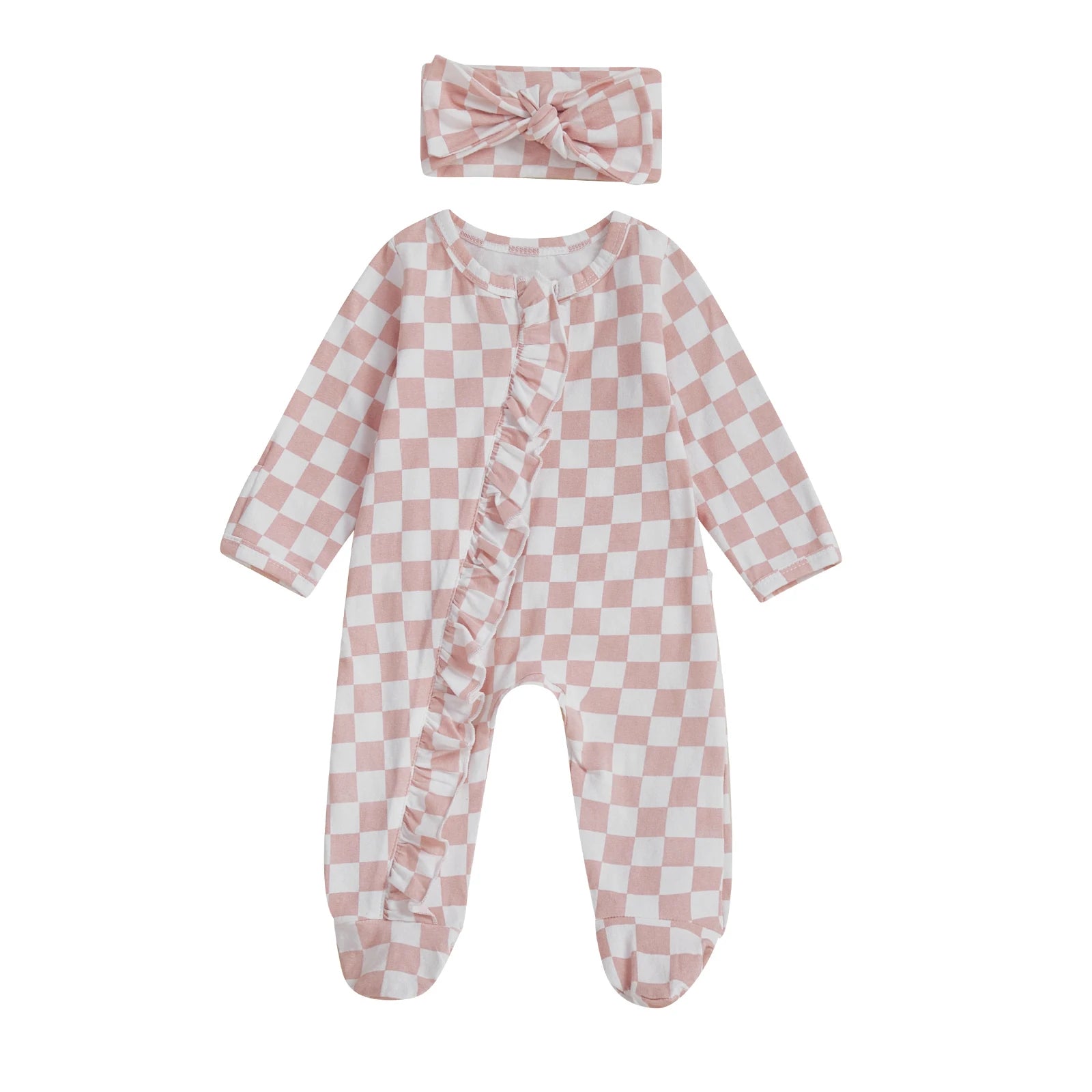 Newborn Baby Footie Set with Headband - Checkerboard Ruffled Zip Front Jumpsuit