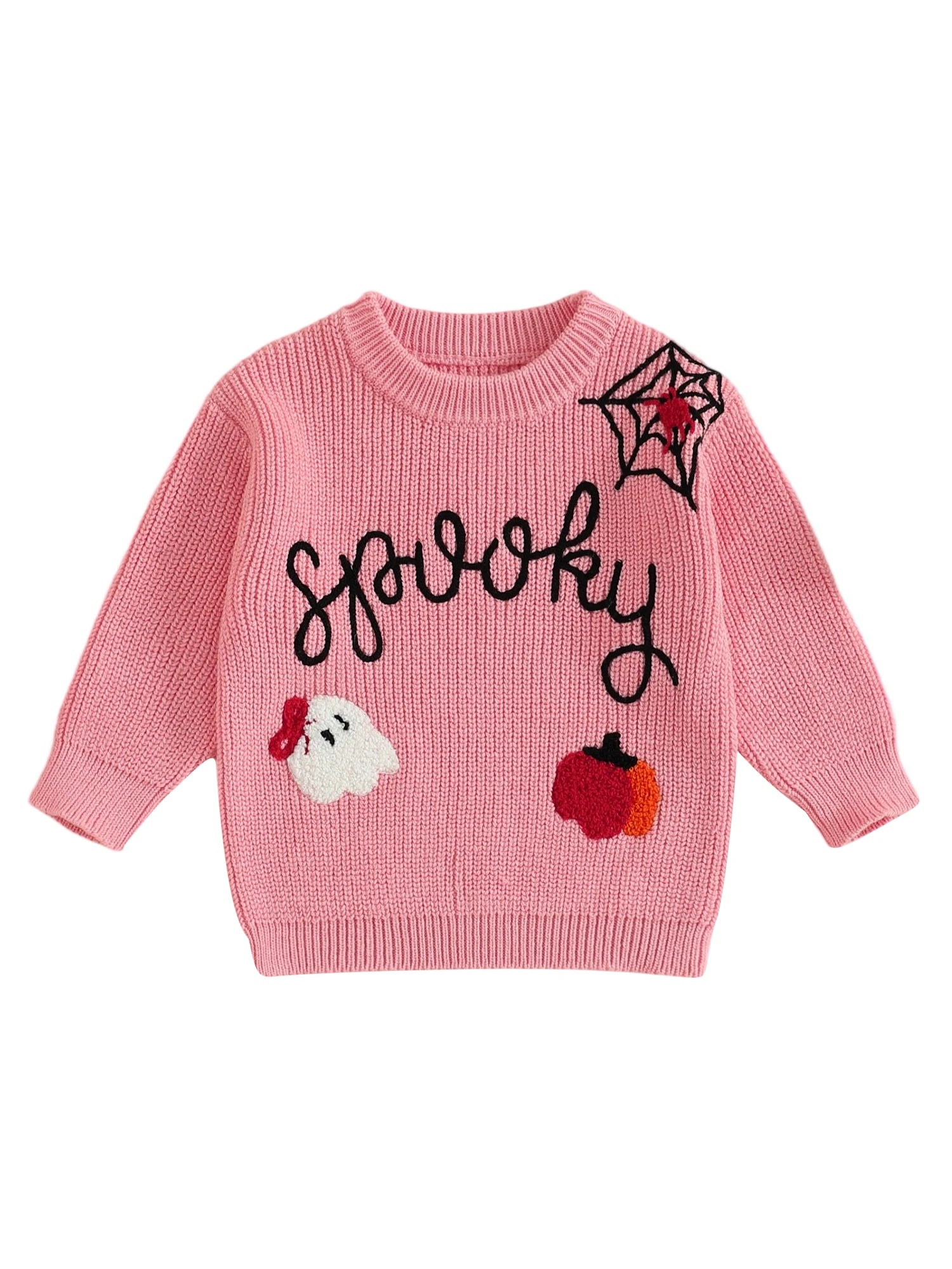 Get your little one ready for Halloween celebrations with this charming knit sweater. Featuring delightful letter, ghost, pumpkin, and spider web embroidery, this long sleeve pullover is perfect for autumn and winter wear during the spooky season. Suitable for both baby girls and boys.