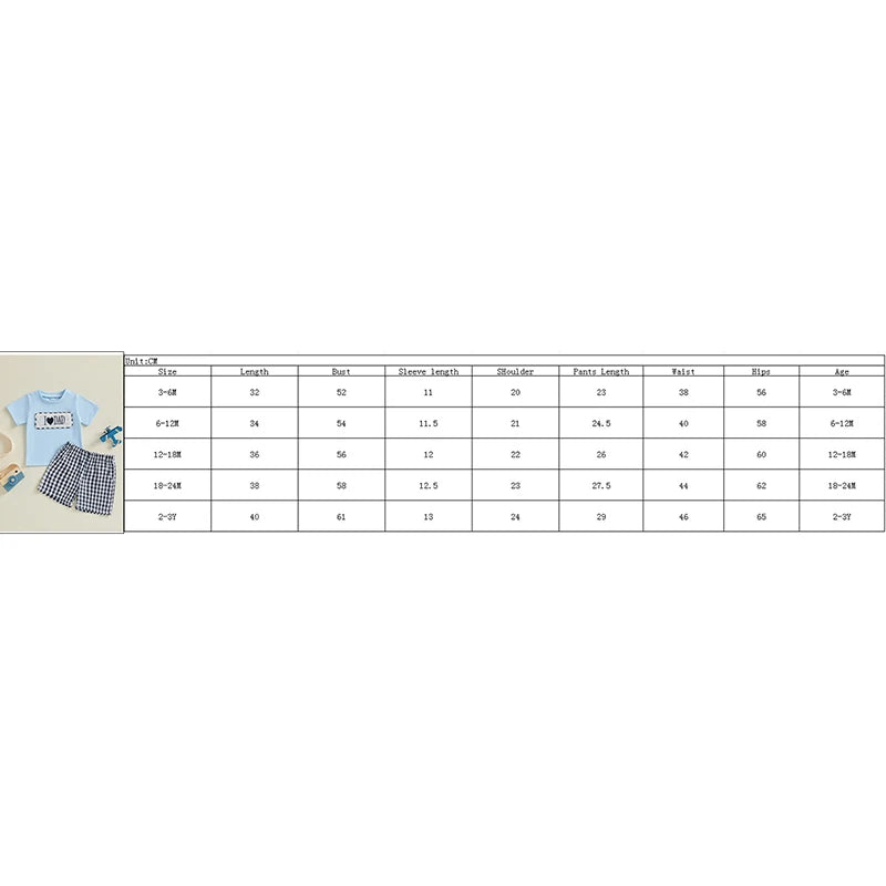 Make Father's Day extra special with this adorable 2-piece outfit set for baby boys. Featuring a sweet letter and heart embroidery short sleeve t-shirt paired with classic plaid shorts, this set is perfect for infants and toddlers aged 0-3 years to celebrate their special bond with Dad.