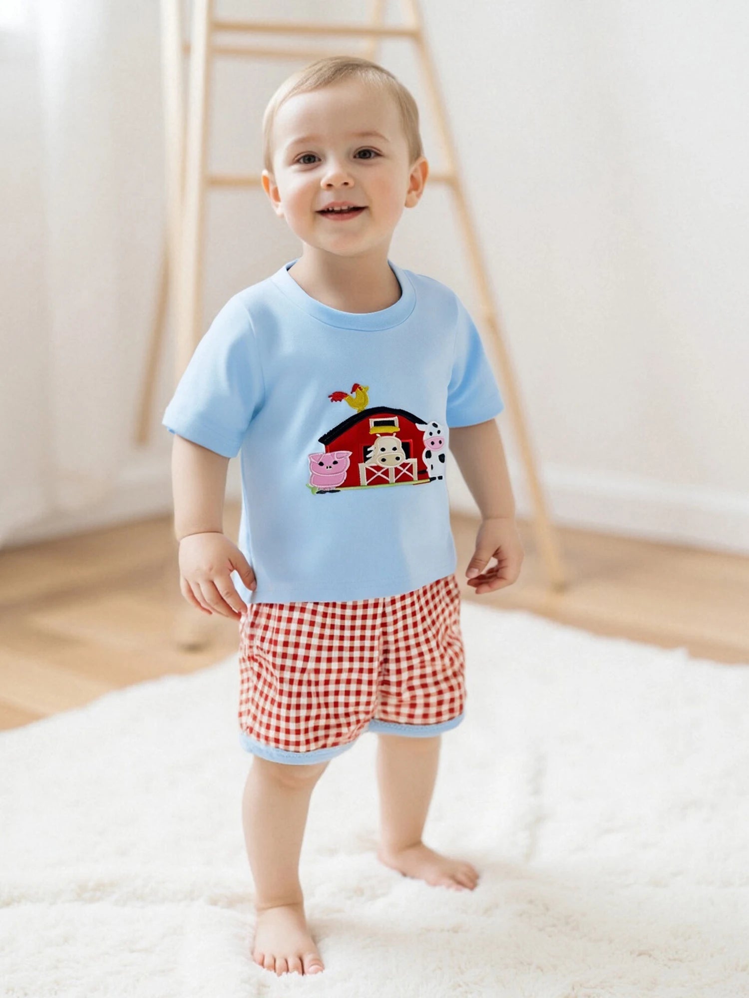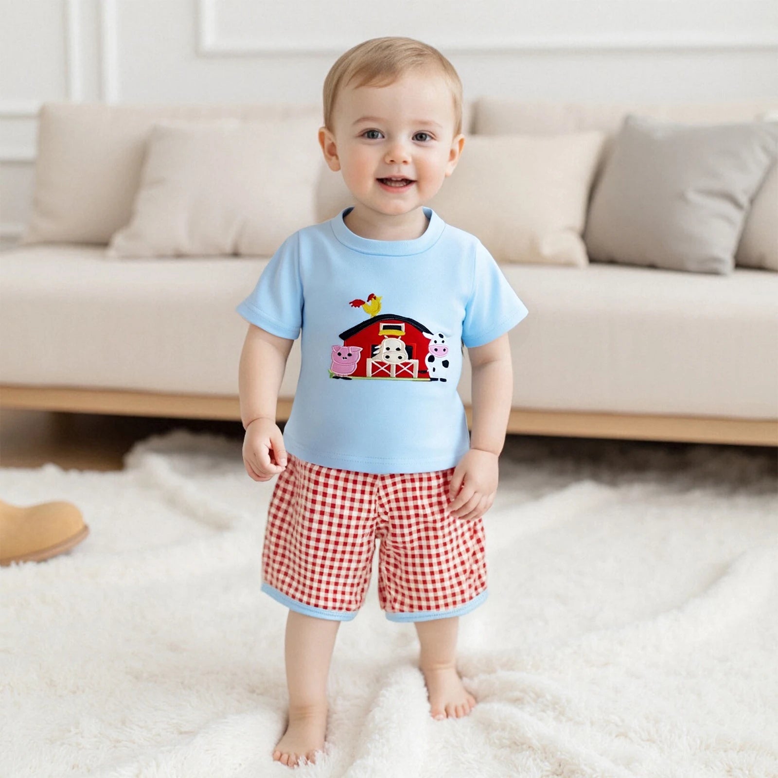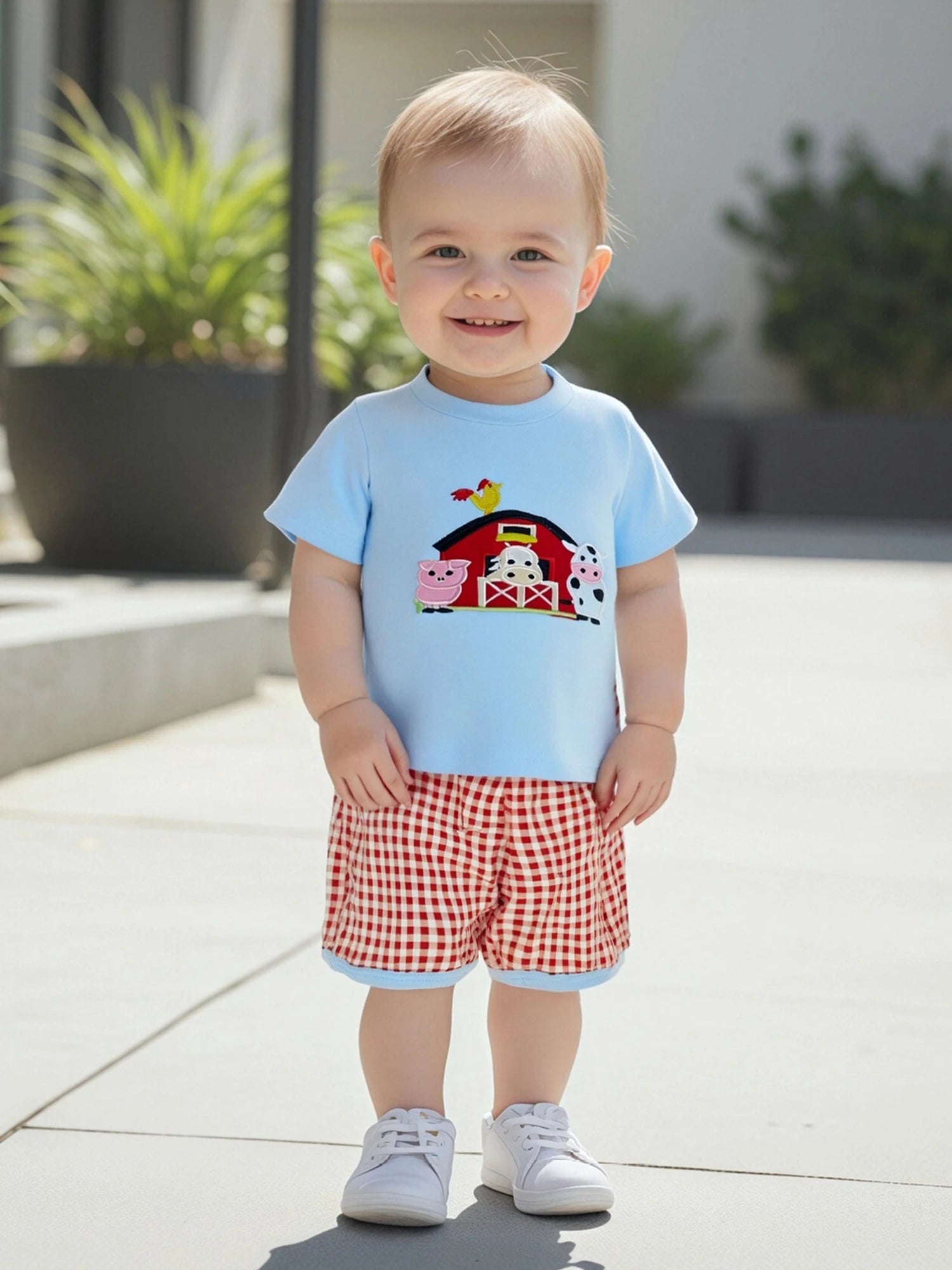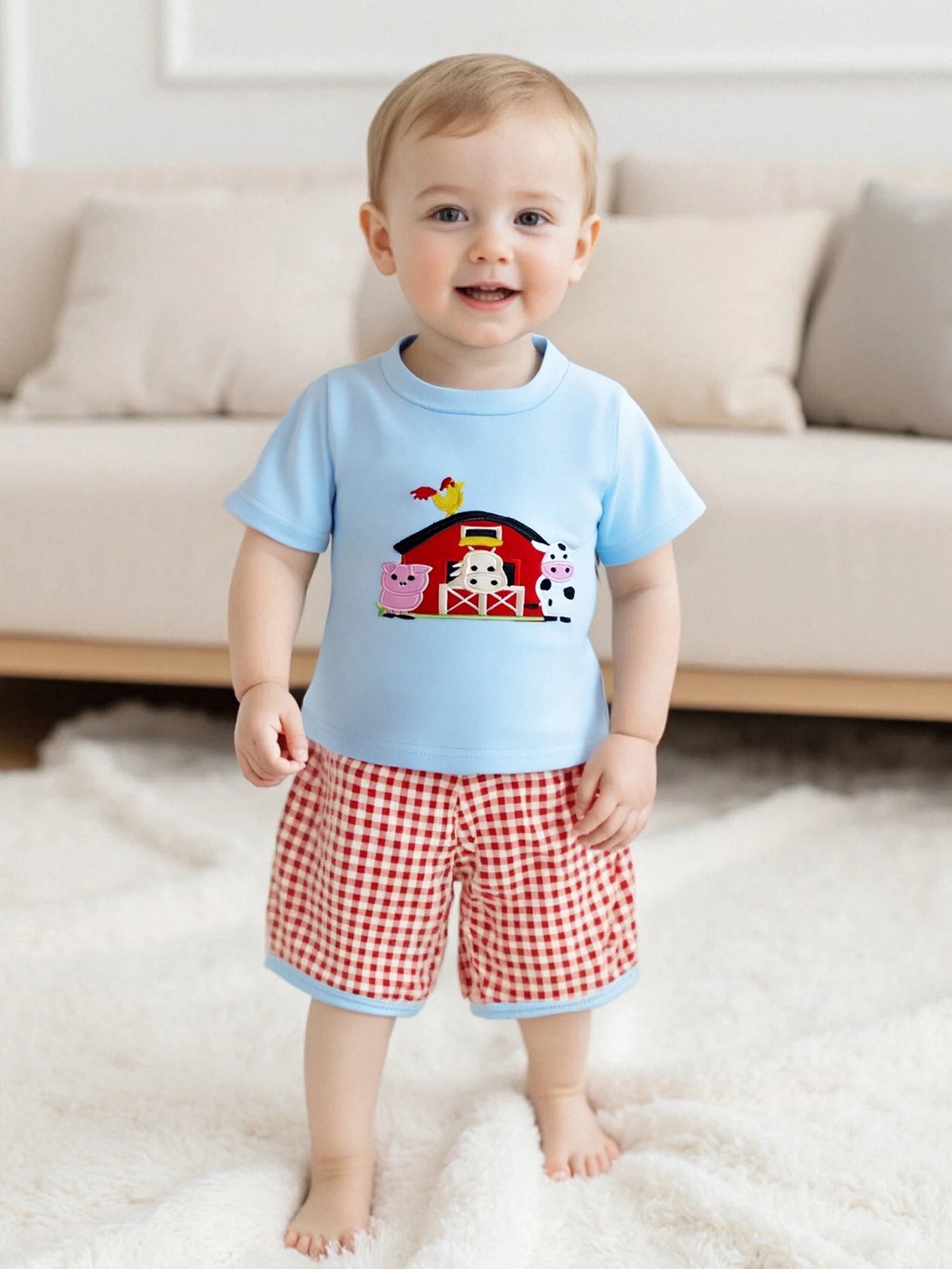 Keep your baby boy comfortable and stylish this summer with this charming two-piece set featuring delightful farm animal embroidery.