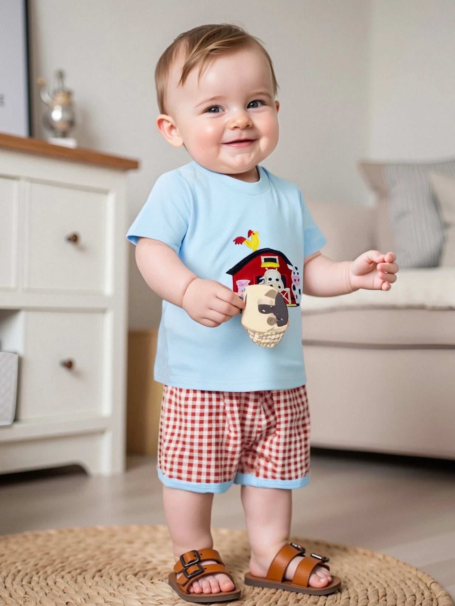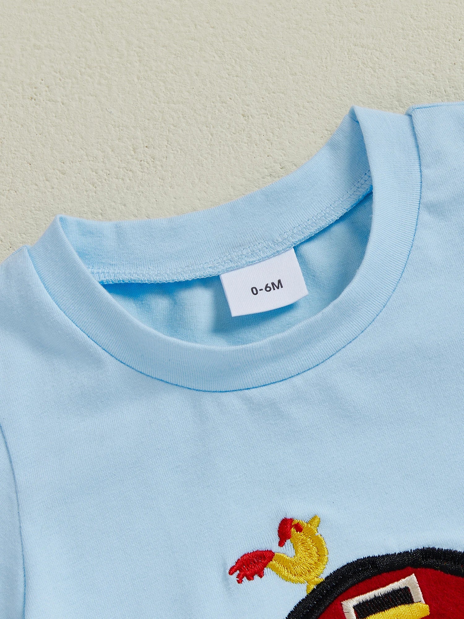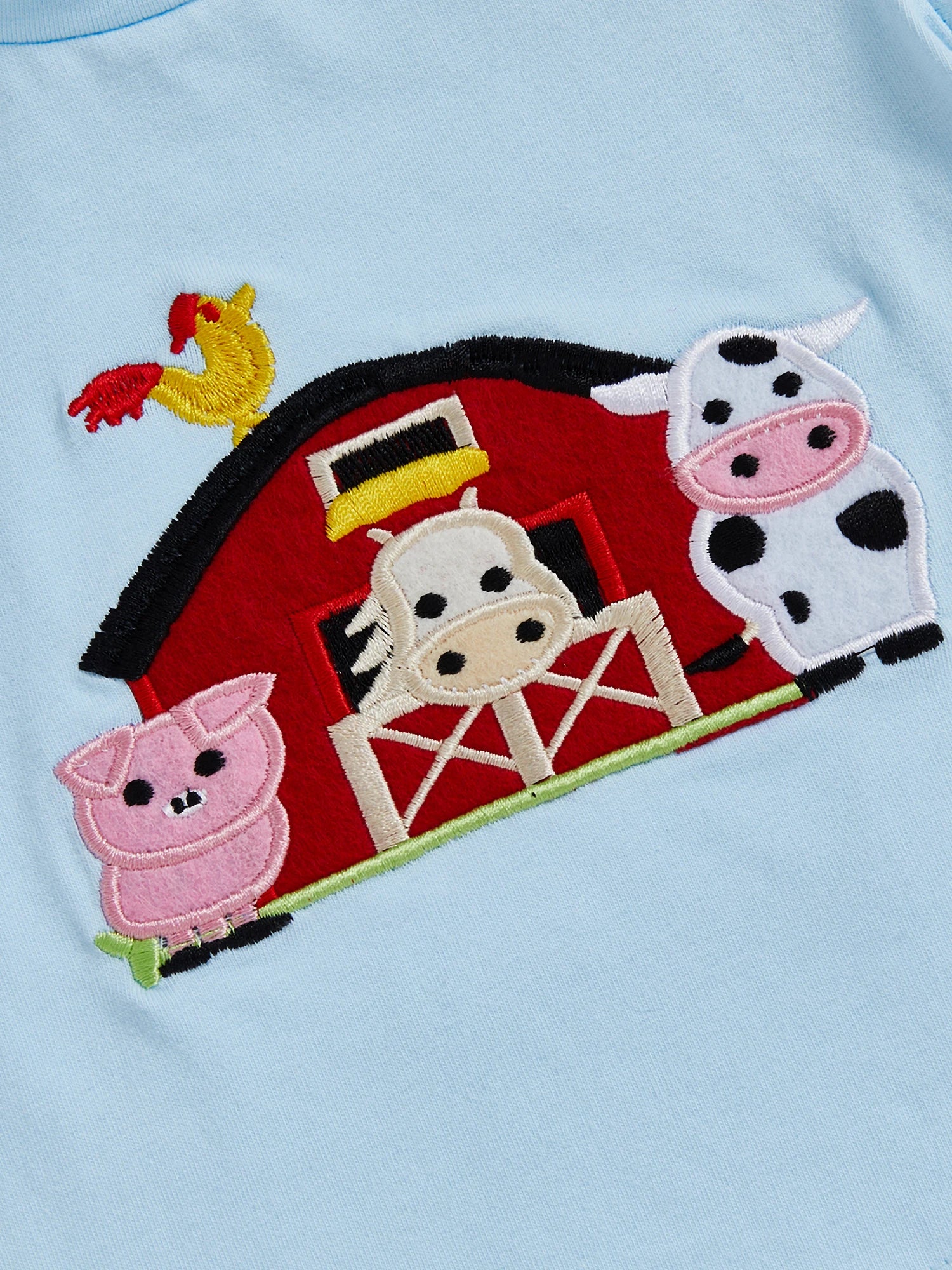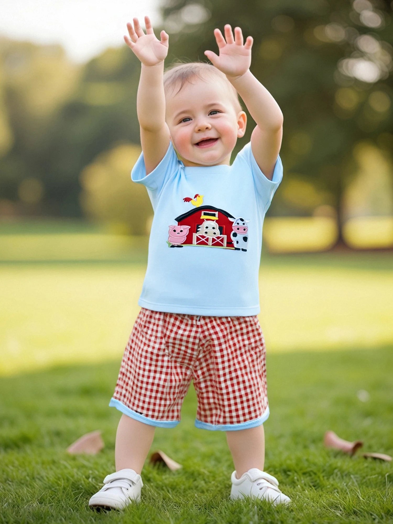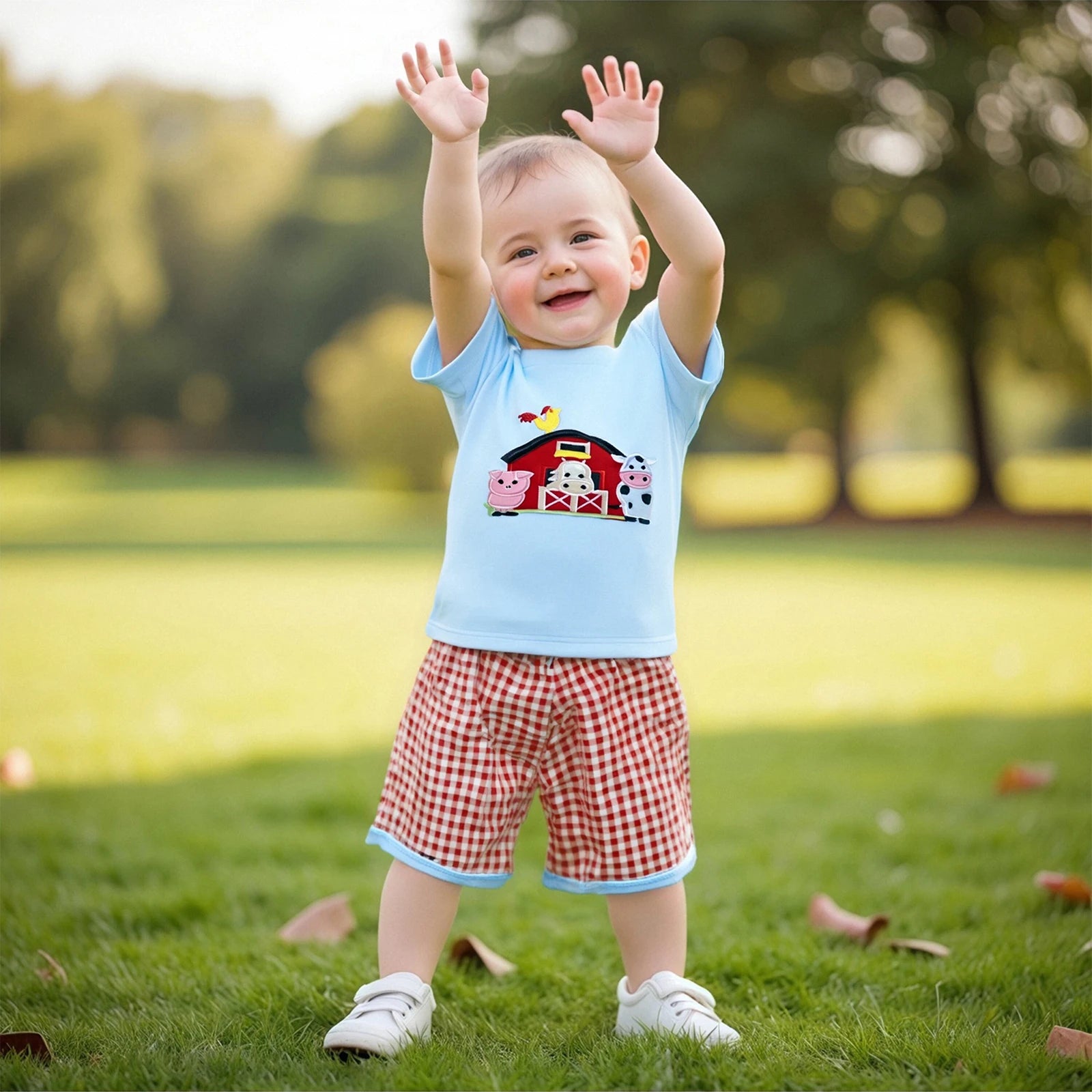 Keep your baby boy comfortable and stylish this summer with this charming two-piece set featuring delightful farm animal embroidery.