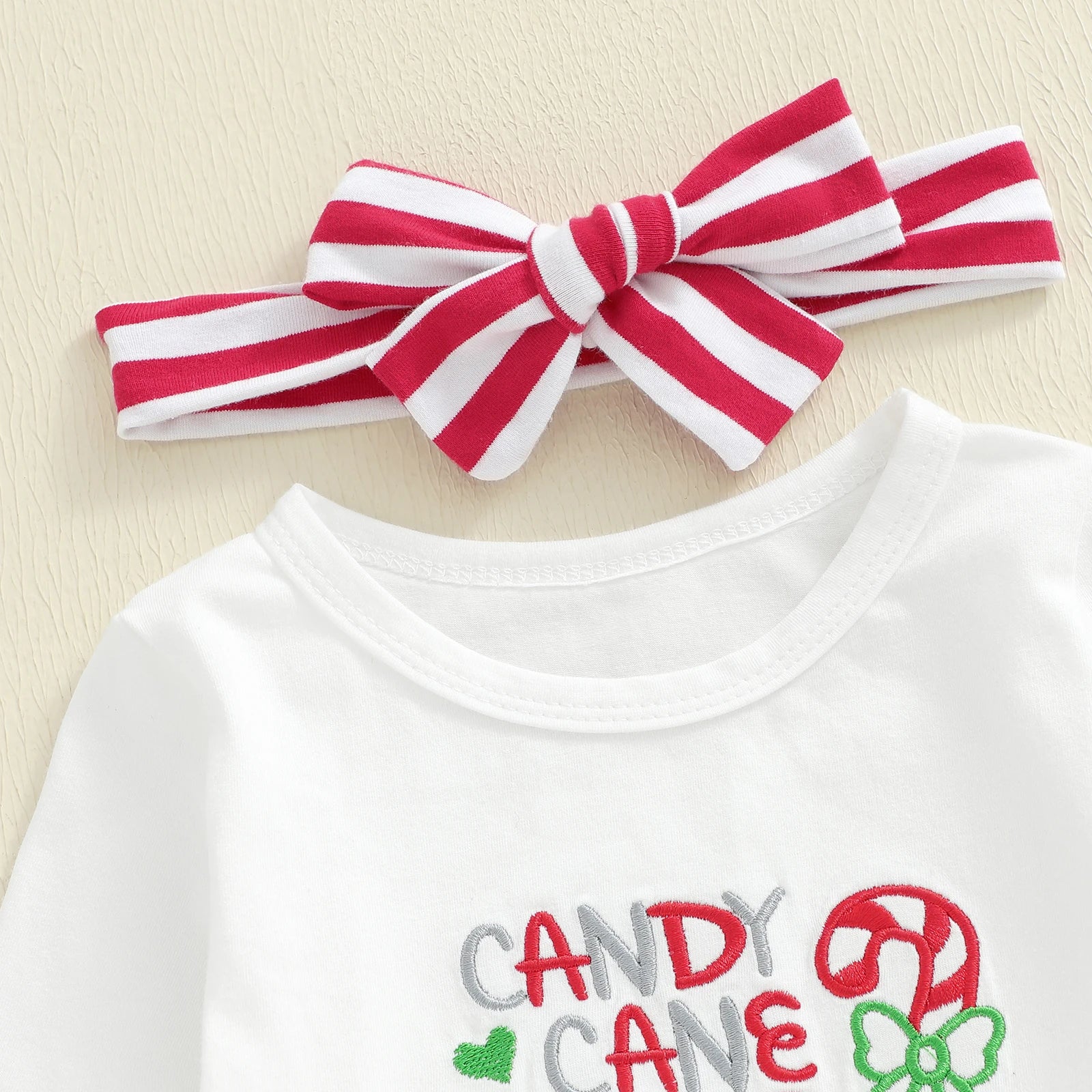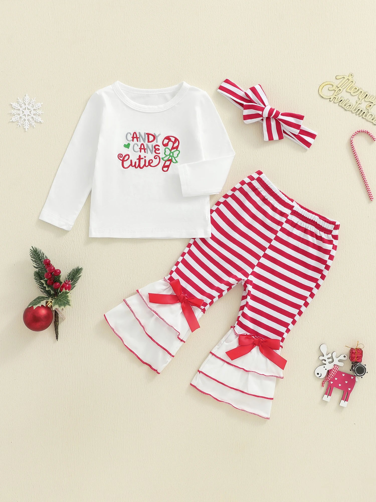 Baby Girls Christmas Outfit Set - Candy Cane Embroidery Long Sleeve Top, Flared Pants & Headband (0-3Y)