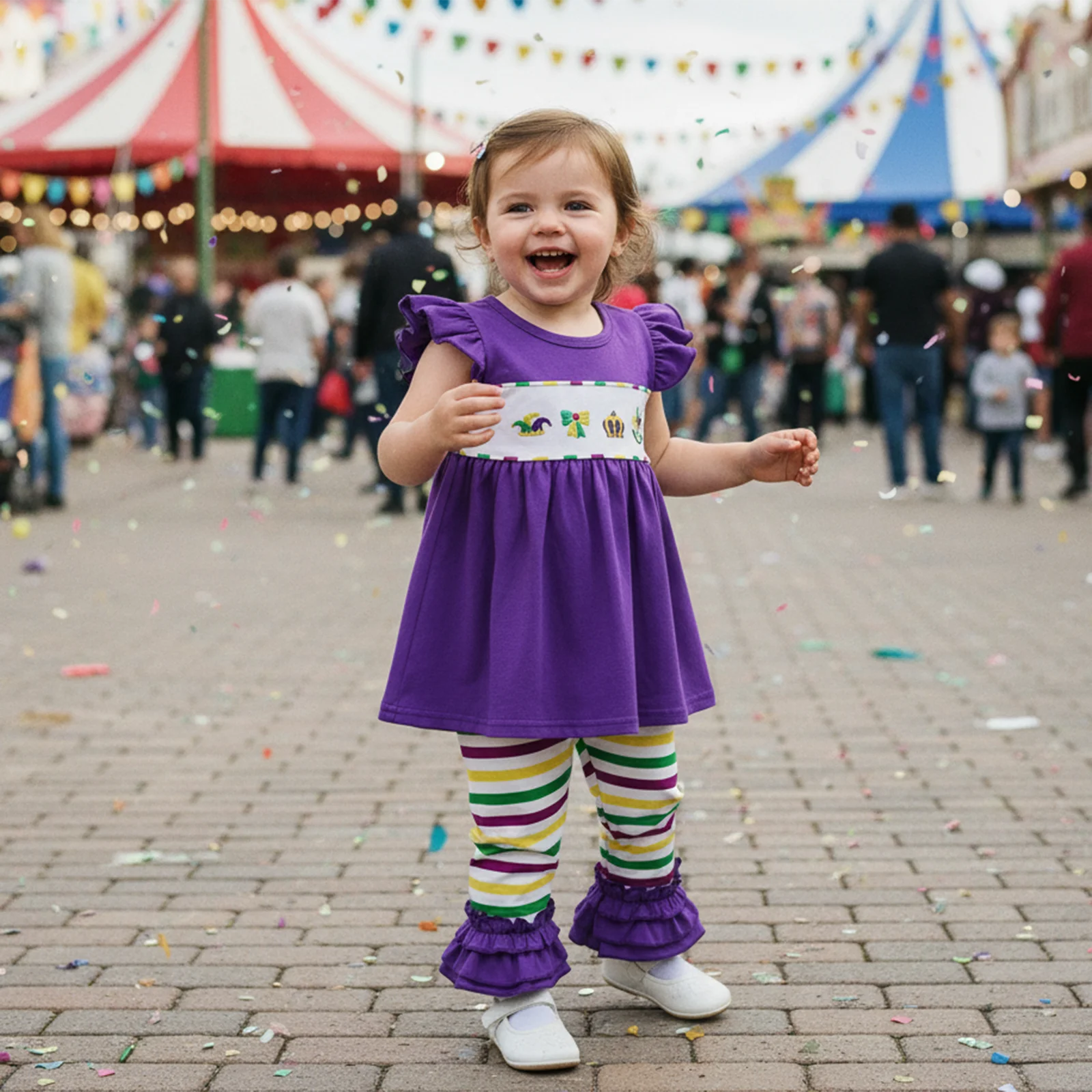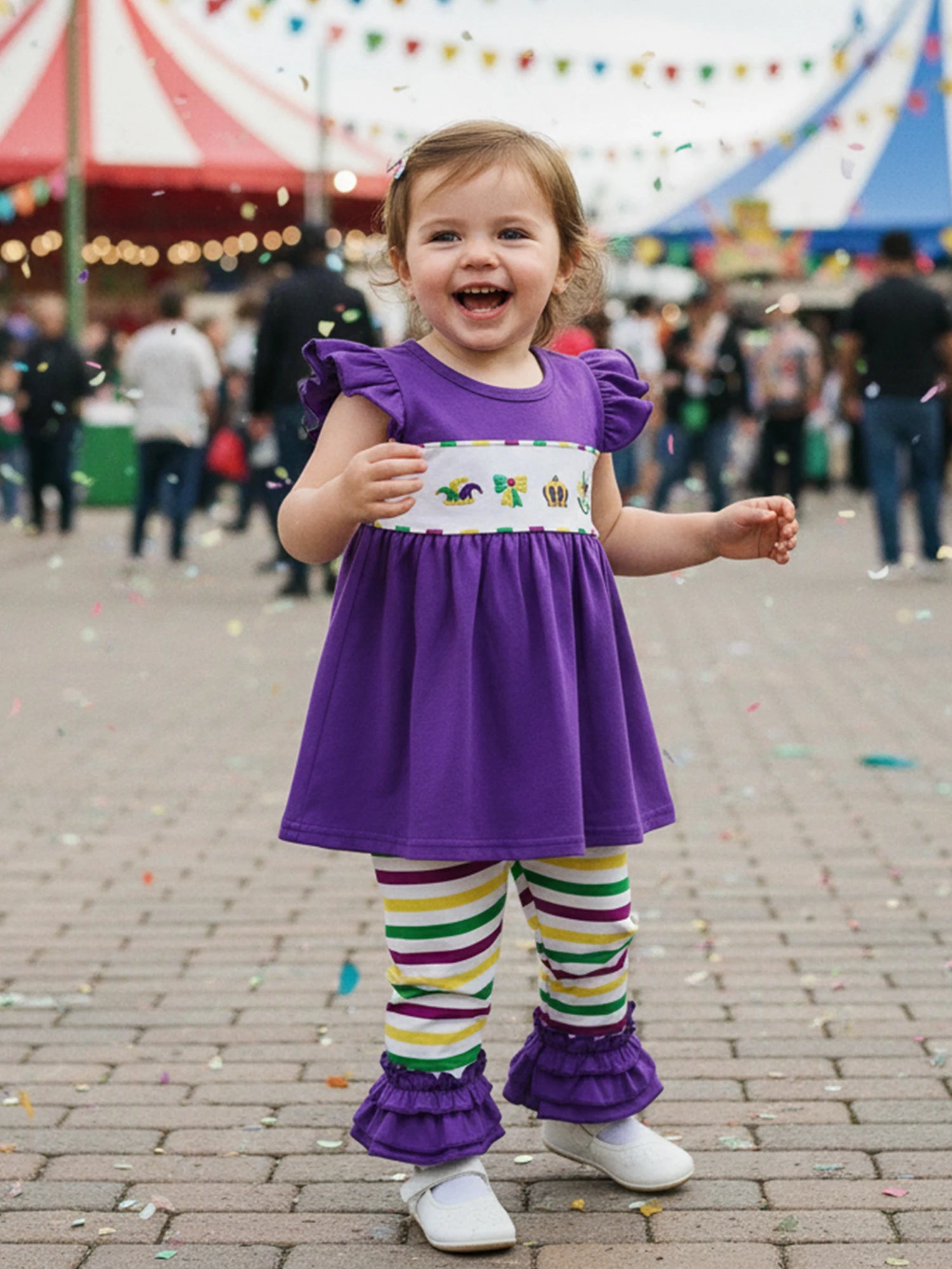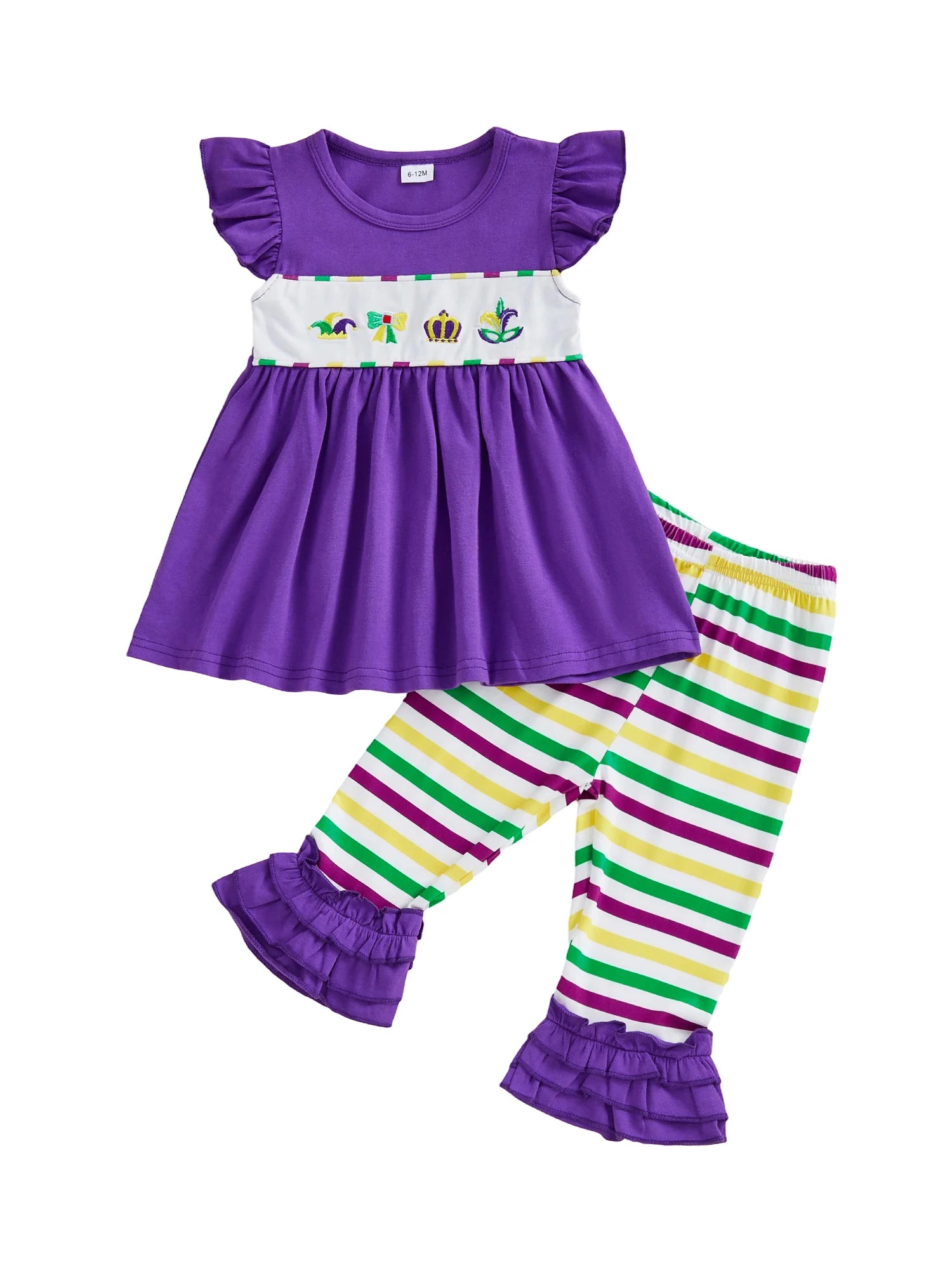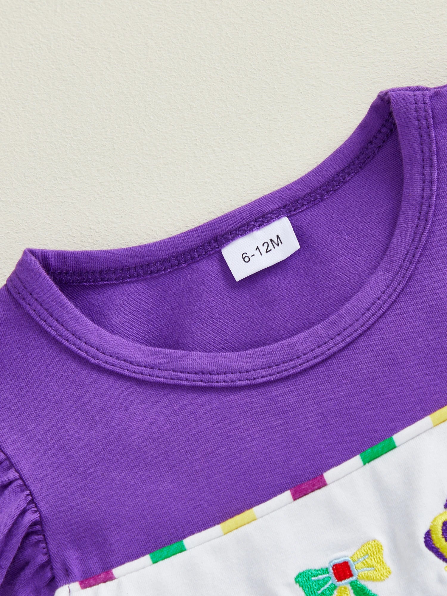 Dress your little one in this delightful two-piece spring outfit set featuring adorable ruffle sleeves and cartoon embroidered details. Perfect for the new season and special occasions.