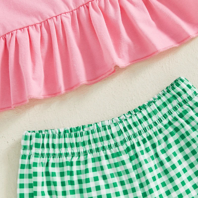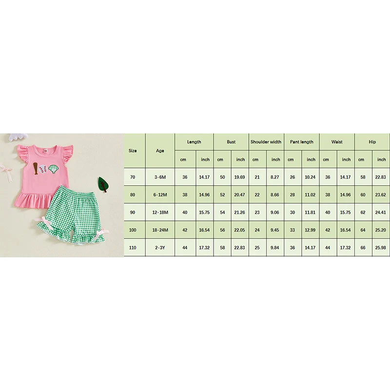 This charming two-piece summer set features a baseball embroidery ruffle fly sleeve t-shirt paired with comfortable elastic waist shorts. Perfect for active little ones aged 0-3 years.
