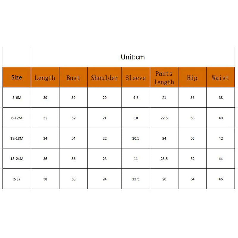 - 0-6M: Chest 42cm, T-shirt Length 30cm, Shorts Length 18cm