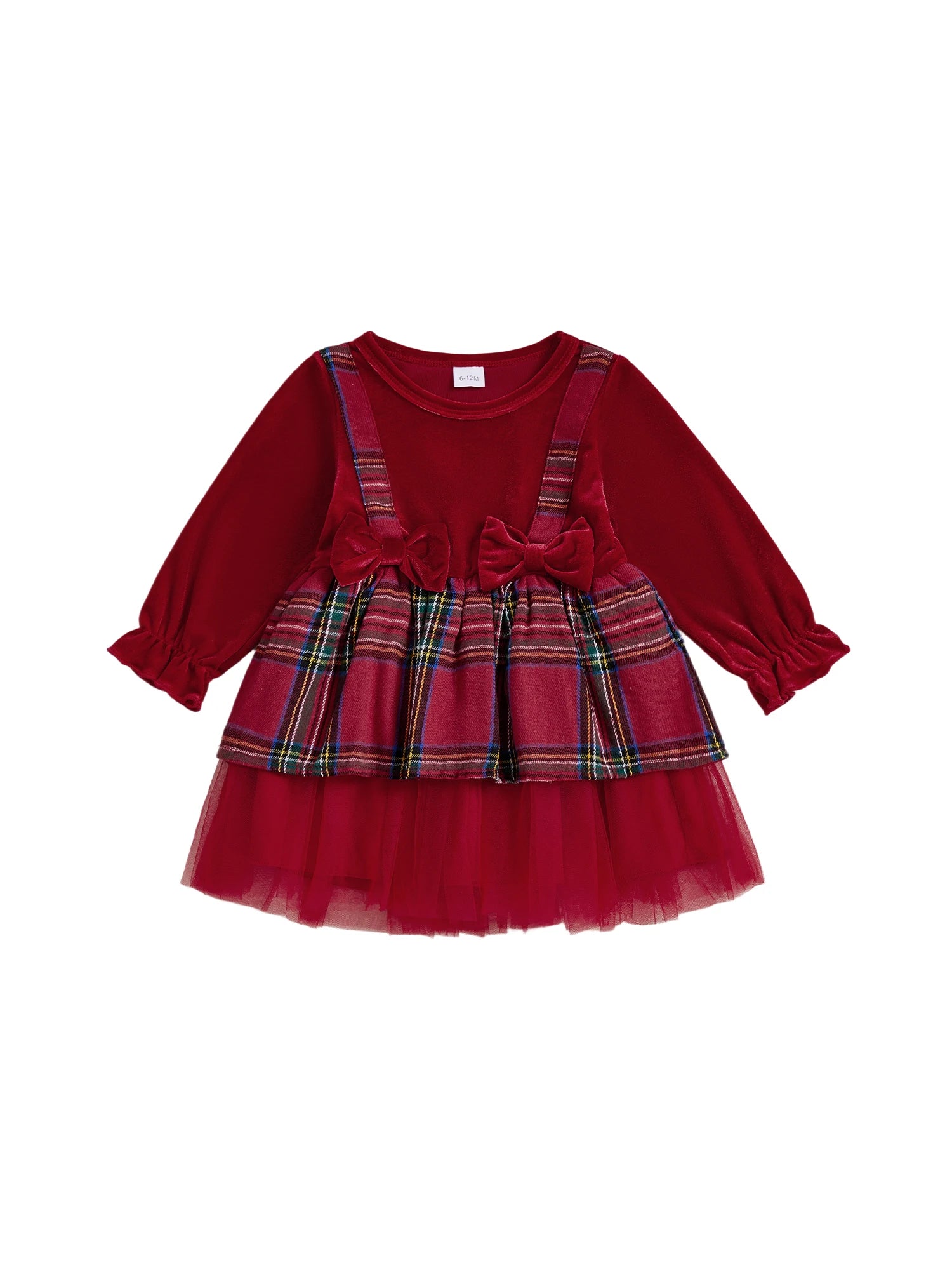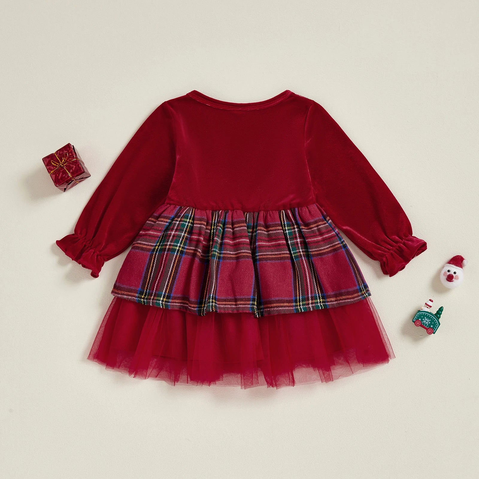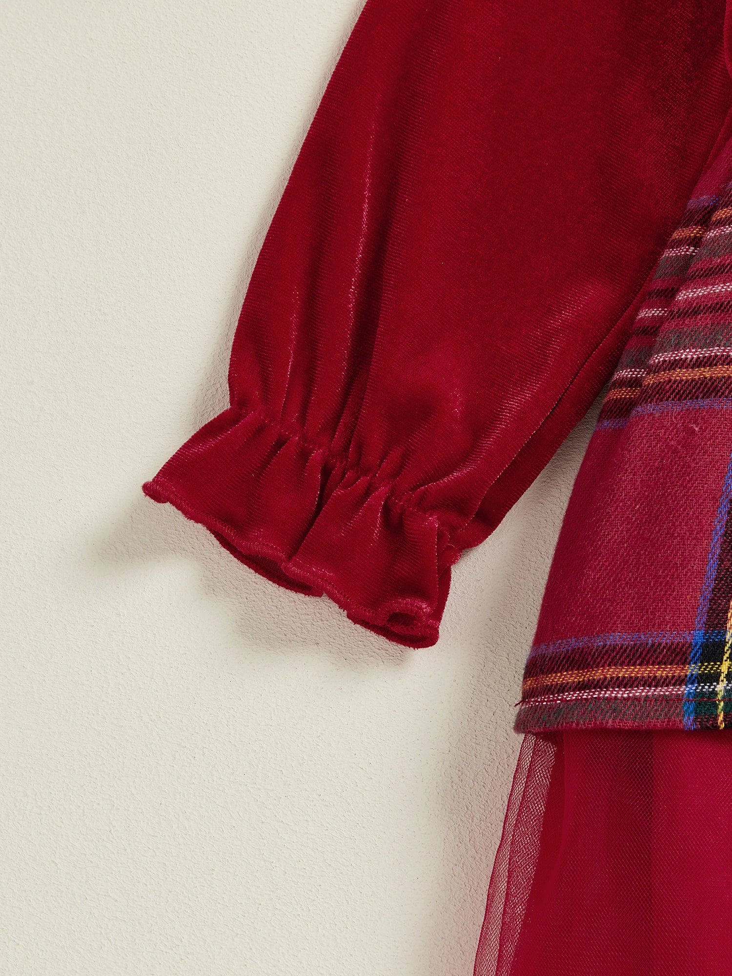 Make your little one the star of the festive season with this beautiful Christmas party dress! Featuring a classic plaid print, luxurious velvet fabric, and delicate tulle patchwork details, this long sleeve dress combines elegance with comfort for special holiday occasions.