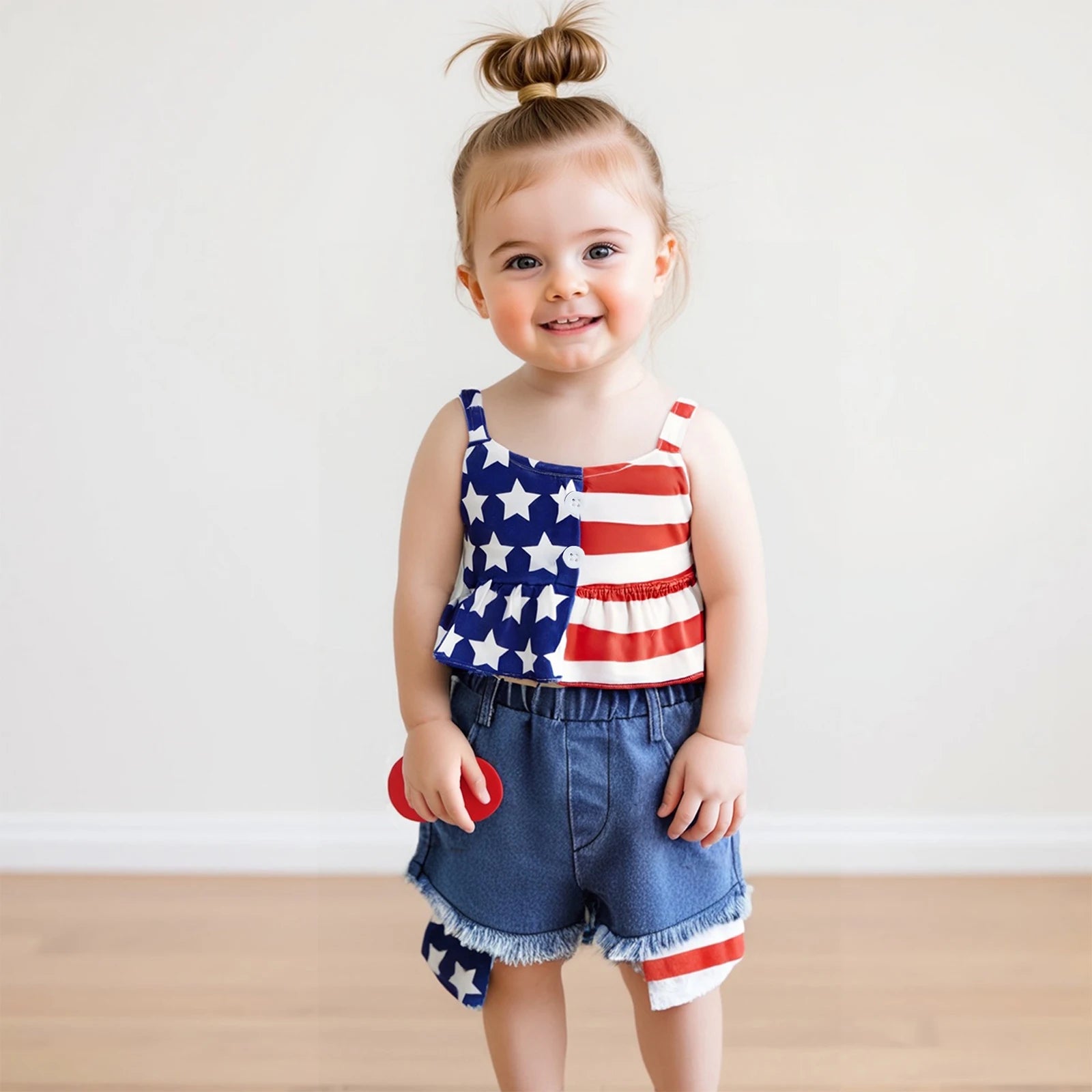 0-4Y Kids Girls American Flag Clothes Sets Star Stripe Print Camisole and Elastic Raw Denim Shorts