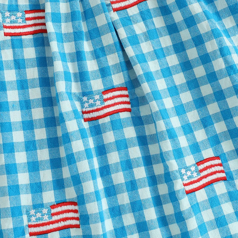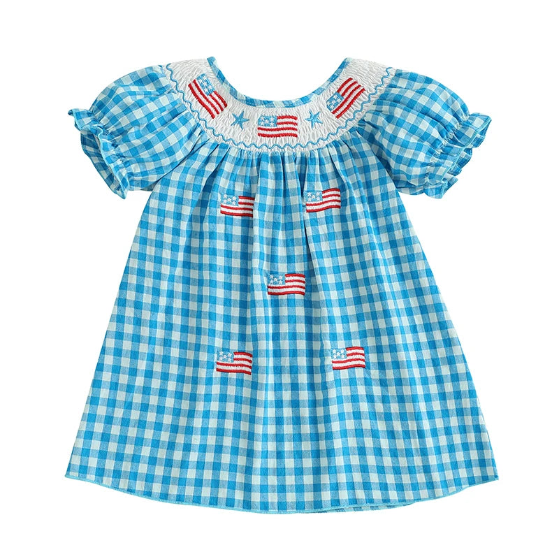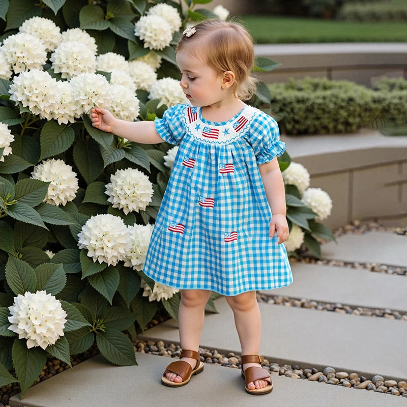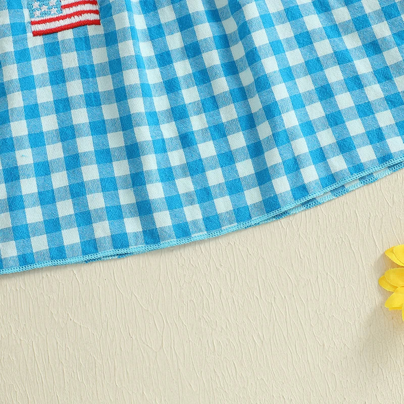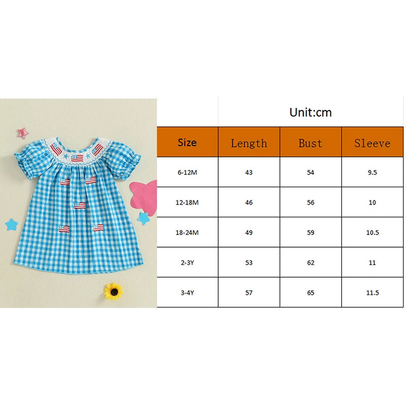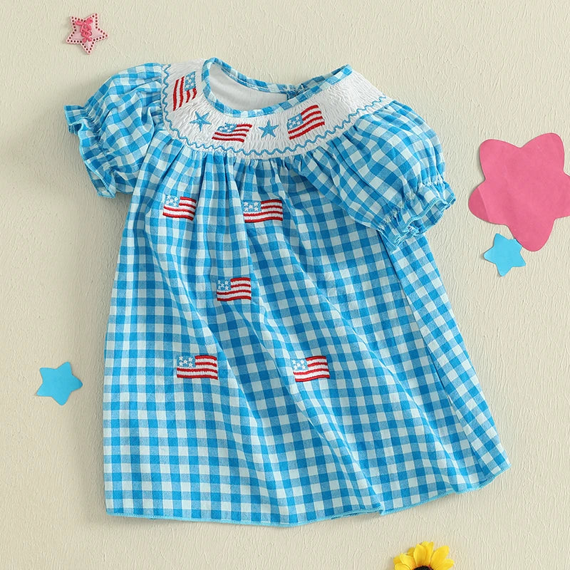 0-4Y Kids Girl’s Short Sleeve Embroidery Crew Neck Plaid Flags Print A-Line Dress